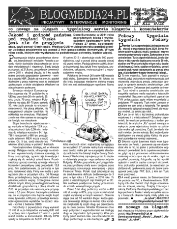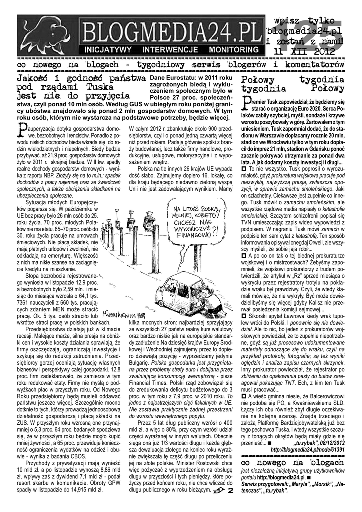 wpisz tylko blogmedia24.pl i zostañ z nami! 11 XII 2012 ========================================================================================== 125 co nowego na blogach - tygodniowy serwis blogerów i komentatorów ========================================================================================== Jakoœæ i godnoœæ pañstwa Dane Eurostatu: w 2011 roku Po³owy tygodnia zagrożonych biedą i wyklupod rz¹dami Tuska Po³owy czeniem społecznym było w tygodnia jest nie do przyjêcia Polsce 27 proc. społeczeństwa, czyli ponad 10 mln osób. Według GUS w ubiegłym roku poniżej granicy ubóstwa znajdowało się ponad 2 mln gospodarstw domowych. W tym roku osób, którym nie wystarcza na podstawowe potrzeby, będzie więcej. P auperyzacja dotyka gospodarstwa domowe, bezrobotnych i rencistów. Ponadto z powodu niskich dochodów bieda wkrada się do rodzin wielodzietnych i niepełnych. Biedy będzie przybywać, aż 21,9 proc. gospodarstw domowych żyło w 2011 r. skrajnej biedzie. W II kw. spadły realne dochody gospodarstw domowych - wynika z raportu NBP. Złożyły się na to m.in.: spadek dochodów z pracy najemnej oraz ze świadczeń społecznych, a także obciążenia składkami na ubezpieczenia społeczne. Sytuacja młodych Europejczyków pogarsza się. W październiku w UE bez pracy było 26 mln osób do 25. roku życia. 70 proc. młodych Polaków nie ma etatu. 65–70 proc. osób do 30. roku życia pracuje na umowach śmieciowych. Nie płacą składek, nie mają płatnych urlopów i zwolnień, nie odkładają na emeryturę. Większość z nich ma nikłe szanse na zaciągnięcie kredytu na mieszkanie. Stopa bezrobocia rejestrowanego wyniosła w listopadzie 12,9 proc. a bezrobotnych było 2,59 mln. i miesiąc do miesiąca wzrosła o 64,1 tys. 7361 nauczycieli z 660 tys. pracujących zdaniem MEN może stracić pracę. Ok. 5 tys. osób straciło lub wkrótce straci pracę w polskich bankach. Przedsiębiorstwa działają już w klimacie recesji. Malejące marże, silna presja na obniżki cen i wysokie koszty działania sprawiają, że firmy oszczędzają, ograniczają inwestycje i szykują się do redukcji zatrudnienia. Przedsiębiorcy gorzej oceniają sytuację własnych biznesów i perspektywy całej gospodarki. 12,8 proc. firm zadeklarowało, że zamierza w tym roku redukować etaty. Firmy nie myślą o podwyżkach płac w przyszłym roku. Od Nowego Roku przedsiębiorcy będą musieli oddawać państwu jeszcze więcej. Szczególnie mocno dotknie to tych, którzy prowadzą jednoosobową działalność gospodarczą i płacą składki na ZUS. W przyszłym roku wzrosną one przynajmniej o 5,3 proc. 64 proc. badanych spodziewa się, że w przyszłym roku będzie mogło kupić mniej żywności, a 65 proc. przewiduje konieczność ograniczenia wydatków na odzież i obuwie - wynika z badania CBOS. Przychody z prywatyzacji mają wynieść 10 mld zł. a po listopadzie wynoszą 8,86 mld zł, wpływy zaś z dywidend 7,1 mld zł - podał resort skarbu w komunikacie. Obroty GPW spadły w listopadzie do 14,915 mld zł. W całym 2012 r. zbankrutuje około 900 przedsiębiorstw, czyli o ponad jedną czwartą więcej niż przed rokiem. Padają głównie spółki z branży budowlanej, lecz także firmy handlowe, produkcyjne, usługowe, motoryzacyjne i z wyposażeniem wnętrz. Polska na tle innych 26 krajów UE wypada dość słabo. Zajmujemy dopiero 16. lokatę, co dla kraju będącego niedawno zieloną wyspą Unii nie jest zadowalającym wynikiem. Mamy kilka mocnych stron: najbardziej sprzyjający ze wszystkich 27 państw realny kurs walutowy oraz bardzo niskie jak na europejskie standardy zadłużenie.Na dziesięć krajów Europy Środkowej i Wschodniej zajmujemy przez to dopiero dziewiątą pozycję - wyprzedzamy jedynie Bułgarię. Polska gospodarka jest przygniatana przez problemy strefy euro i dobijana przez zwalniającą konsumpcję wewnętrzną - pisze Financial Times. Polski rząd zobowiązał się do zredukowania deficytu budżetowego do 3 proc. w tym roku z 7,9 proc. w 2010 roku. To jedno z najostrzejszych cięć fiskalnych w UE. Nie zostawia praktycznie żadnej przestrzeni do wzrostu wewnętrznego popytu. Przez 5 lat dług publiczny wzrósł o 400 mld zł, a więc o 80%, przy czym wzrósł udział części wyrażanej w innych walutach. Obecnie sięga ona już 1/3 wartości długu i każda głębsza dewaluacja złotego na koniec roku wyraźnie zwiększała tę część długu po przeliczeniu jej na złote polskie. Minister Rostowski chce więc pożyczać z wyprzedzeniem na obsługę długu w przyszłości i tych pieniędzy, które pożyczy przed końcem roku, nie chce wliczać do długu publicznego w roku bieżącym. 2 P remier Tusk zapowiedział, że będziemy się starać o organizację Euro 2020. Serca Polaków zabiły szybciej, myśli, sondaże i krzywe wzrostu poszybowały w górę. Żartowałem z tym uniesieniem. Tusk zapomniał dodać, że do stadionu w Warszawie dopłacamy rocznie 20 mln, stadion we Wrocławiu tylko w tym roku dopłacił do imprez 21 mln, stadion w Gdańsku ponoć zacznie pokrywać utrzymanie za ponad dwa lata. A jak dodamy koszty inwestycji i długi... To nie wszystko. Tusk poprosił o wyrozumiałość, gdyż prokuratura wojskowa pracuje pod niezwykłą, najwyższą presją, zwłaszcza opozycji, w sprawie zamachu smoleńskiego. Jaki on szlachetny. Ciekawsze jest zupełnie co innego. Tusk mówił o zamachu smoleńskim, ale wszystkie rządowe media napisały o katastrofie smoleńskiej. Szczytem schizofrenii popisał się TVN umieszczając zapis wideo wypowiedzi z podpisem. W nagraniu Tusk mówi zamach w podpisie ten sam cytat z katastrofą. Ten sposób informowania opisywał onegdaj Orwell, ale wszyscy myśleli, że sobie jaja robił... A po co on tak o tej biednej prokuraturze wojskowej i o mistrzostwach? Żebyśmy zapomnieli, że wojskowi prokuratorzy z trudem potwierdzili, że artykuł w „Rz” sprzed miesiąca o wykryciu przez rejestratory trotylu na p