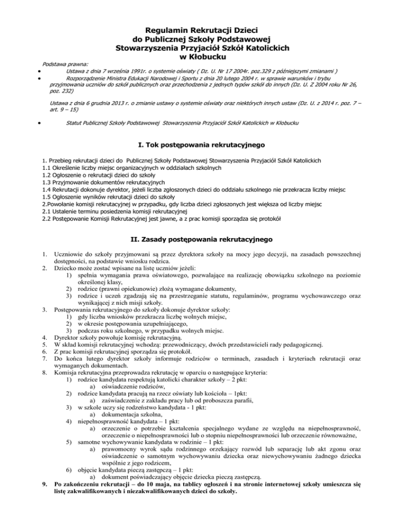 Regulamin Rekrutacji Dzieci do Publicznej Szkoły Podstawowej Stowarzyszenia Przyjaciół Szkół Katolickich w Kłobucku Podstawa prawna: Ustawa z dnia 7 września 1991r. o systemie oświaty ( Dz. U. Nr 17 2004r. poz.329 z późniejszymi zmianami ) Rozporządzenie Ministra Edukacji Narodowej i Sportu z dnia 20 lutego 2004 r. w sprawie warunków i trybu przyjmowania uczniów do szkół publicznych oraz przechodzenia z jednych typów szkół do innych (Dz. U. Z 2004 roku Nr 26, poz. 232) Ustawa z dnia 6 grudnia 2013 r. o zmianie ustawy o systemie oświaty oraz niektórych innych ustaw (Dz. U. z 2014 r. poz. 7 – art. 9 – 15) Statut Publicznej Szkoły Podstawowej Stowarzyszenia Przyjaciół Szkół Katolickich w Kłobucku I. Tok postępowania rekrutacyjnego 1. Przebieg rekrutacji dzieci do Publicznej Szkoły Podstawowej Stowarzyszenia Przyjaciół Szkół Katolickich 1.1 Określenie liczby miejsc organizacyjnych w oddziałach szkolnych 1.2 Ogłoszenie o rekrutacji dzieci do szkoły 1.3 Przyjmowanie dokumentów rekrutacyjnych 1.4 Rekrutacji dokonuje dyrektor, jeżeli liczba zgłoszonych dzieci do oddziału szkolnego nie przekracza liczby miejsc 1.5 Ogłoszenie wyników rekrutacji dzieci do szkoły 2.Powołanie komisji rekrutacyjnej w przypadku, gdy liczba dzieci zgłoszonych jest większa od liczby miejsc 2.1 Ustalenie terminu posiedzenia komisji rekrutacyjnej 2.2 Postępowanie Komisji Rekrutacyjnej jest jawne, a z prac komisji sporządza się protokół II. Zasady postępowania rekrutacyjnego 1. 2. 3. 4. 5. 6. 7. 8. 9. Uczniowie do szkoły przyjmowani są przez dyrektora szkoły na mocy jego decyzji, na zasadach powszechnej dostępności, na podstawie wniosku rodzica. Dziecko może zostać wpisane na listę uczniów jeżeli: 1) spełnia wymagania prawa oświatowego, pozwalające na realizację obowiązku szkolnego na poziomie określonej klasy, 2) rodzice (prawni opiekunowie) złożą wymagane dokumenty, 3) rodzice i uczeń zgadzają się na przestrzeganie statutu, regulaminów, programu wychowawczego oraz wynikającej z nich misji szkoły. Postępowania rekrutacyjnego do szkoły dokonuje dyrektor szkoły: 1) gdy liczba wniosków przekracza liczbę wolnych miejsc, 2) w okresie postępowania uzupełniającego, 3) podczas roku szkolnego, w przypadku wolnych miejsc. Dyrektor szkoły powołuje komisję rekrutacyjną. W skład komisji rekrutacyjnej wchodzą: przewodniczący, dwóch przedstawicieli rady pedagogicznej. Z prac komisji rekrutacyjnej sporządza się protokół. Do końca lutego dyrektor szkoły informuje rodziców o terminach, zasadach i kryteriach rekrutacji oraz wymaganych dokumentach. Komisja rekrutacyjna przeprowadza rekrutację w oparciu o następujące kryteria: 1) rodzice kandydata respektują katolicki charakter szkoły – 2 pkt: a) oświadczenie rodziców, 2) rodzice kandydata pracują na rzecz oświaty lub kościoła – 1pkt: a) zaświadczenie z zakładu pracy lub od proboszcza parafii, 3) w szkole uczy się rodzeństwo kandydata - 1 pkt: a) dokumentacja szkolna, 4) niepełnosprawność kandydata – 1 pkt: a) orzeczenie o potrzebie kształcenia specjalnego wydane ze względu na niepełnosprawność, orzeczenie o niepełnosprawności lub o stopniu niepełnosprawności lub orzeczenie równoważne, 5) samotne wychowywanie kandydata w rodzinie – 1 pkt: a) prawomocny wyrok sądu rodzinnego orzekający rozwód lub separację lub akt zgonu oraz oświadczenie o samotnym wychowywaniu dziecka oraz niewychowywaniu żadnego dziecka wspólnie z jego rodzicem, 6) objęcie kandydata pieczą zastępczą – 1 pkt: a) dokument poświadczający objęcie dziecka pieczą zastępczą. Po zakończeniu rekrutacji – do 10 maja, na tablicy ogłoszeń i na stronie internetowej szkoły umieszcza się listę zakwalifikowanych i niezakwalifikowanych dzieci do szkoły. 10. Do 16 maja rodzice potwierdzają wolę przyjęcia dziecka do szkoły składając deklarację. 11. Do 20 maja na tablicy ogłoszeń i na stronie internetowej szkoły umieszcza się listę przyjętych i nieprzyjętych dzieci do szkoły. 12. Jeżeli w okresie rekrutacji nie zostaną zapełnione wszystkie wolne miejsca dyrektor szkoły przeprowadza postępowanie uzupełniające na tych samych zasadach, jak w postępowaniu rekrutacyjnym, które powinno zakończyć się do końca sierpnia. 13. Niekompletne wnioski o przyjęcie do szkoły nie są rozpatrywane. 14. W razie potrzeby komisja może przyjąć dodatkowe kryteria. 15. Procedura odwoławcza: 1) 7 dni od opublikowania listy - wniosek do komisji rekrutacyjnej o sporządzenie uzasadnienia odmowy przyjęcia, 2) 5 dni od dnia wystąpienia z wnioskiem - komisja sporządza uzasadnienie, które zawiera: przyczyny odmowy przyjęcia w tym najniższą liczbę punktów, którą uzyskał kandydat; 3) 7 dni od otrzymania uzasadnienia - odwołanie do dyrektora od rozstrzygnięcia komisji rekrutacyjnej, 4) 7 dni od otrzymania odwołania - dyrektor rozpatruje odwołanie. Na rozstrzygnięcie dyrektora służy skarga do sądu administracyjnego. III. Dokumenty dotyczące rekrutacji 1. Dokumenty składane do szkoły przez rodziców uczniów przyjmowanych do klasy pierwszej to: 1. Podanie o przyjęcie do szkoły 2. Kwestionariusz osobowy 2. Do klasy programowo wyższej w sześcioletniej szkole podstawowej przyjmuje się ucznia na podstawie złożenia w szkole dokumentów: I etap: dokumenty przed podjęciem decyzji o przyjęciu ucznia do szkoły: 1. 2. 3. 4. 5. 6. 7. 8. Podania o przyjęcie ucznia do naszej szkoły. Warunkiem niezbędnym jest podanie przyczyny przeniesienia ucznia do naszej szkoły Kwestionariusza osobowego podpisanego przez opiekunów prawnych dziecka Świadectwa ukończenia klasy niższej w szkole publicznej lub szkole niepublicznej o uprawnieniach szkoły publicznej tego samego typu oraz odpisu arkusza ocen wydanego przez szkołę, z której uczeń odszedł, Pozytywnych wyników egzaminów klasyfikacyjnych, przeprowadzonych na zasadach określonych w przepisach dotyczących 