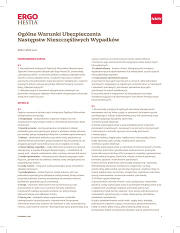 Ogólne Warunki Ubezpieczenia Następstw Nieszczęśliwych Wypadków KOD: C-NNW-01/11 POSTANOWIENIA OGÓLNE §1 1. Na podstawie niniejszych Ogólnych Warunków Ubezpieczenia Sopockie Towarzystwo Ubezpieczeń Ergo Hestia SA, zwane dalej „Ubezpieczycielem”, w zakresie działania swego przedsiębiorstwa, zawiera umowy ubezpieczenia z osobami fizycznymi, osobami prawnymi oraz jednostkami organizacyjnymi niebędącymi osobami prawnymi, którym ustawa przyznaje zdolność prawną, zwanymi dalej „Ubezpieczającymi”. 2. Ubezpieczonym w umowach ubezpieczenia zawartych na podstawie niniejszych Ogólnych Warunków Ubezpieczenia może być wyłącznie osoba fizyczna. użyciu przemocy oraz skierowane przeciw społeczeństwu z zamiarem jego zastraszenia dla osiągnięcia celów politycznych lub społecznych, 10) udział własny - kwota, o którą Ubezpieczyciel zmniejsza wypłacane łączne odszkodowanie lub świadczenie z tytułu zajścia nieszczęśliwego wypadku, 11) wyczynowe uprawianie sportu: a) uprawianie dyscyplin sportowych w ramach sekcji lub klubów sportowych, polegające na regularnym uczestniczeniu w treningach i zawodach sportowych, jak również uprawianie dyscyplin sportowych w celach zarobkowych, b) uczestniczenie w wyprawach lub ekspedycjach do miejsc charakteryzujących się ekstremalnymi warunkami klimatycznymi lub przyrodniczymi. DEFINICJE §2 Pojęcia używane w dalszej części niniejszych Ogólnych Warunków Ubezpieczenia oznaczają: 1) ekspedycja - zorganizowana wyprawa mająca na celu zrealizowanie wytyczonych zadań o charakterze sportowym bądź naukowym, 2) koszty leczenia - koszty poniesione na badania i zabiegi ambulatoryjne oraz operacyjne, pobyt w placówce służby zdrowia, jak również zakup niezbędnych lekarstw i środków opatrunkowych, 3) lokaut - zamknięcie zakładu przez właściciela, połączone ze zwalnianiem pracowników, przeprowadzane dla zmuszenia ich do przyjęcia gorszych warunków pracy lub ze względu na strajk, 4) nieszczęśliwy wypadek - nagłe zdarzenie wywołane przyczyną zewnętrzną, w wyniku którego Ubezpieczający – niezależnie od swojej woli – doznał uszkodzenia ciała, rozstroju zdrowia lub zmarł, 5) osoba uprawniona - wskazana przez Ubezpieczającego osoba fizyczna, uprawniona do odbioru należnej sumy ubezpieczenia na wypadek jego śmierci, 6) osoby trzecie - wszystkie osoby pozostające poza stosunkiem ubezpieczeniowym, 7) przedsiębiorca - osoba fizyczna, osoba prawna lub inna jednostka organizacyjna niebędąca osobą prawną, której ustawa przyznaje zdolność prawną, prowadząca we własnym imieniu działalność gospodarczą lub zawodową, 8) strajk - zbiorowe, dobrowolne wstrzymanie pracy przez pracowników na jakiś czas w jednym lub kilku zakładach, instytucjach, będące wyrazem protestu, np. politycznego, ekonomicznego oraz żądaniem zmian, 9) terroryzm - nielegalne akcje organizowane z pobudek ideologicznych lub politycznych, indywidualne lub grupowe, skierowane przeciwko osobom lub obiektom w celu wprowadzenia chaosu, zastraszenia ludności i dezorganizacji życia publicznego przy OS/OW041/1101 §3 1. Na potrzeby niniejszych ogólnych warunków ubezpieczenia wprowadza się trzy klasy ryzyka, w zależności od stopnia ryzyka wynikającego z rodzaju wykonywanej pracy lub uprawianej przez Ubezpieczającego dyscypliny sportowej: 1) I klasa ryzyka obejmuje: a) osoby wykonujące pracę w przeważającej części w biurach, placówkach oświatowych, naukowych, leczniczych, artystycznych i kulturalnych, rzemiośle ręcznym oraz osoby duchowne i niepracujące, b) tenis stołowy, kręglarstwo, wędkarstwo, kulturystykę, bilard, brydż sportowy, golf, szachy, modelarstwo sportowe, 2) II klasa ryzyka obejmuje: a) osoby wykonujące pracę w rzemiośle zmechanizowanym, handlu, rolnictwie, leśnictwie, rybołówstwie, budownictwie, przemyśle (poza zaliczonymi do klasy III), transporcie, żegludze, gazownictwie, służbie weterynaryjnej, lotnictwie, wojsku, strażach pożarnych, trenerów, sędziów i instruktorów sportowych, b) tenis ziemny, badminton, gimnastykę artystyczną i sportową, lekkoatletykę, pływanie, wioślarstwo, żeglarstwo, surfing, windsurfing, piłkę wodną, łyżwiarstwo figurowe i szybkie, hokej na trawie, kajakarstwo, łucznictwo, strzelectwo, myślistwo, kolarstwo, sporty motorowodne, narciarstwo wodne, szermierkę, 3) III klasa ryzyka obejmuje: a) pracowników ochrony mienia i osób, policjantów, ratowników górskich, osoby wykonujące pracę w przemyśle energetycznym przy urządzeniach wysokiego napięcia, przemyśle górniczym i kopalniczym pod ziemią, saperów i inne osoby zatrudnione przy materiałach wybuchowych, nurków, oblatywaczy samolotów, akrobatów, kaskaderów, b) judo, dalekowschodnie sztuki walki, rugby, boks, bobsleje, podnoszenie ciężarów, zapasy, narciarstwo, płetwonurkowanie, hokej na lodzie, piłkę nożną, piłkę siatkową, piłkę ręczną, koszykówkę, futbol amerykański, baseball, sporty spadochronowe 1 i balonowe, sporty lotnicze, saneczkarstwo, sporty motorowe, jeździectwo, alpinizm i taternictwo. 2. W przypadkach nie wymienionych powyżej klasę ryzyka ustala się według rodzajów zatrudnienia lub dyscyplin sportowych wymienionych w ust. 1 pkt 1) - 3), najbardziej odpowiadających stopniowi ryzyka wynikającemu z rodzaju wykonywanej pracy lub dyscypliny sportowej uprawianej przez Ubezpieczającego. RODZAJE ŚWIADCZEŃ PRZEDMIOT I ZAKRES UBEZPIECZENIA §6 1. W wariancie I Ubezpieczyciel wypłaca następujące rodzaje świadczeń: 1) w przypadku śmierci w wyniku nieszczęśliwego wypadku, jeżeli nastąpiła ona w okresie do 2 lat od daty jego wystąpienia - 100% określonej w umowie sumy ubezpieczenia, 2) z tytułu trwałego uszczerbku na zdrowiu: a) w przypadku uszczerbku w wysokości 100% - pełną sumę ubezpieczenia określoną w umowie, b) w przypadku uszczerbku częściowego - procent sumy ubezpieczenia odpowiadający procentowi trwałego 
