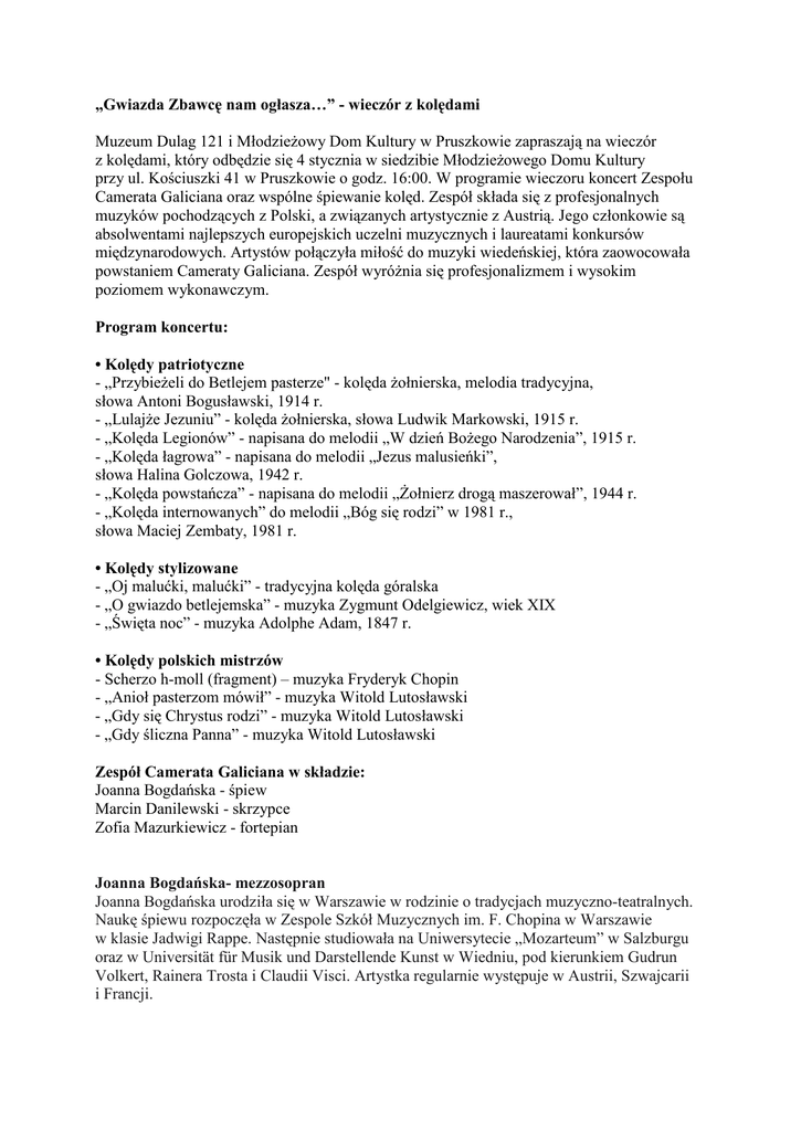 „Gwiazda Zbawcę nam ogłasza…” - wieczór z kolędami Muzeum Dulag 121 i Młodzieżowy Dom Kultury w Pruszkowie zapraszają na wieczór z kolędami, który odbędzie się 4 stycznia w siedzibie Młodzieżowego Domu Kultury przy ul. Kościuszki 41 w Pruszkowie o godz. 16:00. W programie wieczoru koncert Zespołu Camerata Galiciana oraz wspólne śpiewanie kolęd. Zespół składa się z profesjonalnych muzyków pochodzących z Polski, a związanych artystycznie z Austrią. Jego członkowie są absolwentami najlepszych europejskich uczelni muzycznych i laureatami konkursów międzynarodowych. Artystów połączyła miłość do muzyki wiedeńskiej, która zaowocowała powstaniem Cameraty Galiciana. Zespół wyróżnia się profesjonalizmem i wysokim poziomem wykonawczym. Program koncertu: • Kolędy patriotyczne - „Przybieżeli do Betlejem pasterze" - kolęda żołnierska, melodia tradycyjna, słowa Antoni Bogusławski, 1914 r. - „Lulajże Jezuniu” - kolęda żołnierska, słowa Ludwik Markowski, 1915 r. - „Kolęda Legionów” - napisana do melodii „W dzień Bożego Narodzenia”, 1915 r. - „Kolęda łagrowa” - napisana do melodii „Jezus malusieńki”, słowa Halina Golczowa, 1942 r. - „Kolęda powstańcza” - napisana do melodii „Żołnierz drogą maszerował”, 1944 r. - „Kolęda internowanych” do melodii „Bóg się rodzi” w 1981 r., słowa Maciej Zembaty, 1981 r. • Kolędy stylizowane - „Oj malućki, malućki” - tradycyjna kolęda góralska - „O gwiazdo betlejemska” - muzyka Zygmunt Odelgiewicz, wiek XIX - „Święta noc” - muzyka Adolphe Adam, 1847 r. • Kolędy polskich mistrzów - Scherzo h-moll (fragment) – muzyka Fryderyk Chopin - „Anioł pasterzom mówił” - muzyka Witold Lutosławski - „Gdy się Chrystus rodzi” - muzyka Witold Lutosławski - „Gdy śliczna Panna” - muzyka Witold Lutosławski Zespół Camerata Galiciana w składzie: Joanna Bogdańska - śpiew Marcin Danilewski - skrzypce Zofia Mazurkiewicz - fortepian Joanna Bogdańska- mezzosopran Joanna Bogdańska urodziła się w Warszawie w rodzinie o tradycjach muzyczno-teatralnych. Naukę śpiewu rozpoczęła w Zespole Szkół Muzycznych im. F. Chopina w Warszawie w klasie Jadwigi Rappe. Następnie studiowała na Uniwersytecie „Mozarteum” w Salzburgu oraz w Universität für Musik und Darstellende Kunst w Wiedniu, pod kierunkiem Gudrun Volkert, Rainera Trosta i Claudii Visci. Artystka regularnie występuje w Austrii, Szwajcarii i Francji. Marcin Danilewski - skrzypce Marcin Danilewski urodził się w Warszawie w rodzinie o tradycjach muzycznych. Już w wieku czterech lat rozpoczął naukę gry na skrzypcach. Ukończył studia muzyczne w Warszawie pod kierunkiem prof. Krzysztofa Jakowicza i w słynnym „Mozarteum” w Salzburgu w klasie prof. Igora Ozima. Koncertował jako solista i kameralista we wszystkich krajach Europy. Jest koncertmistrzem Cameraty Pontresina (Szwajcaria) i Filharmonii Wrocławskiej. Zofia Mazurkiewicz - fortepian Zofia Mazurkiewicz jest absolwentką Akademii Muzycznej we Wrocławiu oraz Royal Conservatoire of Scotland. Należy do Akademii Operowej przy Teatrze Wielkim - Operze Narodowej. Jest laureatką I nagrody na Ogólnopolskim Konkursie Kameralistyki Fortepianowej w Częstochowie. Współpracuje z solistami, zespołami operowymi oraz chórami w kraju i za granicą.