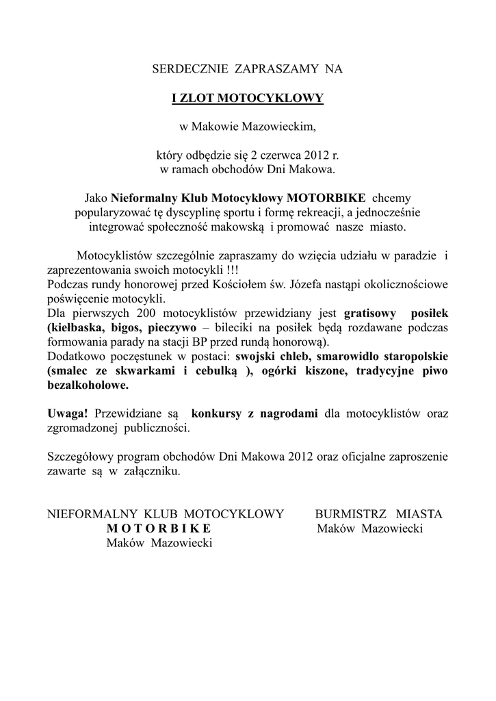 SERDECZNIE ZAPRASZAMY NA I ZLOT MOTOCYKLOWY w Makowie Mazowieckim, który odbędzie się 2 czerwca 2012 r. w ramach obchodów Dni Makowa. Jako Nieformalny Klub Motocyklowy MOTORBIKE chcemy popularyzować tę dyscyplinę sportu i formę rekreacji, a jednocześnie integrować społeczność makowską i promować nasze miasto. Motocyklistów szczególnie zapraszamy do wzięcia udziału w paradzie i zaprezentowania swoich motocykli !!! Podczas rundy honorowej przed Kościołem św. Józefa nastąpi okolicznościowe poświęcenie motocykli. Dla pierwszych 200 motocyklistów przewidziany jest gratisowy posiłek (kiełbaska, bigos, pieczywo – bileciki na posiłek będą rozdawane podczas formowania parady na stacji BP przed rundą honorową). Dodatkowo poczęstunek w postaci: swojski chleb, smarowidło staropolskie (smalec ze skwarkami i cebulką ), ogórki kiszone, tradycyjne piwo bezalkoholowe. Uwaga! Przewidziane są konkursy z nagrodami dla motocyklistów oraz zgromadzonej publiczności. Szczegółowy program obchodów Dni Makowa 2012 oraz oficjalne zaproszenie zawarte są w załączniku. NIEFORMALNY KLUB MOTOCYKLOWY MOTORBIKE Maków Mazowiecki BURMISTRZ MIASTA Maków Mazowiecki