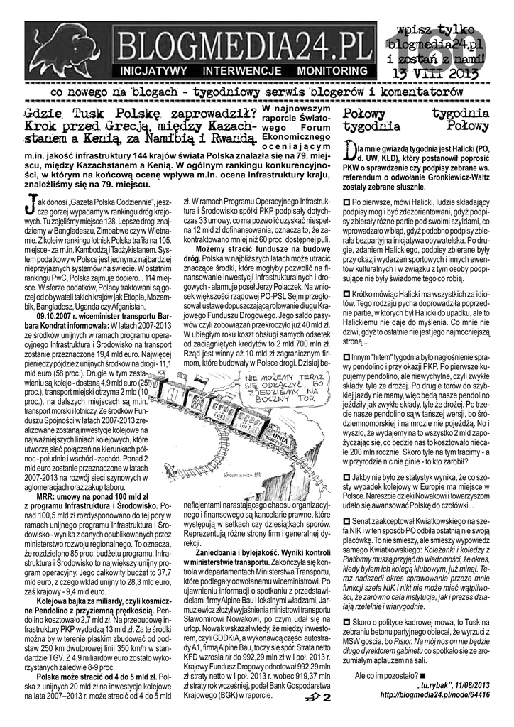 wpisz tylko blogmedia24.pl i zostañ z nami! 13 VIII 2013 ========================================================================================== 160 co nowego na blogach - tygodniowy serwis blogerów i komentatorów ========================================================================================== W najnowszym tygodnia Gdzie Tusk Polskê zaprowadzi³? raporcie Świato- Po³owy Po³owy Krok przed Grecj¹, miêdzy Kazach- wego Forum tygodnia Ekonomicznego stanem a Keni¹, za Namibi¹ i Rwand¹. oceniającym m.in. jakość infrastruktury 144 krajów świata Polska znalazła się na 79. miejscu, między Kazachstanem a Kenią. W ogólnym rankingu konkurencyjności, w którym na końcową ocenę wpływa m.in. ocena infrastruktury kraju, znaleźliśmy się na 79. miejscu. J ak donosi „Gazeta Polska Codziennie”, jeszcze gorzej wypadamy w rankingu dróg krajowych. Tu zajęliśmy miejsce 128. Lepsze drogi znajdziemy w Bangladeszu, Zimbabwe czy w Wietnamie. Z kolei w rankingu lotnisk Polska trafiła na 105. miejsce - za m.in. Kambodżą i Tadżykistanem. System podatkowy w Polsce jest jednym z najbardziej nieprzyjaznych systemów na świecie. W ostatnim rankingu PwC, Polska zajmuje dopiero... 114 miejsce. W sferze podatków, Polacy traktowani są gorzej od obywateli takich krajów jak Etiopia, Mozambik, Bangladesz, Uganda czy Afganistan. 09.10.2007 r. wiceminister transportu Barbara Kondrat informowała: W latach 2007-2013 ze środków unijnych w ramach programu operacyjnego Infrastruktura i Środowisko na transport zostanie przeznaczone 19,4 mld euro. Najwięcej pieniędzy pójdzie z unijnych środków na drogi - 11,1 mld euro (58 proc.). Drugie w tym zestawieniu są koleje - dostaną 4,9 mld euro (25 proc.), transport miejski otrzyma 2 mld (10 proc.), na dalszych miejscach są m.in. transport morski i lotniczy. Ze środków Funduszu Spójności w latach 2007-2013 zrealizowane zostaną inwestycje kolejowe na najważniejszych liniach kolejowych, które utworzą sieć połączeń na kierunkach północ - południe i wschód - zachód. Ponad 2 mld euro zostanie przeznaczone w latach 2007-2013 na rozwój sieci szynowych w aglomeracjach oraz zakup taboru. MRR: umowy na ponad 100 mld zł z programu Infrastruktura i Środowisko. Ponad 100,5 mld zł rozdysponowano do tej pory w ramach unijnego programu Infrastruktura i Środowisko - wynika z danych opublikowanych przez ministerstwo rozwoju regionalnego. To oznacza, że rozdzielono 85 proc. budżetu programu. Infrastruktura i Środowisko to największy unijny program operacyjny. Jego całkowity budżet to 37,7 mld euro, z czego wkład unijny to 28,3 mld euro, zaś krajowy - 9,4 mld euro. Kolejowa bajka za miliardy, czyli kosmiczne Pendolino z przyziemną prędkością. Pendolino kosztowało 2,7 mld zł. Na przebudowę infrastruktury PKP wydadzą 13 mld zł. Za te środki można by w terenie płaskim zbudować od podstaw 250 km dwutorowej linii 350 km/h w standardzie TGV. Z 4,9 miliardów euro zostało wykorzystanych zaledwie 8-9 proc. Polska może stracić od 4 do 5 mld zł. Polska z unijnych 20 mld zł na inwestycje kolejowe na lata 2007–2013 r. może stracić od 4 do 5 mld zł. W ramach Programu Operacyjnego Infrastruktura i Środowisko spółki PKP podpisały dotychczas 33 umowy, co ma pozwolić uzyskać niespełna 12 mld zł dofinansowania, oznacza to, że zakontraktowano mniej niż 60 proc. dostępnej puli. Możemy stracić fundusze na budowę dróg. Polska w najbliższych latach może utracić znaczące środki, które mogłyby pozwolić na finansowanie inwestycji infrastrukturalnych i drogowych - alarmuje poseł Jerzy Polaczek. Na wniosek większości rządowej PO-PSL Sejm przegłosował ustawę dopuszczającą rolowanie długu Krajowego Funduszu Drogowego. Jego saldo pasywów czyli zobowiązań przekroczyło już 40 mld zł. W ubiegłym roku koszt obsługi samych odsetek od zaciągniętych kredytów to 2 mld 700 mln zł. Rząd jest winny aż 10 mld zł zagranicznym firmom, które budowały w Polsce drogi. Dzisiaj be- neficjentami narastającego chaosu organizacyjnego i finansowego są kancelarie prawne, które występują w setkach czy dziesiątkach sporów. Reprezentują różne strony firm i generalnej dyrekcji. Zaniedbania i bylejakość. Wyniki kontroli w ministerstwie transportu. Zakończyła się kontrola w departamentach Ministerstwa Transportu, które podlegały odwołanemu wiceministrowi. Po ujawnieniu informacji o spotkaniu z przedstawicielami firmy Alpine Bau i lokalnymi władzami, Jarmuziewicz złożył wyjaśnienia ministrowi transportu Sławomirowi Nowakowi, po czym udał się na urlop. Nowak wskazał wtedy, że między inwestorem, czyli GDDKiA, a wykonawcą części autostrady A1, firmą Alpine Bau, toczy się spór. Strata netto KFD wzrosła r/r do 992,29 mln zł w I poł. 2013 r. Krajowy Fundusz Drogowy odnotował 992,29 mln zł straty netto w I poł. 2013 r. wobec 919,37 mln zł straty rok wcześniej, podał Bank Gospodarstwa Krajowego (BGK) w raporcie. 2 D la mnie gwiazdą tygodnia jest Halicki (PO, d. UW, KLD), który postanowił poprosić PKW o sprawdzenie czy podpisy zebrane ws. referendum o odwołanie Gronkiewicz-Waltz zostały zebrane słusznie. Po pierwsze, mówi Halicki, ludzie składający podpisy mogli być zdezorientowani, gdyż podpisy zbierały różne partie pod swoimi szyldami, co wprowadzało w błąd, gdyż podobno podpisy zbierała bezpartyjna inicjatywa obywatelska. Po drugie, zdaniem Halickiego, podpisy zbierane były przy okazji wydarzeń sportowych i innych ewentów kulturalnych i w związku z tym osoby podpisujące nie były świadome tego co robią. Krótko mówiąc Halicki ma wszystkich za idiotów. Tego rodzaju pycha doprowadziła poprzednie partie, w których był Halicki do upadku, ale to Halickiemu nie daje do myślenia. Co mnie nie dziwi, gdyż to ostatnie nie jest jego najmocniejszą stroną... Innym "hitem" tygodnia było nagłośnienie sprawy pendolino i przy okazji PKP. Po pierws