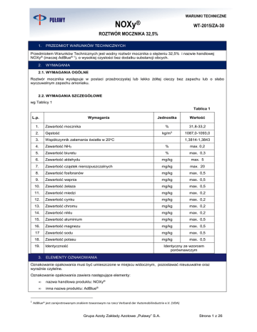 WARUNKI TECHNICZNE NOXy® WT-2015/ZA-30 ROZTWÓR MOCZNIKA 32,5% 1. PRZEDMIOT WARUNKÓW TECHNICZNYCH Przedmiotem Warunków Technicznych jest wodny roztwór mocznika o stężeniu 32,5% i nazwie handlowej NOXy® (inaczej AdBlue® 1), o wysokiej czystości bez dodatku substancji obcych. 2. WYMAGANIA 2.1. WYMAGANIA OGÓLNE Roztwór mocznika występuje w postaci przeźroczystej lub lekko żółtej cieczy bez zapachu lub o słabo wyczuwalnym zapachu amoniaku. 2.2. WYMAGANIA SZCZEGÓŁOWE wg Tablicy 1 Tablica 1 L.p. 1. 2. Wymagania Jednostka Wartość % 31,8-33,2 kg/m3 1087,0-1093,0 Zawartość mocznika Gęstość 20oC 3. Współczynnik załamania światła w 4. Zawartość NH3 % max. 0,2 5. Zawartość biuretu % max. 0,3 6. Zawartość aldehydu mg/kg max. 5 7. Zawartość cząstek nierozpuszczalnych mg/kg max. 20 8. Zawartość fosforanów mg/kg max. 0,5 9. Zawartość wapnia mg/kg max. 0,5 10. Zawartość żelaza mg/kg max. 0,5 11. Zawartość miedzi mg/kg max. 0,2 12. Zawartość cynku mg/kg max. 0,2 13. Zawartość chromu mg/kg max. 0,2 14. Zawartość niklu mg/kg max. 0,2 15. Zawartość aluminium mg/kg max. 0,5 16. Zawartość magnezu mg/kg max. 0,5 17 Zawartość sodu mg/kg max. 0,5 18. Zawartość potasu mg/kg max. 0,5 19. Identyczność 3. 1,3814-1,3843 Identyczny ze wzorcem porównawczym ELEMENTY OZNAKOWANIA Oznakowanie opakowania musi być umieszczone w miejscu widocznym, pozostawać nieusuwalne oraz wyraźnie czytelne. Oznakowanie opakowania zawiera następujące elementy: 1 • nazwa handlowa produktu: NOXy® • inna nazwa produktu: AdBlue® AdBlue® jest zarejestrowanym znakiem towarowym na rzecz Verband der Automobilindustrie e.V. (VDA) Grupa Azoty Zakłady Azotowe „Puławy” S.A. Strona 1 z 26 WARUNKI TECHNICZNE NOXy® WT-2015/ZA-30 ROZTWÓR MOCZNIKA 32,5% • nazwę, adres, nr telefonu i logo producenta • informacje o objętości netto produktu • napis określający zgodność wyrobu z normą ISO o brzmieniu: AUS 32 ISO 22241 • instrukcje stosowania, przechowywania i transportu • numer partii • datę ważności • znaki manipulacyjne: „Chronić przed wilgocią”, „Chronić przed nagrzaniem (ciepłem)”, „Przestrzegać zakresu temperatury”, oraz „Góra, nie przewracać”. 4. PAKOWANIE Roztwór mocznika 32,5% jest ładowany do: • cystern samochodowych i kolejowych • jednotonowych zbiorników z tworzyw sztucznych (IBC). Zbiorniki powinny być wykonane z materiałów dopuszczonych przez normę ISO 22241-1/-2/-3/-4 do kontaktu z NOXy®. Zalecane materiały dla opakowań/zbiorników: polietylen, polipropylen, izobutylen, fluoroetylen, Vinton, stale stopowe Nieodpowiednie materiały dla opakowań/zbiorników: miedź, stopy zawierające miedź, stale niestopowe i ocynkowane. Dodatkowe zalecenia: • przed załadunkiem zbiorniki i pojemniki mające kontakt z innymi substancjami wypłukać wodą zdemineralizowaną • unikać zanieczyszczenia produktu 5. PRZECHOWYWANIE Roztwór mocznika 32,5% można przechowywać w zbiornikach bezciśnieniowych lub pojemnikach o dowolnej pojemności. Magazynować w chłodnych, suchych i dobrze wentylowanych pomieszczeniach, w zakresie temperatur: -11,5 ÷ 30oC. Zbiorniki powinny być chronione przed nasłonecznieniem oraz zabezpieczone przed oziębieniem produktu poniżej -11,5oC (możliwość krystalizacji). Nieprzestrzeganie powyższych zasad może spowodować zmiany jakości produktu. Maksymalna temperatura roztworu mocznika 32,5% nie może przekraczać 35oC, ponieważ przedłużone utrzymywanie w temperaturze powyżej 35oC spowoduje pojawienie się samoczynnej reakcji hydrolizy z ciągłym wydzielaniem się amoniaku. 6. TRANSPORT Techniczny roztwór mocznika 32,5% transportuje się w cysternach kolejowych, autocysternach lub opakowaniach jednostkowych. W celu uniknięcia zanieczyszczeń niezbędne jest zastosowanie najwyższych standardów podczas transportu. Produkt nie podlega przepisom RID i ADR. 7. BADANIA 7.1. PROGRAM BADAŃ wg Tablicy 2. Tablica 2 L.p. Rodzaj badań Opis badania 1. Wymagania ogólne 7.4. 2. Zawartość mocznika 7.5. 3. Gęstość 4. Współczynnik załamania światła w 7.6. 20oC Grupa Azoty Zakłady Azotowe „Puławy” S.A. 7.5. Strona 2 z 26 WARUNKI TECHNICZNE NOXy® WT-2015/ZA-30 ROZTWÓR MOCZNIKA 32,5% 5. Zawartość NH3 7.7. 6. Zawartość biuretu 7.8. 7. Zawartość aldehydu 7.9. 8. Zawartość cząstek nierozpuszczalnych 7.10 9. Zawartość fosforanów 7.11 10. Zawartość wapnia 11. Zawartość żelaza 12. Zawartość miedzi 13. Zawartość cynku 14. Zawartość chromu 15. Zawartość niklu 16. Zawartość aluminium 17 Zawartość magnezu 18. Zawartość sodu 19. Zawartość potasu 20. Identyczność 7.12. 7.13 7.2. WIELKOŚĆ PARTII Przy wyprowadzaniu produktu do transportu i przyjmowaniu produktu wszystkie partie muszą zostać sprawdzone zgodnie z procedurami. Partia oznacza dobrze zdefiniowaną i możliwą do oznaczenia ilość. Partia nie powinna zawierać więcej niż 300 t roztworu mocznika. 7.3. POBÓR PRÓBEK Butelki do poboru próbek Powinny być stosowane butelki z szeroką szyjką o pojemności 1000 ml. Odpowiednie materiały to polietylen HD, polipropylen HD, polifluoroetylen, fluorek poliwinilidenu i perfluoropropylowinyloeteru (PFA), kopolimer tetrafluoroetylenu. Do poboru próbek w przypadku sporu powinny być stosowane butelki z PFA. Przed pierwszym użyciem butelki powinny zostać umyte, a następnie przepłukane wodą dejonizowaną po czym napełnione 32,5% roztworem. Etykiety Każdą butelkę do poboru próbek należy oznakować za pomocą etykiety (o wymiarach około 10 x 5cm) lub przywieszki. Etykiety i ich opis muszą być odporne na wodę i 32,5% roztwór mocznika. Sposób poboru próbek Otworzyć butelkę z szeroką szyjką, a jej pokrywkę położyć otworem do dołu na czystej powierzchni. Po przepłukaniu przewodu do poboru próbek, butelkę napełnić całkowicie 32,5% roztworem mocznika ze zbiornika. Następnie butelkę opróżnić, ponownie napełnić w/w r