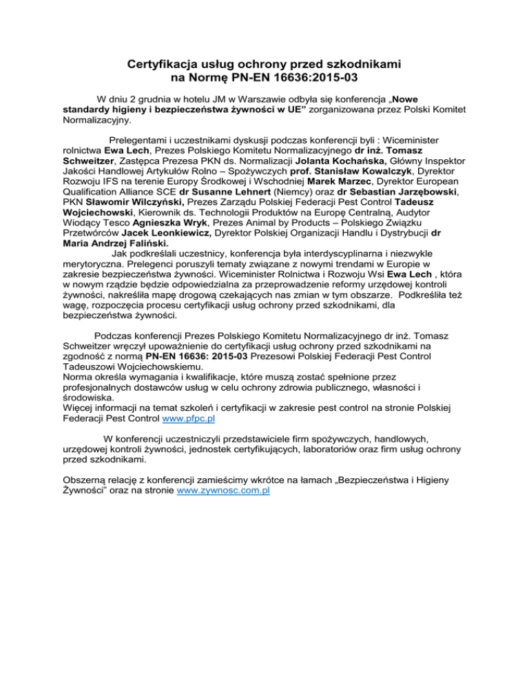Certyfikacja usług ochrony przed szkodnikami na Normę PN-EN 16636:2015-03 W dniu 2 grudnia w hotelu JM w Warszawie odbyła się konferencja „Nowe standardy higieny i bezpieczeństwa żywności w UE” zorganizowana przez Polski Komitet Normalizacyjny. Prelegentami i uczestnikami dyskusji podczas konferencji byli : Wiceminister rolnictwa Ewa Lech, Prezes Polskiego Komitetu Normalizacyjnego dr inż. Tomasz Schweitzer, Zastępca Prezesa PKN ds. Normalizacji Jolanta Kochańska, Główny Inspektor Jakości Handlowej Artykułów Rolno – Spożywczych prof. Stanisław Kowalczyk, Dyrektor Rozwoju IFS na terenie Europy Środkowej i Wschodniej Marek Marzec, Dyrektor European Qualification Alliance SCE dr Susanne Lehnert (Niemcy) oraz dr Sebastian Jarzębowski, PKN Sławomir Wilczyński, Prezes Zarządu Polskiej Federacji Pest Control Tadeusz Wojciechowski, Kierownik ds. Technologii Produktów na Europę Centralną, Audytor Wiodący Tesco Agnieszka Wryk, Prezes Animal by Products – Polskiego Związku Przetwórców Jacek Leonkiewicz, Dyrektor Polskiej Organizacji Handlu i Dystrybucji dr Maria Andrzej Faliński. Jak podkreślali uczestnicy, konferencja była interdyscyplinarna i niezwykle merytoryczna. Prelegenci poruszyli tematy związane z nowymi trendami w Europie w zakresie bezpieczeństwa żywności. Wiceminister Rolnictwa i Rozwoju Wsi Ewa Lech , która w nowym rządzie będzie odpowiedzialna za przeprowadzenie reformy urzędowej kontroli żywności, nakreśliła mapę drogową czekających nas zmian w tym obszarze. Podkreśliła też wagę, rozpoczęcia procesu certyfikacji usług ochrony przed szkodnikami, dla bezpieczeństwa żywności. Podczas konferencji Prezes Polskiego Komitetu Normalizacyjnego dr inż. Tomasz Schweitzer wręczył upoważnienie do certyfikacji usług ochrony przed szkodnikami na zgodność z normą PN-EN 16636: 2015-03 Prezesowi Polskiej Federacji Pest Control Tadeuszowi Wojciechowskiemu. Norma określa wymagania i kwalifikacje, które muszą zostać spełnione przez profesjonalnych dostawców usług w celu ochrony zdrowia publicznego, własności i środowiska. Więcej informacji na temat szkoleń i certyfikacji w zakresie pest control na stronie Polskiej Federacji Pest Control www.pfpc.pl W konferencji uczestniczyli przedstawiciele firm spożywczych, handlowych, urzędowej kontroli żywności, jednostek certyfikujących, laboratoriów oraz firm usług ochrony przed szkodnikami. Obszerną relację z konferencji zamieścimy wkrótce na łamach „Bezpieczeństwa i Higieny Żywności” oraz na stronie www.zywnosc.com.pl Od lewej: Wiceminister Rolnictwa i Rozwoju Wsi Ewa Lech, Prezes Polskiego Komitetu Normalizacyjnego dr inż. Tomasz Schweitzer, Prezes Zarządu Polskiej Federacji Pest Control Tadeusz Wojciechowski. Uczestnicy konferencji Uczestnicy panelu dyskusyjnego. Od lewej: Tadeusz Wojciechowski, prof. Stanisław Kowalczyk, Jacek Leonkiewicz, dr Maria Andrzej Faliński, Agnieszka Wryk, Marek Marzec. Od lewej: Prezes Polskiego Komitetu Normalizacyjnego dr inż. Tomasz Schweitzer i Prezes Zarządu Polskiej Federacji Pest Control Tadeusz Wojciechowski.