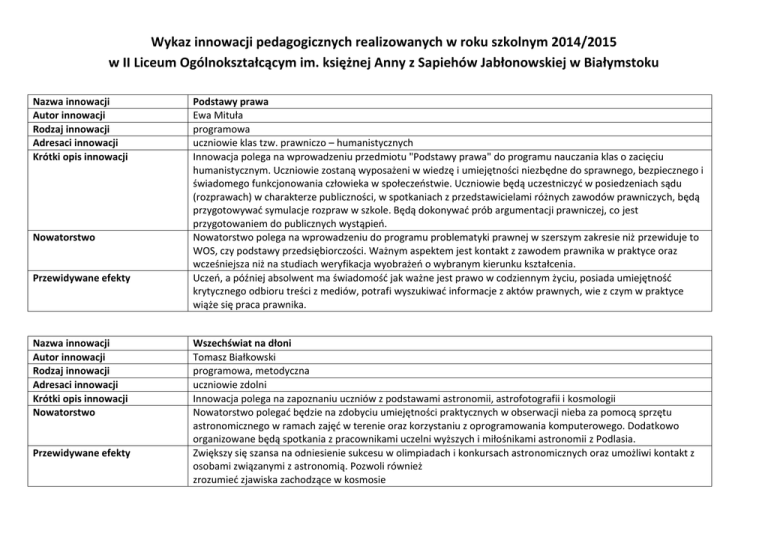 Wykaz innowacji pedagogicznych realizowanych w roku szkolnym 2014/2015 w II Liceum Ogólnokształcącym im. księżnej Anny z Sapiehów Jabłonowskiej w Białymstoku Nazwa innowacji Autor innowacji Rodzaj innowacji Adresaci innowacji Krótki opis innowacji Nowatorstwo Przewidywane efekty Nazwa innowacji Autor innowacji Rodzaj innowacji Adresaci innowacji Krótki opis innowacji Nowatorstwo Przewidywane efekty Podstawy prawa Ewa Mituła programowa uczniowie klas tzw. prawniczo – humanistycznych Innowacja polega na wprowadzeniu przedmiotu "Podstawy prawa" do programu nauczania klas o zacięciu humanistycznym. Uczniowie zostaną wyposażeni w wiedzę i umiejętności niezbędne do sprawnego, bezpiecznego i świadomego funkcjonowania człowieka w społeczeństwie. Uczniowie będą uczestniczyć w posiedzeniach sądu (rozprawach) w charakterze publiczności, w spotkaniach z przedstawicielami różnych zawodów prawniczych, będą przygotowywać symulacje rozpraw w szkole. Będą dokonywać prób argumentacji prawniczej, co jest przygotowaniem do publicznych wystąpień. Nowatorstwo polega na wprowadzeniu do programu problematyki prawnej w szerszym zakresie niż przewiduje to WOS, czy podstawy przedsiębiorczości. Ważnym aspektem jest kontakt z zawodem prawnika w praktyce oraz wcześniejsza niż na studiach weryfikacja wyobrażeń o wybranym kierunku kształcenia. Uczeń, a później absolwent ma świadomość jak ważne jest prawo w codziennym życiu, posiada umiejętność krytycznego odbioru treści z mediów, potrafi wyszukiwać informacje z aktów prawnych, wie z czym w praktyce wiąże się praca prawnika. Wszechświat na dłoni Tomasz Białkowski programowa, metodyczna uczniowie zdolni Innowacja polega na zapoznaniu uczniów z podstawami astronomii, astrofotografii i kosmologii Nowatorstwo polegać będzie na zdobyciu umiejętności praktycznych w obserwacji nieba za pomocą sprzętu astronomicznego w ramach zajęć w terenie oraz korzystaniu z oprogramowania komputerowego. Dodatkowo organizowane będą spotkania z pracownikami uczelni wyższych i miłośnikami astronomii z Podlasia. Zwiększy się szansa na odniesienie sukcesu w olimpiadach i konkursach astronomicznych oraz umożliwi kontakt z osobami związanymi z astronomią. Pozwoli również zrozumieć zjawiska zachodzące w kosmosie Nazwa innowacji Autor innowacji Rodzaj innowacji Adresaci innowacji Krótki opis innowacji Nowatorstwo Przewidywane efekty Nazwa innowacji Autor innowacji Rodzaj innowacji Adresaci innowacji Krótki opis innowacji Nowatorstwo Przewidywane efekty Z dziennikarstwem na Ty. Marta Pawłowska-Banach programowa, metodyczna uczniowie zdolni Innowacja polega na zapoznaniu uczniów z podstawowymi zasadami pracy dziennikarza prasowego i telewizyjnego. Zajęcia będą się odbywać raz w tygodniu. Uczniowie będą poznawać podstawowe gatunki dziennikarskie - teksty zostaną umieszczone w gazetce szkolnej. Dodatkowo poznają zasady pracy dziennikarza telewizyjnego (będą przygotowywać newsy czy felietony telewizyjne, które zostaną wyemitowane w szkolnej telewizji). Warsztaty dziennikarskie są nowością w praktyce szkolnej. Dadzą one możliwość wykorzystania wiadomości i umiejętności w praktyce, ponieważ ich efekty zostaną upublicznione. Jednocześnie uczniowie będą mogli wykorzystać wiedzę z różnych dziedzin podczas redagowania swoich tekstów. Uczniowie rozwiną swoje zainteresowania, zdobędą podstawy warsztatu pracy dziennikarskiej. Innowacja pomoże im lepiej zrozumieć rzeczywistość medialną w której żyją i być aktywnym jej uczestnikiem. Łacina w medycynie Urszula Tylicka programowa zainteresowani uczniowie klas o profilu medycznym Medycyna jest nauką, w której obecność języka łacińskiego oraz zlatynizowanych form greckich jest bardzo wyraźnie zauważalna. Proponowana innowacja polega na wprowadzeniu przedmiotu "Łacina w medycynie" dla uczniów o zainteresowaniach medycznych. W trakcie trwania zajęć, uczniowie zostaną zapoznani z podstawami języka łacińskiego w oparciu o słownictwo i terminologię stosowaną w naukach medycznych. Nauczą się pracy ze specjalistycznymi słownikami łacińsko-polskimi oraz zdobędą umiejętność stosowania właściwych technik tłumaczeniowych. Nowatorstwo polega na wprowadzeniu do programu nauczania języka łacińskiego podstaw łacińskiej terminologii medycznej oraz kształceniu umiejętności językowych w oparciu o teksty o tematyce przyrodniczej i medycznej. Uczniowie zostaną zapoznani z etymologią podstawowych terminów stosowanych w naukach przyrodniczych i medycznych oraz pogłębią znajomość nomenklatury łacińskiej stosowanej w różnych dziedzinach medycyny. Zostaną wyposażeni w wiedzę i umiejętności przydatne w ich przyszłej edukacji na poziomie akademickim.