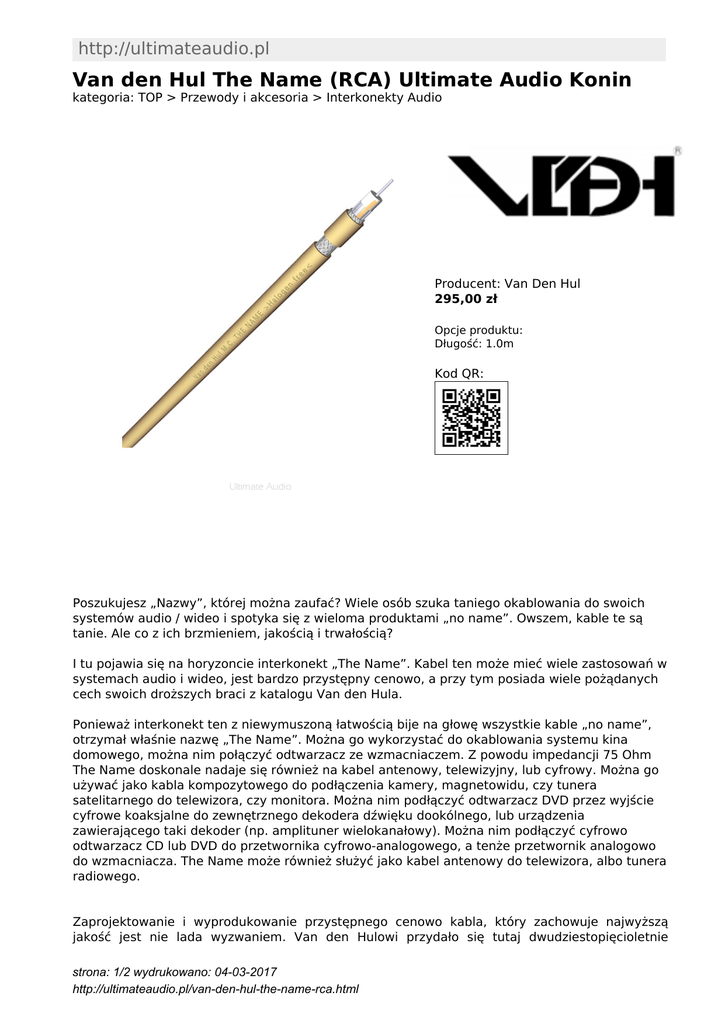http://ultimateaudio.pl Van den Hul The Name (RCA) Ultimate Audio Konin kategoria: TOP > Przewody i akcesoria > Interkonekty Audio Producent: Van Den Hul 295,00 zł Opcje produktu: Długość: 1.0m Kod QR: Poszukujesz „Nazwy”, której można zaufać? Wiele osób szuka taniego okablowania do swoich systemów audio / wideo i spotyka się z wieloma produktami „no name”. Owszem, kable te są tanie. Ale co z ich brzmieniem, jakością i trwałością? I tu pojawia się na horyzoncie interkonekt „The Name”. Kabel ten może mieć wiele zastosowań w systemach audio i wideo, jest bardzo przystępny cenowo, a przy tym posiada wiele pożądanych cech swoich droższych braci z katalogu Van den Hula. Ponieważ interkonekt ten z niewymuszoną łatwością bije na głowę wszystkie kable „no name”, otrzymał właśnie nazwę „The Name”. Można go wykorzystać do okablowania systemu kina domowego, można nim połączyć odtwarzacz ze wzmacniaczem. Z powodu impedancji 75 Ohm The Name doskonale nadaje się również na kabel antenowy, telewizyjny, lub cyfrowy. Można go używać jako kabla kompozytowego do podłączenia kamery, magnetowidu, czy tunera satelitarnego do telewizora, czy monitora. Można nim podłączyć odtwarzacz DVD przez wyjście cyfrowe koaksjalne do zewnętrznego dekodera dźwięku dookólnego, lub urządzenia zawierającego taki dekoder (np. amplituner wielokanałowy). Można nim podłączyć cyfrowo odtwarzacz CD lub DVD do przetwornika cyfrowo-analogowego, a tenże przetwornik analogowo do wzmacniacza. The Name może również służyć jako kabel antenowy do telewizora, albo tunera radiowego. Zaprojektowanie i wyprodukowanie przystępnego cenowo kabla, który zachowuje najwyższą jakość jest nie lada wyzwaniem. Van den Hulowi przydało się tutaj dwudziestopięcioletnie strona: 1/2 wydrukowano: 04-03-2017 http://ultimateaudio.pl/van-den-hul-the-name-rca.html doświadczenie w tej dziedzinie. The Name to czysta jakość brzmienia, bezproblemowość, trwałość i świetne brzmienie. The Name to koaksjalny interkonekt o średnicy 7,3 mm, odznaczający się następującymi cechami: Podwójne ekranowanie Ekran zapewnia sygnałowi doskonałą ochronę przed niechcianym szumem i zakłóceniami EMI i RFI, pochodzącymi z zewnątrz. Solid core Gruby, 1,1 milimetrowy centralny przewodnik zapewnia szerokie pasmo przenoszenia i niskie straty sygnału. Specjalna konstrukcja kabla uniemożliwia złamanie centralnej żyły. Miedź OFC pokrywana czystym srebrem Zarówno rdzeń solid core jak i ekran wykonane są z bardzo czystej miedzi beztlenowej Matched Crystal Oxygen Free Copper (MC OFC) pokrywanej zwartą warstwą srebra. Zastosowanie materiałów o wysokiej jakości jest gwarancją integralności sygnału i trwałości konstrukcji. Izolacja najwyższej klasy Wewnętrzny materiał izolacyjny, który oddziela od siebie przewodniki ma fizyczny udział w transferze sygnału i jego jakości. Dlatego też The Name wyposażony jest w izolację najwyższej klasy, zapewniającą optymalną jakość obrazu i dźwięku. Wewnętrzna izolacja kabla utrzymuje straty sygnału na minimalnym poziomie — pasożytnicze obciążenie pojemnościowe ma bardzo małą wartość 59 pF/m. Wysoka jakość wtyków Jakość wtyków ma istotne znaczenie dla całościowego brzmienia kabla. The Name zaopatrzony jest w takie same końcówki RCA, które możemy znaleźć w kablach Van den Hula z wyższej półki. Niemagnetyczne wtyki, izolowane wewnątrz teflonem, pokrywane warstwami miedzi, srebra, a na końcu dwudziestoczterokaratowego złota, zapewniają doskonałe i trwałe połączenie. Znakomita ochrona i trwałość Pokryte zwartą warstwą srebra przewodniki, jak również wytrzymała koszulka zewnętrzna z Hullifleksu w sposób optymalny chronią kabel przed chemicznym atakiem z zewnątrz (korozja) i zapewniają mu długowieczność. Bez względu na zastosowanie The Name sprawdza się znakomicie. Trwałe materiały, świetna jakość dźwięku i obrazu, przystępna cena — wszystko to czyni z niego wielozadaniowy kabel AV, zasługujący na swoją „nazwę”. strona: 2/2 wydrukowano: 04-03-2017 http://ultimateaudio.pl/van-den-hul-the-name-rca.html