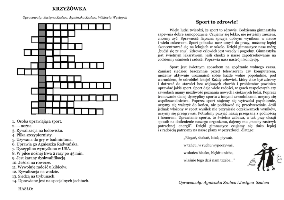 KRZYŻÓWKA Opracowały: Justyna Szalwa, Agnieszka Szalwa, Wiktoria Występek Sport to zdrowie! Wielu ludzi twierdzi, że sport to zdrowie. Codzienna gimnastyka zapewnia dobre samopoczucie. Czujemy się lekko, nie jesteśmy znużeni, chcemy żyć! Sprawność fizyczna sprzyja dobrym wynikom w nauce i wielu sukcesom. Sport pobudza nasz umysł do pracy, możemy lepiej skoncentrować się na lekcjach w szkole. Dzięki gimnastyce nasz mózg „budzi się ze snu”. Zdrowy człowiek jest wesoły i pogodny. Gimnastyka jest świetnym lekarstwem, jeśli chodzi o nasze zapotrzebowanie na codzienny uśmiech i radość. Poprawia nasz nastrój i kondycję. 1. Osoba uprawiająca sport. 2. ... nożna 3. Rywalizacja na lodowisku. 4. Piłka szczypiornisty. 5. Używana do gry w badmintona. 6. Uprawia go Agnieszka Radwańska. 7. Dyscyplina wymyślona w USA. 8. W piłce nożnej trwa 2 razy po 45 min. 9. Jest karany dyskwalifikacją. 10. Jeździ na rowerze. 11. Wywołuje radość u kibiców. 12. Rywalizacja na wodzie. 13. Siedzą na trybunach. 14. Uprawiane jest na specjalnych jachtach. HASŁO: Sport jest świetnym sposobem na spędzanie wolnego czasu. Zamiast siedzieć bezczynnie przed telewizorem czy komputerem, możemy aktywnie urozmaicić sobie każde wolne popołudnie, pod warunkiem, że odrobiłeś lekcje! Każdy człowiek, który chce być zdrowy i dotrwać do starości bez większych chorób i problemów powinien uprawiać jakiś sport. Sport daje wiele radości, w grach zespołowych czy zawodach mamy możliwość poznania nowych i ciekawych ludzi. Poprzez trenowanie danej dyscypliny sportu z innymi zawodnikami, uczymy się współzawodnictwa. Poprzez sport stajemy się wytrwalsi psychicznie, uczymy się walczyć do końca, nie poddawać się przedwcześnie. Jeśli jednak włożony w sport wysiłek nie przyniesie oczekiwanych wyników, uczymy się przegrywać. Potrafimy przyjąć naszą przegraną z godnością i honorem. Uprawianie sportu, to świetna zabawa, a tak przy okazji sposób na dotlenienie naszego organizmu, dajemy mu „mocny zastrzyk potrzebnej energii”. Dzięki gimnastyce czujemy się dużo lepiej i z radością patrzymy na nasze plany w przyszłości, dlatego: „Biegać, skakać, latać, pływać, w tańcu, w ruchu wypoczywać, w słońca blasku, błękitu nieba, właśnie tego dziś nam trzeba…” Opracowały: Agnieszka Szalwa i Justyna Szalwa