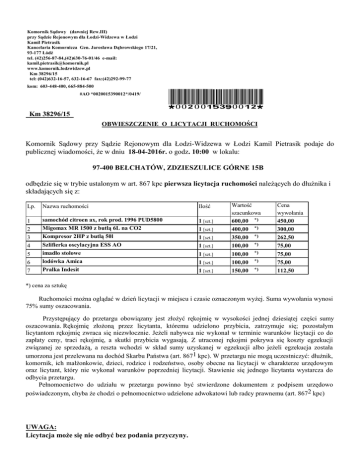 Komornik Sądowy (dawniej Rew.III) przy Sądzie Rejonowym dla Łodzi-Widzewa w Łodzi Kamil Pietrasik Kancelaria Komornicza Gen. Jarosława Dąbrowskiego 17/21, 93-177 Łódź tel. (42)256-87-84,(42)630-76-01/46 e-mail: [email protected] www.komornik.lodzwidzew.pl Km 38296/15 tel: (042)632-16-57, 632-16-67 fax:(42)292-99-77 kom: 603-448-400, 665-884-500 #AO *0020015390012*/0419/ *0020015390012* Km 38296/15 OBWIESZCZENIE O LICYTACJI RUCHOMOŚCI Komornik Sądowy przy Sądzie Rejonowym dla Łodzi-Widzewa w Łodzi Kamil Pietrasik podaje do publicznej wiadomości, że w dniu 18-04-2016r. o godz. 10:00 w lokalu: 97-400 BEŁCHATÓW, ZDZIESZULICE GÓRNE 15B odbędzie się w trybie ustalonym w art. 867 kpc pierwsza licytacja ruchomości należących do dłużnika i składających się z: Lp. Nazwa ruchomości Ilość 1 2 3 4 5 6 7 samochód citroen ax, rok prod. 1996 PUD5800 Migomax MR 1500 z butlą 6L na CO2 Kompresor 2HP z butlą 50l Szlifierka oscylacyjna ESS AO imadło stołowe lodówka Amica Pralka Indesit 1 [szt.] 1 [szt.] 1 [szt.] 1 [szt.] 1 [szt.] 1 [szt.] 1 [szt.] Wartość szacunkowa 600,00 *) 400,00 *) 350,00 *) 100,00 *) 100,00 *) 100,00 *) 150,00 *) Cena wywołania 450,00 300,00 262,50 75,00 75,00 75,00 112,50 *) cena za sztukę Ruchomości można oglądać w dzień licytacji w miejscu i czasie oznaczonym wyżej. Suma wywołania wynosi 75% sumy oszacowania. Przystępujący do przetargu obowiązany jest złożyć rękojmię w wysokości jednej dziesiątej części sumy oszacowania. Rękojmię złożoną przez licytanta, któremu udzielono przybicia, zatrzymuje się; pozostałym licytantom rękojmię zwraca się niezwłocznie. Jeżeli nabywca nie wykonał w terminie warunków licytacji co do zapłaty ceny, traci rękojmię, a skutki przybicia wygasają. Z utraconej rękojmi pokrywa się koszty egzekucji związanej ze sprzedażą, a reszta wchodzi w skład sumy uzyskanej w egzekucji albo jeżeli egzekucja została umorzona jest przelewana na dochód Skarbu Państwa (art. 8671 kpc). W przetargu nie mogą uczestniczyć: dłużnik, komornik, ich małżonkowie, dzieci, rodzice i rodzeństwo, osoby obecne na licytacji w charakterze urzędowym oraz licytant, który nie wykonał warunków poprzedniej licytacji. Stawienie się jednego licytanta wystarcza do odbycia przetargu. Pełnomocnictwo do udziału w przetargu powinno być stwierdzone dokumentem z podpisem urzędowo poświadczonym, chyba że chodzi o pełnomocnictwo udzielone adwokatowi lub radcy prawnemu (art. 8672 kpc) UWAGA: Licytacja może się nie odbyć bez podania przyczyny. Jeżeli drzwi będą zamknięte, będą otwierane na koszt i odpowiedzialność obowiązanegodłużnika. Komornik Sądowy Asesor Komorniczy Asesor Komorniczy Kamil Pietrasik Marta Kula Marek Knap Aplikant Komorniczy Aplikant Komorniczy Aplikant Komorniczy Asesor Komorniczy Roksana Kabuła Marta Szesteren Małgorzata Łepek Karolina KowalczykSkolasińska Adresat oryginału: dłużnik Do wiadomości: strony Asesor Komorniczy Asesor Komorniczy Asesor Komorniczy Asesor Komorniczy Lidia Chwalewska Sylwia Kacprzak Asesor Komorniczy Asesor Komorniczy Asesor Komorniczy Małgorzata Sienkiewicz-Siuda Magdalena Leszczyńska Anna Olczyk Piotr Ewa Nawrotkiewicz Aftowicz-Szymańska