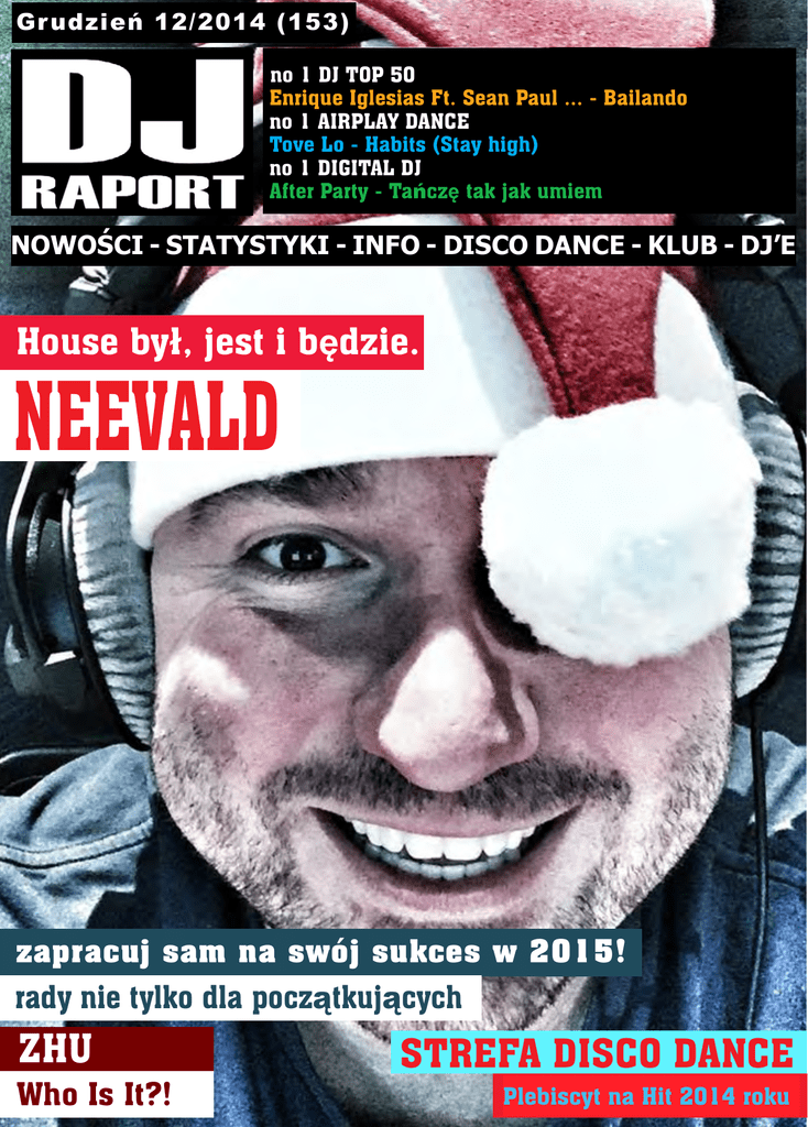 Gr udzień 12/2014 (153) no 1 DJ TOP 50 Enrique Iglesias Ft. Sean Paul ... - Bailando no 1 AIRPLAY DANCE Tove Lo - Habits (Stay high) no 1 DIGITAL DJ After Party - Tańczę tak jak umiem NOWOŚCI - STATYSTYKI - INFO - DISCO DANCE - KLUB - DJ’E House był, jest i będzie. NEEVALD zapracuj sam na swój sukces w 2015! rady nie tylko dla początkujących ZHU Who Is It?! STREFA DISCO DANCE Plebiscyt na Hit 2014 roku MIĘDZY NAMI DIDŻEJAMI “Zapracuj sam na swój sukces... za konsoletą!” - nie, nie chodzi o jakiś prezent pod choinkę, ale o zrobienie czegoś w rodzaju rachunku sumienia. Bo jeśli dopiero zaczynasz karierę dj’ską lub należysz do tej grupy ludzi, którzy szukają przyczyn swojego zawodowego niepowodzenia dookoła siebie zadaj sobie pytanie: co mogę zrobić dla siebie z Nowym Rokiem?... i przeczytaj ten obszerny artykułanalizę mający swój początek na (3) stronie. Przeczytaj także zwierzenia Mikołaja z naszej okładki - NeeValda (12), który posiada ogromny dorobek zawodowy. Być może stanie się Twoją inspiracją? A w felietonie obok tym razem historycznie. Pewnie nadchodzące Święta nastrajają jego autora bardziej do wspominków niż analizowania rzeczywistości branżowej. Najpraw-dopodobniej będzie to fragment zapowiadanej od dawna książki Bogdana Fabiańskiego, która powinna ujrzeć światło dzienne w 2015 roku. ZHU - who is it?! Do diabła, po co ta tajemnica wokół autora jednego z największych hitów ostatnich miesięcy. O tym na (8) stronie. Prawie wszystko wiemy za to na temat Claydee - autora takich hitów jak “Sexy Papi” i “Chiki Chiki”. Wywiad z nim na (14) stronie. W Kufrze DJ’a (9) jak co roku o tej porze - świątecznie. Tym razem jednak są to albumy. Tu okazuje się, że Król Funk - James Brown - ma swój bożonarodzeniowy krążek. Wspominamy o tym jednak z innego powodu. Oto do kin wszedł znakomity film o tej legendarnej postaci! Powinien to zobaczyć każdy kto para się dj’ką. Szczegóły na (5) stronie. Życzymy miłej lektury! bez oddechu! felieton Bogdana Fabiańskiego (Radio Zet Gold) Dzisiaj trochę historii na temat audycji „Wieczór i Noc DJ-ów”, która do chwili obecnej wspominana jest z „łezką w oku”, pomimo że od jej powstania mnięły 23 lata, a od jej „zniknięcia” z anteny Radia Dla Ciebie… prawie 2 lata. Pierwsza audycja została wyemitowana w 1991 roku. Jej pełna nazwa wówczas brzmiała: „Wieczór i Noc DJ-ów”. Audycja rozpoczynała się o godzinie 19.00 w piątek i kończyła o 5 rano w sobotę. W takiej formie przetrwała aż do roku 2005. W latach 90. przykuwała do odbiorników radiowych całe rzesze słuchaczy i DJ-ów z całej Polski. Każdą godzinę otwierały Powerplay’e – czyli nowości płytowe, które według prowadzących miały szansę na sukces w klubach i na listach przebojów. Każdy słuchacz mógł znaleźć coś dla siebie i dowiedzieć się o nowych trendach w muzyce tanecznej. Najczęściej komentowane w „Wieczorze i Nocy DJ-ów” nurty muzyczne, to między innymi różne odmiany: house, techno, rave, dream, hip hop, r’n’b, euro dance, drum’n’bass. W programie ponadto pojawiały się wywiady z DJ-ami, którzy typowali również przez siebie wylansowane w klubach utwory, rozmowy z producentami muzyki tanecznej i gwiazdami, przegląd światowych list przebojów muzyki klubowej, a także podsumowanie polskiego Top 40 Dance Chart – najdłużej istniejącej listy przebojów z muzyką taneczną w Polsce. Ukazało się 8 podwójnych płyt z nagraniami z TOP 40 jako „Top 40 vol 1-8”, plus jedna „Top 40 in the mix”. Byłem głównym pomysłodawcą audycji i prowadzącym od samego początku. Niedługo potem zaprosiłem do współpracy Pawła Bobrowskiego. Kolejne bardzo ważne nazwisko w ekipie to Arkadiusz Kałucki - redaktor muzyczny Radia Dla Ciebie, który był naszym sekretarzem i osobą, która czuwała aby wszystko szło z planem. Pod koniec lat 90. do grona współpracowników dołączył Foto na okładce: NeeVald Z życzeniami spokojnych Świąt Bożego Narodzenia polecamy do posłuchania w czasie czytania! Kliknij na ikonę nuty w menu na stronie www DIDASCALIS Ft. Andy G White Christmas najsłynniejszy świąteczny klasyk podany na nowo Piotr Gryglewicz – szef organizacji DJów: DJ Promotion. Dzięki niemu podczas audycji można było usłyszeć wiele trudnych do zdobycia utworów, wydawanych tylko na płytach winylowych, oraz ciekawych remiksów, edit’ów i nagrań z tzw. white labeli. Z końcem lat 90 na wyposażeniu studia pojawiły się gramofony Technics oraz sprzęt dla DJ’ów marki Pioneer. Zaczęło się miksowanie na żywo podczas audycji. W radiowym studio coraz częściej pojawiali się DJ-e prezentujący swoje autorskie sety. Wśród grających w ostatnich latach znaleźli się między innymi: Tenessee, Yoora, Energy, Omen, Oko, Marski, Mayoman, MG Mastermix, Levy, Gramma Rose, CJ Art, DJ Tomson, DJ Diablo, Clermont Ferrand, DJ Herner, DJ eMeR, DJ Car, Rafael Lambert, Paweł Bobrowski, Bogdan Fabianski i wielu innych... również ważnych światowych firm płytowych. Audycja wielokrotnie transmitowana była bezpośrednio z klubów, bądź z ważnych wydarzeń klubowo-kulturalnych. Transmisje (live) odbywały się między innymi z klubów: OK, Kult, Extravaganza, Barbados, Theatro etc. Na przestrzeni lat zmieniali się realizatorzy dźwięku, których praca była jednym z kluczowych elementów dobrze poprowadzonej audycji. Za heblami podczas „Wieczoru i Nocy DJów” zasiadali: Janek Gadomski, Joanna Włoczewska, Żaneta Tomala, Katarzyna Michalak, Paweł Uchymiak, Andrzej Gmitrzuk, Mariusz Wieczorek i Ryszard Kawecki. Współpracownicy audycji oraz redakcji muzycznej RDC, których materiały i zaangażowanie pomogły zrealizować wiele ciekawych bloków, to między innymi: Tomasz Bąk (Londyn), Beata Przedpełska (Sztokholm), Darek Nosarzewski (Adelajda), Rafał Lachmirowicz. Wśród artystów, którzy poj