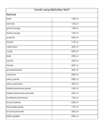 Cennik usług MeDioStar NeXT Epilacja baki 130 zł