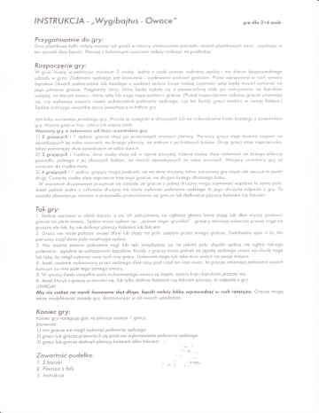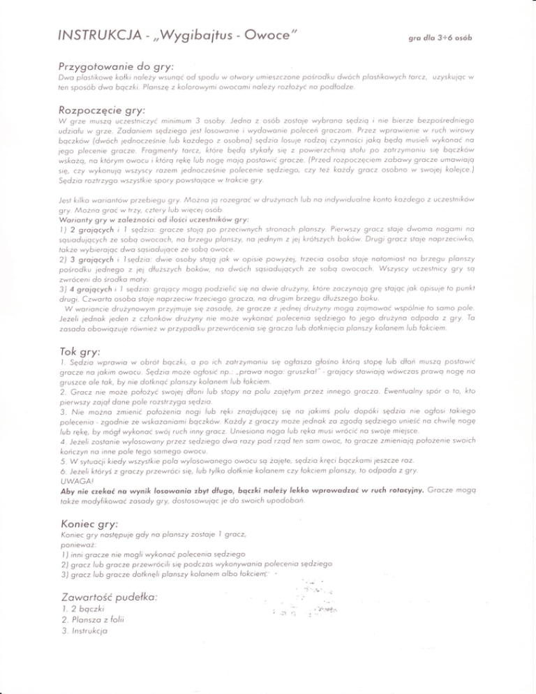 INSIR UKCJA - ,,Wygiboifus - Owoce" gro dlo 3+ó osób Przygofowonie do gry: Dwo p/osfikowe kołki nolezy wsunoć od spodu w otwory umieszczone pośrodku dwóch p/osti/<owych torcz, uzysku1oc w ien sposób dwo bqczki' Plc:nszę z kolorowymi owocoml noleży rozłożyc no podłodze' Rozpoczęcie gry: minimum 3 osoLry. Jedno z osób zoslofe wybronr.l sędzlq l nie bierze bezpośredniego udziołu w grze. Zodoniem sędziego fesl /osowonie i wydawclnie po/eceń groczom' Przez wprowienie w ruch wirowy boczkow (dwoch fednocześnie lub kazdego z osobno) sędzio iosufe rodzo1 czynności 1o/<o będo musie/r wykonac na fego p/ecenie grocze' Frogmenty tcsrcz, ktore bedo stykoły stę z powierzchnio sfołu po zotrzymoniu sie bqczkow wskożq, nc: ktorym owocu iktórq rękę /ub noge mofo poslowiC gracze. (Przed rozpoczeciem zobo*y gracze umowio1q się, czy wykonu1o wszyscY rozem 1ednocześnie po/ecenie sedziego, czy też kożdy gracz osobno w swoief ko/e1ce.,l W grze muszq uczestniczyc Sedzio roztrzyqo wszystkie spory powsfo lace w trokcie gry. i<i//<o woriontow przeb,egu gry. Można io rozegrocw drużynoch lub na tndywiduolne /<onfo kozdego z uczestnikow gry' Możno grac w trzy, cztery /ub wiecei osób' Worionły gry w zoleżnościod ilościuczestnikow gry: l) 2 grojqcych i I sedzro: grocze sfoio po przeciwnych sfronoch plonszy. Pierwszy grocz slole d-omo nogomi no sosiodufocych ze sobo owococh, no brzegu plonszy, no iednym z 1e1 krotszych bo/.ó*- Drugi grc:cz sto1e noprzeciwko, tokże wybiero1qc d-o sosiodufoce ze sobq owoCe' 2) 3 gro1qcych i lsędzi<:: dwie osoby sfo1q 1ok w opisie powyzel, frzeclo osobo sfofe nolomiost na brzegu planszy pośrodku 1ednego z 1e1 dłuzszych bokow, no dwóch sosiodufocych ze sobo owococh. Wszyscy uczeslnicy grY sq Jesf zwroceni do środko moty. 'l 3) 4 groiqcych i sedzio: grolacy mogo podzie/ić sie no dwte drużyny, ktore zoczynaio 9re słofoc 1ok opisu1e to punkf drugi. Czwc:rto osobo sto1e naprzeciw trzeciego grc1czo, no drugim brzegu dłuższego boku. W wc:rioncie drużynowym przy1muie sie zosode, że gracze z 1ednei drużyny magą zalmowoc wspóinie fo somo po/e' Jezeli 1ednok 1eden z członkow drużyny nie może wykoncsc po/ecenio sedziego to 1ego drużyno odpodo z gry. To zosoda obowiqzu1e rownież* przypcldku przewrocenio się 9roczo /ub dotkniecio planszy /<o/onem /ub łokclem. Tok gry: i' Sędzio wprowia w obrof baczki, o po ich zatrzymoniu się ogłoszo glośno któro slopę /ub dłoń muszcs poslowlc grocze no iakim owocu- Sedzio moze ogłosic np.: ,,prawo nogcs: gruszko!"-groiocy sfowiofo wowczos prowo nogę no grusŻce ole tok, by nie dofknoc plonszy ko/onem /ub łoi<crem' 2. Grocz nie może połozyc swo1e1 dłoni /ub stopy no po/u zc:1ętym przez innego graczo. Ewentuolny spór o fo, kto pierwszy zoiał done pole rozstrzygo sedzio3' Nie możno zmienic polozenio nogi /ub ręki zno1du1qcef się no lokimśpo/u dopóki sędzio nie ogłosi fokiego po/ecenio ' zgodnie ze wskazonirsmi boczkow' Kozdy z groczY moze fednok z,s zgodq sędziego unieśc no chwi/e noge Iub rękę, by mogł wykonoc swo1 ruch inny grcscz' Unlesrono n99o iub ręko musr wrocic no swofe mie1sce' 4. Jezeli zostonie wylosowany przez sedziego dwo razy pod rzod fen som owoc, fo grocze zmieniala polozenie swoich konczyn no rnne po/e tego somego owocu. 5.Wsytuociikiedywszystkiepolowylosowonegoowocuso żc:l1ete,sedzio krecrboczkomi1eszczeraz. ó. Jezeli ktoryś z groczy przewroci się, /ub fylko dof/<nie ko/onem czy łokciem plonszy, fo odpodo z gry' UWAGA! Aby nie czekoć na wynik losowonio zbyt długo, bqczki noleży lekko wprowddzoć w rvch rołacyiny. Grcscze mogq tokze modyfikowcsc zosody gry, dostosowu1qc 1e do swoich upodoboń' Koniec ary: Koniec gry nosfępufe gdy no plonszy zostoie l grocz, Poniewoż: l ) inni grocze nie mog/i wykonoc po/ecenio sędziego 2) grocz lub grocze przewrocili się podczos wykonywonio po/ecenlo sędziego 3) grocz lub grocze dołkneii plc:nszy i<oionem oibo ło/<ciem-.' Zawortośc pudełko: 1. 2 bqczki 2. Plonszo z folii 3. lnstrukclo : :1ż ;'#-