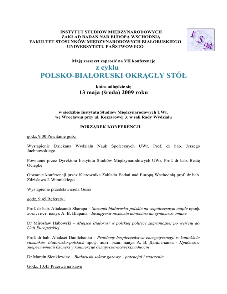 INSTYTUT STUDIÓW MIĘDZYNARODOWYCH ZAKŁAD BADAŃ NAD EUROPĄ WSCHODNIĄ FAKULTET STOSUNKÓW MIĘDZYNARODOWYCH BIAŁORUSKIEGO UNIWERSYTETU PAŃSTWOWEGO Mają zaszczyt zaprosić na VII konferencję z cyklu POLSKO-BIAŁORUSKI OKRĄGŁY STÓŁ która odbędzie się 13 maja (środa) 2009 roku w siedzibie Instytutu Studiów Międzynarodowych UWr. we Wrocławiu przy ul. Koszarowej 3. w sali Rady Wydziału PORZĄDEK KONFERENCJI godz. 9.00 Powitanie gości Wystąpienie Dziekana Wydziału Nauk Społecznych UWr. Prof. dr hab. Jerzego Juchnowskiego Powitanie przez Dyrektora Instytutu Studiów Międzynarodowych UWr. Prof. dr hab. Beatę Ociepkę Otwarcie konferencji przez Kierownika Zakładu Badań nad Europą Wschodnią prof. dr hab. Zdzisława J. Winnickiego Wystąpienie przedstawiciela Gości godz. 9.45 Referaty : Prof. dr hab. Aliaksandr Sharapa – Stosunki białorusko-polskie na współczesnym etapie проф. докт. гист. навук А. В. Шарапа - Беларуска-польскiя адносiны на сучасным этапе Dr Mirosław Habowski – Miejsce Białorusi w polskiej polityce zagranicznej po wejściu do Unii Europejskiej Prof. dr hab. Aliaksei Danilchanka – Problemy bezpieczeństwa energetycznego w kontekście stosunków białorusko-polskich проф. докт. экан. навук А. В. Данiльчанка - Праблемы энергетычнай бяспекi у кантэксце беларуска-польскiх адносiн Dr Marcin Sienkiewicz – Białoruski sektor gazowy – potencjał i znaczenie Godz. 10.45 Przerwa na kawę Godz. 11.00 Referaty Doc.dr Heorhi Mikhalevich – Białorusini w Polsce: problemy narodowej i kulturowej samoidentyfikacji дац. канд. гiст. навук Г.М. Мiхалькевич - Беларусы у Польшчы: праблемы нацыянальнай культурнай самаiдэнтыфiкацi Prof. dr hab. Zdzisław J. Winnicki – Polacy na Białorusi: problemy narodowej i kulturowej samoidentyfikacji Doc. dr Andrei Rusakovich – Białoruś i Unia Europejska: problemy i perspektywy współpracy дац. канд. гiст. навук А. У. Русаковiч – Беларусь i Еурапейскi саюз: праблемы i перспектiвы узаемадзеяння Dr hab. Walenty Baluk, Dr Ł. Leszczenko – Białoruś w europejskiej polityce sąsiedztwa Vadzim Reznikau – Współczesne białorusko-polskie stosunki w sferze edukacji В. Я. Рэзнiкаy - Беларуска-польскiя адносiны у сферы адукацыi на сучасным этапе Godz. 12.15 Dyskusja Godz. 13.00 Obiad dla referentów Godz. 13.45 Ciąg dalszy dyskusji Godz. 14.45 Zakończenie konferencji