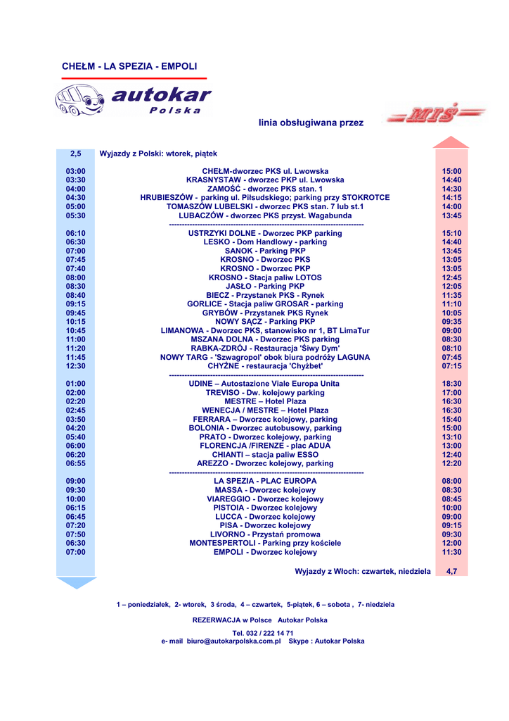 CHEŁM - LA SPEZIA - EMPOLI linia obsługiwana przez 2,5 03:00 03:30 04:00 04:30 05:00 05:30 06:10 06:30 07:00 07:45 07:40 08:00 08:30 08:40 09:15 09:45 10:15 10:45 11:00 11:20 11:45 12:30 01:00 02:00 02:20 02:45 03:50 04:20 05:40 06:00 06:20 06:55 09:00 09:30 10:00 06:15 06:45 07:20 07:50 06:30 07:00 Wyjazdy z Polski: wtorek, piątek CHEŁM-dworzec PKS ul. Lwowska KRASNYSTAW - dworzec PKP ul. Lwowska ZAMOŚĆ - dworzec PKS stan. 1 HRUBIESZÓW - parking ul. Piłsudskiego; parking przy STOKROTCE TOMASZÓW LUBELSKI - dworzec PKS stan. 7 lub st.1 LUBACZÓW - dworzec PKS przyst. Wagabunda ---------------------------------------------------------------------------USTRZYKI DOLNE - Dworzec PKP parking LESKO - Dom Handlowy - parking SANOK - Parking PKP KROSNO - Dworzec PKS KROSNO - Dworzec PKP KROSNO - Stacja paliw LOTOS JASŁO - Parking PKP BIECZ - Przystanek PKS - Rynek GORLICE - Stacja paliw GROSAR - parking GRYBÓW - Przystanek PKS Rynek NOWY SĄCZ - Parking PKP LIMANOWA - Dworzec PKS, stanowisko nr 1, BT LimaTur MSZANA DOLNA - Dworzec PKS parking RABKA-ZDRÓJ - Restauracja 'Śiwy Dym' NOWY TARG - 'Szwagropol' obok biura podróży LAGUNA CHYŻNE - restauracja 'Chyżbet' ---------------------------------------------------------------------------UDINE – Autostazione Viale Europa Unita TREVISO - Dw. kolejowy parking MESTRE – Hotel Plaza WENECJA / MESTRE – Hotel Plaza FERRARA – Dworzec kolejowy, parking BOLONIA - Dworzec autobusowy, parking PRATO - Dworzec kolejowy, parking FLORENCJA /FIRENZE - plac ADUA CHIANTI – stacja paliw ESSO AREZZO - Dworzec kolejowy, parking ---------------------------------------------------------------------------LA SPEZIA - PLAC EUROPA MASSA - Dworzec kolejowy VIAREGGIO - Dworzec kolejowy PISTOIA - Dworzec kolejowy LUCCA - Dworzec kolejowy PISA - Dworzec kolejowy LIVORNO - Przystań promowa MONTESPERTOLI - Parking przy kościele EMPOLI - Dworzec kolejowy Wyjazdy z Włoch: czwartek, niedziela 1 – poniedziałek, 2- wtorek, 3 środa, 4 – czwartek, 5-piątek, 6 – sobota , 7- niedziela REZERWACJA w Polsce Autokar Polska Tel. 032 / 222 14 71 e- mail [email protected] Skype : Autokar Polska 15:00 14:40 14:30 14:15 14:00 13:45 15:10 14:40 13:45 13:05 13:05 12:45 12:05 11:35 11:10 10:05 09:35 09:00 08:30 08:10 07:45 07:15 18:30 17:00 16:30 16:30 15:40 15:00 13:10 13:00 12:40 12:20 08:00 08:30 08:45 10:00 09:00 09:15 09:30 12:00 11:30 4,7 W cenie przejazdu ciepły posiłek, ubezpieczenie na czas podróży oraz kawa lub herbata INFORMACJA WE WŁOSZECH Rzym - Neapol + 39 340 340 52 46 Toscania + 39 349 638 98 95 Verona - Modena +39 333 41 53 745 Adriatyk +39 329 21 96 333 Salerno - Agropoli +39 340 23 16 019 UWAGA ! Potwierdzenie rezerwacji powrotu na włoskie numery w przeddzień wyjazdu z Włoch do Polski OBOWIĄZKOWE ! Dotyczy także klientów z biletami już datowanymi i OPEN Telefony do autokarów w Polsce 0 603 934 127 0 607 507 921 0 693 129 100 0 605 466 203 do godz 11.00 Telefony do autokarów we Włoszech +34 840 30 487 WAŻNE INFORMACJE BILET OPEN Za rezerwację biletu OPEN oraz zmianę terminu pobierana jest opłata w wysokości 10 EUR lub 30 PLN NADBAGAŻ Może zostać zabrany tylko gdy pozwala na to miejsce w luku bagażowym za dodatkową opłatą w wysokości 10 EUR lub 30 PLN . ZWROT BILETU 1.Biuro potrąca nastepujące kwoty przy : a / zwrocie biletu w terminie 7 i więcej dni przed data wyjazdu 5% ceny biletu / netto + VAT / OPŁATA SKARBOWA NIE PODLEGA ZWROTOWI b / zwrocie dokonanym 6 - 3 dni przed data wyjazdu 10% ceny biletu c/ zwrocie dokonanym 2 dni przed data wyjazdu 20% ceny biletu d/ zwrocie dokonanym 1 dzień przed data wyjazdu 40% ceny biletu e/ zwrocie dokonanym w dniu wyjazdu 70% ceny biletu c / w przypadku nie wykorzystania biletu , niezgłoszenia się do autobusu lub zgłoszenia rezygnacji po terminie wyjazdu biuro nie dokonuje żadnego zwrotu za bilet Przy zwrotach biletów zakupionych przez moduł Euroticket www Oferent biletu / Autokar Polska /pobiera opłatę manipulacyjną w wysokości 10 % wartości biletu zwrotu zgodnie z Regulaminem korzystania z modułu Euroticket www. Osoby nieletnie winny posiadać upoważnienie do przewozu osoby nieletniej /druk na stronie www.autokarpolska .com.pl w dziale dla agentów /