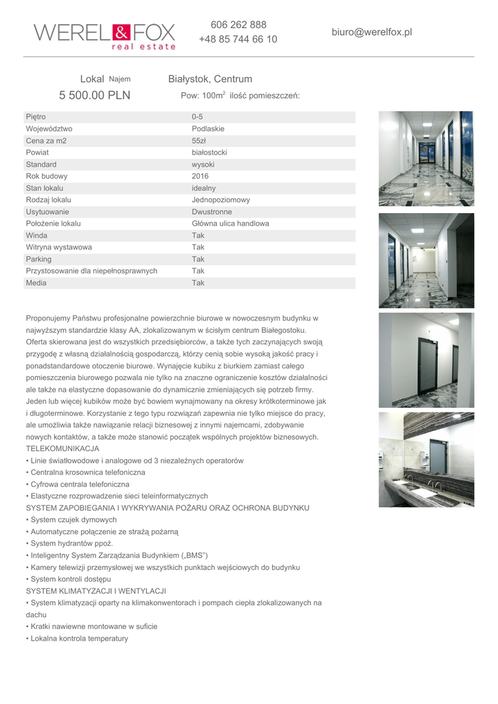 606 262 888 +48 85 744 66 10 Lokal Najem Białystok, Centrum 5 500.00 PLN Pow: 100m2 ilość pomieszczeń: Piętro 0-5 Województwo Podlaskie Cena za m2 55zł Powiat białostocki Standard wysoki Rok budowy 2016 Stan lokalu idealny Rodzaj lokalu Jednopoziomowy Usytuowanie Dwustronne Położenie lokalu Główna ulica handlowa Winda Tak Witryna wystawowa Tak Parking Tak Przystosowanie dla niepełnosprawnych Tak Media Tak Proponujemy Państwu profesjonalne powierzchnie biurowe w nowoczesnym budynku w najwyższym standardzie klasy AA, zlokalizowanym w ścisłym centrum Białegostoku. Oferta skierowana jest do wszystkich przedsiębiorców, a także tych zaczynających swoją przygodę z własną działalnością gospodarczą, którzy cenią sobie wysoką jakość pracy i ponadstandardowe otoczenie biurowe. Wynajęcie kubiku z biurkiem zamiast całego pomieszczenia biurowego pozwala nie tylko na znaczne ograniczenie kosztów działalności ale także na elastyczne dopasowanie do dynamicznie zmieniających się potrzeb firmy. Jeden lub więcej kubików może być bowiem wynajmowany na okresy krótkoterminowe jak i długoterminowe. Korzystanie z tego typu rozwiązań zapewnia nie tylko miejsce do pracy, ale umożliwia także nawiązanie relacji biznesowej z innymi najemcami, zdobywanie nowych kontaktów, a także może stanowić początek wspólnych projektów biznesowych. TELEKOMUNIKACJA • Linie światłowodowe i analogowe od 3 niezależnych operatorów • Centralna krosownica telefoniczna • Cyfrowa centrala telefoniczna • Elastyczne rozprowadzenie sieci teleinformatycznych SYSTEM ZAPOBIEGANIA I WYKRYWANIA POŻARU ORAZ OCHRONA BUDYNKU • System czujek dymowych • Automatyczne połączenie ze strażą pożarną • System hydrantów ppoż. • Inteligentny System Zarządzania Budynkiem („BMS”) • Kamery telewizji przemysłowej we wszystkich punktach wejściowych do budynku • System kontroli dostępu SYSTEM KLIMATYZACJI I WENTYLACJI • System klimatyzacji oparty na klimakonwentorach i pompach ciepła zlokalizowanych na dachu • Kratki nawiewne montowane w suficie • Lokalna kontrola temperatury [email protected] • Dywersyfikacja zasilania – dwa niezależne źródła zasilania • Puszki podłogowe („floorbox-y”) – jedna na 20 m2powierzchni biurowej dla dwóch stanowisk pracy • Efektywne rozmieszczenie szachtów instalacyjnych umożliwiające dopasowanie sieci teleinformatycznych do potrzeb Najemcy Oferta: • indywidualne biuro (zamykany kubik o wymiarach 200x160 cm) z biurkiem, szafką i wygodnym fotelem • półprzezroczyste szyby oddzielające kubiki • nieograniczony dostęp do sieci wi-fi o dużej przepustowości • dostęp do urządzeń wielofunkcyjnych (drukarka, ksero, skaner) • dostęp do w pełni wyposażonej kuchni • obsługa recepcji w głównym lobby w godzinach 7-22 • możliwość wykupienia miejsca parkingowego • dostęp do w pełni wyposażonej sali konferencyjnej z możliwością organizowania telekonferencji, sali posiedzeń i miejsc spotkań • dostęp do wysokiej jakości kawiarni biurowej z tarasem na tym samym piętrze • dostęp do biura 24/h • całodobowa ochrona Szeroki zakres powierzchni do wynajęcia – zaczynając od kubików 3 m2, a kończąc na powierzchni 1400 m2 na jednej kondygnacji. Do budynku przynależy strzeżony parking, zapewniający do 170 miejsc postojowych. Do wynajmu przeznaczona jest powierzchnia fit-out czyli przygotowana i wyposażona według życzenia najemcy. Na każdej kondygnacji znajdują się dwie umeblowane i wyposażone kuchnie (sprzęt AGD Electrolux) w budynku jest też kawiarnia z dużym tarasem. Koszt najmu kształtuje się od 55 zł netto za m2 powierzchni. POLECAM I ZAPRASZAM NA BEZPŁATNĄ PREZENTACJĘ! WEREL&FOX tel. kom. 731 500 669 biuro: +48 85 744 66 10, +48 85 744 66 11 e-mail: [email protected] Gwarancja bezpieczeństwa - nasze transakcje są ubezpieczone; numer licencji pośrednika w obrocie nieruchomościami 4277. Podane dane mają charakter wyłącznie informacyjny i winny być traktowane jako zaproszenie do zawarcia umowy. Informacja nie stanowi oferty w rozumieniu art.66 KC oraz innych właściwych przepisów prawnych. Informacje umieszczone w ofertach przekazywane są przez właścicieli nieruchomości i mogą ulegać zmianom. Dokładamy wszelkich starań, aby wszystkie oferty były aktualne i odpowiadały stanowi rzeczywistemu. data wydruku: 2017-03-04 11:25:36
