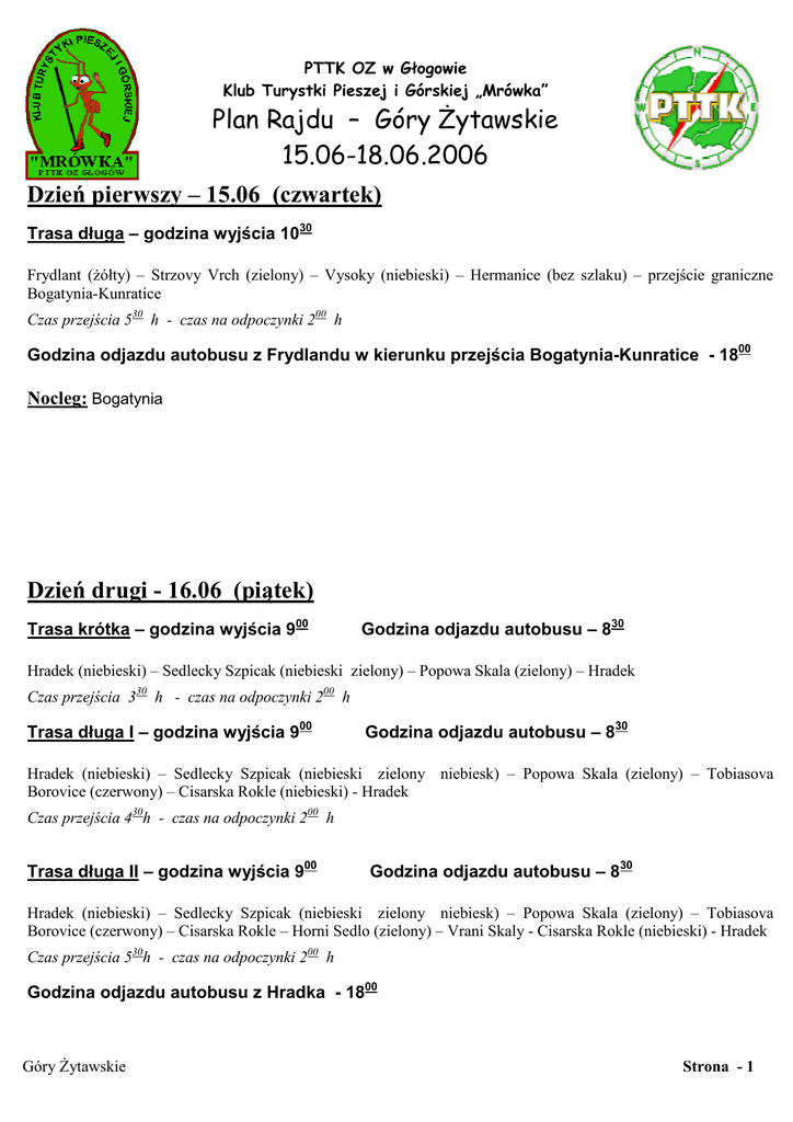 PTTK OZ w Głogowie Klub Turystki Pieszej i Górskiej „Mrówka” Plan Rajdu – Góry Żytawskie 15.06-18.06.2006 Dzień pierwszy – 15.06 (czwartek) Trasa długa – godzina wyjścia 1030 Frydlant (żółty) – Strzovy Vrch (zielony) – Vysoky (niebieski) – Hermanice (bez szlaku) – przejście graniczne Bogatynia-Kunratice Czas przejścia 530 h - czas na odpoczynki 200 h Godzina odjazdu autobusu z Frydlandu w kierunku przejścia Bogatynia-Kunratice - 1800 Nocleg: Bogatynia Dzień drugi - 16.06 (piątek) Trasa krótka – godzina wyjścia 900 Godzina odjazdu autobusu – 830 Hradek (niebieski) – Sedlecky Szpicak (niebieski zielony) – Popowa Skala (zielony) – Hradek Czas przejścia 330 h - czas na odpoczynki 200 h Trasa długa I – godzina wyjścia 900 Godzina odjazdu autobusu – 830 Hradek (niebieski) – Sedlecky Szpicak (niebieski zielony niebiesk) – Popowa Skala (zielony) – Tobiasova Borovice (czerwony) – Cisarska Rokle (niebieski) - Hradek Czas przejścia 430h - czas na odpoczynki 200 h Trasa długa II – godzina wyjścia 900 Godzina odjazdu autobusu – 830 Hradek (niebieski) – Sedlecky Szpicak (niebieski zielony niebiesk) – Popowa Skala (zielony) – Tobiasova Borovice (czerwony) – Cisarska Rokle – Horni Sedlo (zielony) – Vrani Skaly - Cisarska Rokle (niebieski) - Hradek Czas przejścia 530h - czas na odpoczynki 200 h Godzina odjazdu autobusu z Hradka - 1800 Góry Żytawskie Strona - 1 Dzień trzeci – 17.06 (sobota) Odjazd autobusu z Bogatyni - 700 Dojazd autobusem do przejścia granicznego w Sieniawce, przejście ok. 2 km do stacji kolejki wąskotorowej w Zittau. Odjazd kolejki o godz. 0850 Trasa – godzina wyjścia 1000 Kurort Oybin (żółty) – Pferdeberg – Hain (żółty, zielony, niebieski) – Hvozd (749) (niebieski, czerwony, żółty) – Kurort Oybin. Czas przejścia 500 h – czas na odpoczynki 200 h Odjazd kolejki z Kurortu Oybin do Zittau o godz. 1721 – przyjazd do Zittau 1802 Odjazd autobusu z przejścia granicznego w Sieniawce ok. 1900. Dzień czwarty - 18.06 (niedziela) Odjazd autobusu z Bogatyni – 730 Dojazd autobusem do przejścia granicznego w Sieniawce, przejście ok. 2 km do stacji kolejki wąskotorowej w Zittau. Odjazd kolejki o godz. 0929 Trasa krótka – godzina wyjścia 1030 Kurort Jonsdorf (żółty) – Buchberg (żółty, zielony) – Sonneberg (zielony) – Luz (792) (niebieski, czerwony) – Falkenstein (czerwony) – Corolafelsen (zielony) - Kurort Jonsdorf. Czas przejścia 400 h – czas na odpoczynki 200 h Trasa długa – godzina wyjścia 1030 Kurort Jonsdorf (żółty) – Buchberg – Waltersdorf (żółty, zielony) – Luz (792) (zielony, czerwony) – Sonneberg (czerwony) – Falkenstein (czerwony) – Corolafelsen (zielony) Kurort Jonsdorf. Czas przejścia 500 h – czas na odpoczynki 100 h !!! PRZY WYBIERANIU TRASY DŁUŻSZEJ PROSZĘ ZWRÓCIĆ UWAGĘ NA TO ABY NIE SPÓŹNIĆ SIĘ NA POCIĄG!!! Odjazd kolejki z Kurortu Jonsdorf do Zittau o godz. 1631 – przyjazd do Zittau 1802 Odjazd autobusu z przejścia granicznego w Sieniawce ok. 1900. !! POWYŻSZY PLAN STANOWI TYLKO PROPOZYCJE TRAS DLA TURYSTÓW PIESZYCH !! Góry Żytawskie Strona - 2