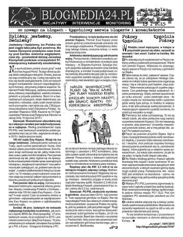 wpisz tylko blogmedia24.pl i zostañ z nami! 13 I 2015 ========================================================================================== 234 co nowego na blogach - tygodniowy serwis blogerów i komentatorów ========================================================================================== Byliœmy, jesteœmy. tygodnia Przedsiębiorcy: to było bezbarwne sto dni Po³owy premier Kopacz. Premier Ewa Kopacz przez Bedziemy? Po³owy tygodnia Jesteśmy i będziemy, bo Polska nie jest ciągle taka jaką być powinna. Bo nasza Ojczyzna przeżywa czas trudny pod bardzo wieloma względami, czas zły - powiedział dzisiaj Jarosław Kaczyński podczas uroczystości 57. miesięcznicy katastrofy smoleńskiej. N a wychodźstwie polskie dusze giną!” wołał prymas August Hlond. Te jego słowa są dzisiaj także zaskakująco aktualne. Drodzy, jeszcze raz więc zmobilizujmy się. Czeka nas ważny rok, liczy się każde zaangażowanie. Dziś od naszych drogich kombatantów różnych niepodległościowych formacji, otrzymamy potężne wsparcie: Testament Polski Walczącej, zadanie przeniesienia etosu żołnierzy niepodległości, wartości chrześcijańskich w przyszłe pokolenia. Skoro im w beznadziejnych sytuacjach, dzięki determinacji, poświęceniu i odwadze, udało ocalić świat narodowych pryncypiów, nam także się uda. Z Bożą pomocą odzyskamy ludzi! Odzyskamy Polskę! - ks. Jarosław Wąsowicz SDB, Kazanie na VII Ogólnopolskiej Patriotycznej Pielgrzymce Kibiców na Jasną Górę 10 stycznia 2015 r. Szewczak: Ekonomiczna i absurdalna wojna z własnym narodem jest nadal kontynuowana w najlepsze. Według przedstawicieli rządu PO-PSL oraz bankowych analityków polska gospodarka kręci się aż miło, zagrożenia minęły, a w 2015 r. będzie jeszcze lepiej. 100 dni rządu Ewy Kopacz. Wciąż nie ma czego świętować. Zabezpieczanie sukcesji po Tusku, sporo ruchów personalnych i liczne, choć niezbyt udane przymiarki wizerunkowe. Ewa Kopacz wciąż zachowuje się tak, jakby miała mnóstwo czasu i pełen komfort działania. Pani premier zachowuje się tak, jakby nigdzie się nie śpieszyła.Ale w towarzystwie minister spraw wewnętrznych mówiącej o „bezgłowych samolotach” oraz pełnomocniczek czekających, aż „problem sam się rozwiąże”, z szefami platformerskich frakcji tuż za plecami i na 10 miesięcy przed wyborami nowa premier zdaje się zmierzać całkiem raźnym krokiem w kierunku poważnych politycznych kłopotów. Pani premier idzie na wojnę. Zamieszanie z lekarzami rodzinnymi, zapowiedź reformy górnictwa, kłopoty z ewakuacją Polaków z Donbasu – właśnie mija 100 dni rządu Ewy Kopacz.– Co teraz? A więc wojna! Czas na poważne zmiany w górnictwie– odpowiada jeden ze współpracowników Ewy Kopacz na pytanie o najbliższeplany szefowej rządu. Sondaż: 46 proc. badanych nie wskazało najlepszego kandydata na premiera. Jak wynika z raportu IBRiS dla „Rzeczpospolitej”, 27 proc. badanych uważa, że po wyborach w 2015 r. premierem powinna być dalej Ewa Kopacz. 10 proc. ankietowanych wskazało Jarosława Kaczyńskiego z PiS, a 8 proc. Grzegorza Schetynę z PO. prawie godzinę podsumowywała pierwsze sto dni swojego urzędowania. Przedsiębiorcy dokonują takiego bilansu znacznie krócej i o wiele bardziej krytycznie. Arłukowicz dostał dyspozycję zakończenia wojny. Porozumienie z lekarzami przedłuży pobyt Arłukowicza w ministerstwie na kolejne parę miesięcy - dr Zbigniew Kuźmiuk. Sytuacja chorych pacjentów stawała się bowiem coraz bardziej dramatyczna, a minister musiał podejmować coraz bardziej absurdalne decyzje (jak np. konieczność wyjazdów karetek ratujących życie z lekarzami którzy mieli stwierdzić zgon w związku z tym, że na danym terenie nie było żadnego lekarza rodzinnego z zawartym z NFZ kontraktem), żeby tylko system opieki zdrowotnej kompletnie się nie załamał. Porozumienie z lekarzami rodzinnymi zostało więc zawarte i Arłukowicz przedłużył swój pobyt w ministerstwie na kolejne parę miesięcy. Rządowy plan dla KW: 2,3 mld zł na zamknięcie 4 kopalni, odprawy i urlopy. Możliwości dofinansowania Kompanii Węglowej się wyczerpały, bez restrukturyzacji KW upadnie w ciągu miesiąca - stwierdza przyjęty w środę przez rząd plan naprawy spółki. Kosztem 2,3 mld zł zakłada likwidację 4 kopalń, przeniesienie 6 tys. ludzi i osłony dla 5,2 tys. zwalnianych. Szewczak: PO-PSL skutecznie wyrolowała górników. Jeszcze latem 2014 r. były premier D. Tusk zapewniał górników na Śląsku: Nie ma niepodległej Polski bez własnych źródeł energii, można powiedzieć, że jeszcze Polska nie zginęła, póki wy jesteście, póki jest polski węgiel”. Rząd skutecznie robił w konia, bezczelnie obiecywał i oszukiwał, łudził górników na Śląsku, że ich nie opuści i pomoże. Bawili tam również v-ce premier J. Piechociński, który przez lata sprawował nadzór nad sektorem górnictwa kamiennego, jak i vce premier E. Bieńkowska. 2 W Kłodzku zmarł mężczyzna, w kolejce w przychodni poczuł się słabo, wyszedł na zewnątrz i tam zmarł. Czekał na karetkę. Nie doczekał. Po dramatycznych wydarzeniach w Paryżu niektórzy politycy postanowili pomaszerować. Wśród nich premier Kopacz. Właściwie nic dziwnego, lepszy spacer w Paryżu niż rozmowy z górnikami na Śląsku. Takie marsze do dość „zabawna” sprawa. Często zdarza się, że po zabójstwie młodego człowieka inni młodzi ludzie spontanicznie organizują marsz i idą w milczeniu pod hasłami „stop przemocy”. Takie marsze pokazują ich zupełne zagubienie. Coś podobnego kiedyś podpatrzyli, to i sobie pomaszerują. Gdyby zamiast spacerować po rynku wrzucali - przez zamknięte okna - do urzędu miasta na i komisariaty kartki z pytaniem gdzie wtedy była policja, to miałoby to większy sens. A tak tylko pokazuje wielką bezradność. A maszerującym zapewnia czystość sumienia, bo zrobili już wszystko co