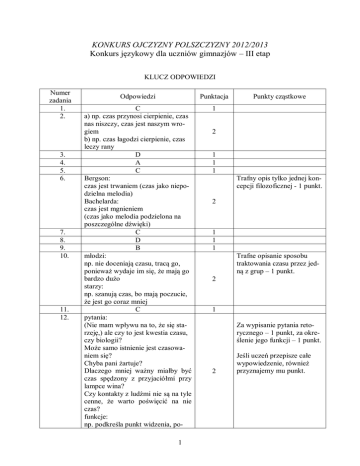 KONKURS OJCZYZNY POLSZCZYZNY 2012/2013 Konkurs językowy dla uczniów gimnazjów – III etap KLUCZ ODPOWIEDZI Numer zadania 1. 2. 3. 4. 5. 6. 7. 8. 9. 10. 11. 12. Odpowiedzi Punktacja C a) np. czas przynosi cierpienie, czas nas niszczy, czas jest naszym wrogiem b) np. czas łagodzi cierpienie, czas leczy rany D A C Bergson: czas jest trwaniem (czas jako niepodzielna melodia) Bachelarda: czas jest mgnieniem (czas jako melodia podzielona na poszczególne dźwięki) C D B młodzi: np. nie doceniają czasu, tracą go, ponieważ wydaje im się, że mają go bardzo dużo starzy: np. szanują czas, bo mają poczucie, że jest go coraz mniej C pytania: (Nie mam wpływu na to, że się starzeję,) ale czy to jest kwestia czasu, czy biologii? Może samo istnienie jest czasowaniem się? Chyba pani żartuje? Dlaczego mniej ważny miałby być czas spędzony z przyjaciółmi przy lampce wina? Czy kontakty z ludźmi nie są na tyle cenne, że warto poświęcić na nie czas? funkcje: np. podkreśla punkt widzenia, po- 1 1 Punkty cząstkowe 2 1 1 1 Trafny opis tylko jednej koncepcji filozoficznej - 1 punkt. 2 1 1 1 Trafne opisanie sposobu traktowania czasu przez jedną z grup – 1 punkt. 2 1 Za wypisanie pytania retorycznego – 1 punkt, za określenie jego funkcji – 1 punkt. 2 Jeśli uczeń przepisze całe wypowiedzenie, również przyznajemy mu punkt. Numer zadania 13. 14. 15. 16. 17. 18. 19. 20. Odpowiedzi Punktacja glądy lub hipotezy; wyraża wątpliwość, wahanie; podważa poglądy rozmówcy np. Zresztą to „teraz” nie istnieje. Ono już minęło. To „teraz” nieubłaganie znika. Jesteśmy wciąż jak na ostrzu noża. Ciągle odchodzimy. usuwać, unicestwiać, likwidować, niszczyć np. a) zaatakować, nacierać b) nie darować nikomu, nie oszczędzić nikogo c) bezwzględnie, bez litości, obcesowo (stały) postęp spękań twardo pod stopami (zasługujących) (aby sam) mógł je uprzątnąć A np. jest destrukcyjne, niszczące np. przewagę człowieka stanowi sam fakt jego istnienia/życia, które podlega czasowi, ale nie od razu mu się poddaje Czas nas niszczy. Punkty cząstkowe 1 1 2 1 Jeśli uczeń odniesie się do innego znaczenia czasownika (wytrzymywać), nie przyznajemy punktu. Za trafne wyjaśnienie dwóch związków frazeologicznych – 1 punkt. Wypisanie lub pominięcie wyrazów ujętych w kluczu w nawias nie wpływa na przyznanie punktów. 1 1 1 1 Zad. 21. Błędy podkreślone i poprawione. Błędy podkreślone Będąc w Krakowie, moją uwagę zwróciła ciekawa wystawa. W Muzeum Narodowym zaprezentowano ocalałe grafiki Bruna Schulza. Zrobiły na mnie takie wrażenie, że przeszła mi po plecach gęsia skórka. Punktacja 1 1 1 Błędy poprawione Kiedy (gdy) byłem w Krakowie, moją…. Będąc w Krakowie, zwróciłem uwagę… Brunona przeszedł mi po plecach dreszcz przeszedł mnie dreszcz dostałem gęsiej skórki obaj, obydwaj Tego dnia rysunki podziwiało oprócz 1 mnie jeszcze dwóch mężczyzn – oboje byli nimi zachwyceni. Byłem tak pochłonięty oglądaniem 1 nie przywiązywałem wagi obrazów, że nie przywiązywałem uwagi do upływającego czasu i spóźniłem się na pociąg. Razem: 30 punktów 2 Uwagi dla poprawiających: za właściwe podkreślenie i poprawienie błędu przyznaje się 1 punkt; za poprawnie podkreślony, lecz niewłaściwie poprawiony błąd nie przyznaje się punktu; za każde zbędne podkreślenie lub błędną poprawkę odejmuje się 1 punkt; za całe zadanie uczeń nie może otrzymać mniej niż 0 punktów (czyli punktów ujemnych). Kryteria oceny rozprawki – 10 punktów a) Treść (0-4 punkty): 1. zrozumienie tematu, jego dwuznaczności, 2. trafność doboru przykładów, 3. bogactwo argumentów, 4. dojrzałość sądów i przemyśleń. b) Forma (0-4 punkty): 1. kompozycja i akapitowanie, 2. styl i konwencja (tzw. forma wypowiedzi), 3.słownictwo i gramatyka, 4. ortografia i interpunkcja. c) wartości szczególne (0-2 punkty): 1. oryginalność realizacji i funkcjonalność przyjętej formy wypowiedzi, 2. przejawy uzdolnień pisarskich. Uwagi dla poprawiających: w ocenie wypracowania punkty wystawia się osobno w pozycjach a), b), c) i sumuje się w ocenie całości; w poz. c) należy wskazać pod wypracowaniem konkretne punktowane wartości: w czym i jak przejawia się oryginalność realizacji lub funkcjonalność formy, jak przejawiają się uzdolnienia. 3