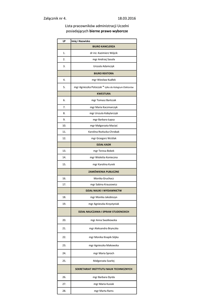 18.03.2016 Załącznik nr 4. Lista pracowników administracji Uczelni