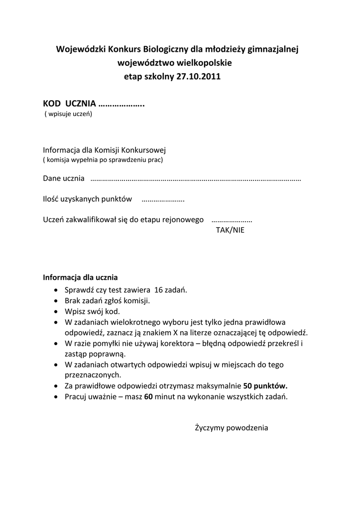 Wojewódzki Konkurs Biologiczny dla młodzieży gimnazjalnej województwo wielkopolskie etap szkolny 27.10.2011 KOD UCZNIA ……………….. ( wpisuje uczeo) Informacja dla Komisji Konkursowej ( komisja wypełnia po sprawdzeniu prac) Dane ucznia ……………………………………………………………………………………………… Ilośd uzyskanych punktów …………………. Uczeo zakwalifikował się do etapu rejonowego ………………… TAK/NIE Informacja dla ucznia Sprawdź czy test zawiera 16 zadao. Brak zadao zgłoś komisji. Wpisz swój kod. W zadaniach wielokrotnego wyboru jest tylko jedna prawidłowa odpowiedź, zaznacz ją znakiem X na literze oznaczającej tę odpowiedź. W razie pomyłki nie używaj korektora – błędną odpowiedź przekreśl i zastąp poprawną. W zadaniach otwartych odpowiedzi wpisuj w miejscach do tego przeznaczonych. Za prawidłowe odpowiedzi otrzymasz maksymalnie 50 punktów. Pracuj uważnie – masz 60 minut na wykonanie wszystkich zadao. Życzymy powodzenia Zadanie 1 0–3 Na diagramie przedstawiono procentowy udział związków, wchodzących w skład organizmu człowieka. Dokonaj analizy i uzupełnij podpunkty. A. Podstawowym związkiem organizmu jest ………………………………………………… B. Wymieo związki energetyczne organizmu ………………………………………………… ………………………………………………………………………………………………………………………. Zadanie 2 0-5 Dokonaj klasyfikacji przedstawionych organizmów, wpisując obok królestwo do którego należą. A. ameba - ………………………………………………………………………………………………… B. muchomor sromotnikowy - ……………………………………………………………………. C. dwoinka zapalenia płuc - …………………………………………………………………………. D. żaba trawna - ………………………………………………………………………………………….. E. dąb szypułkowy - ……………………………………………………………………………………. Zadanie 3 0–2 Powstanie owoców i nasion poprzedza proces zapylenia i zapłodnienia. Wyjaśnij na czym te procesy polegają. A. Zapylenie ………………………………………………………………………………………………….. B. Zapłodnienie ……………………………………………………………………………………………… Strona 2 z 9 Zadanie 4 0-4 Na schematycznym rysunku przedstawione są komórki. Rozpoznaj je, podaj nazwę i funkcję jaką pełnią w organizmie człowieka. A B C D A. nazwa - ……………………………………………………………………………………………………….. funkcja - ……………………………………………………………………………………………………….. B. nazwa -………………………………………………………………………………………………………… funkcja - ……………………………………………………………………………………………………….. C. nazwa - …………………………………………………………………………………………………………. funkcja - ……………………………………………………………………………………………………….. D. nazwa - …………………………………………………………………………………………………………. funkcja - ………………………………………………………………………………………………………… Zadanie 5 Grzyby są organizmami plechowymi. Oznacza to, że: 0–1 a. ciało zbudowane jest z wielu komórek, które jednak nie tworzą tkanek i organów b. pozyskują pokarm z martwej materii organicznej c. mają małe wymagania co do warunków życia d. są wrażliwe na zanieczyszczenia atmosfery Strona 3 z 9 Zadanie 6 Uzupełnij tabelę, wpisując właściwą nazwę tkanki. 0–5 tkanka miękiszowa, tkanka twórcza, tkanka okrywająca, tkanka łączna, tkanka przewodząca, tkanka mięśniowa gładka, tkanka mięśniowa prążkowana Opis tkanki A. Zbudowana jest z wielojądrowych włókien, kurczy się zależnie od naszej woli. Nazwa tkanki B. Służy do przewodzenia wody i substancji odżywczych C. Jest odpowiedzialna za wzrost rośliny, głównym zadaniem komórek jest dzielenie się. Z komórek potomnych powstają nowe fragmenty tkanek. D. Występuje we wszystkich częściach rośliny. Budują ją żywe komórki wyspecjalizowane w pełnieniu różnych funkcji. E. Zapewnia wymianę informacji pomiędzy organizmem a jego otoczeniem –chroni roślinę przed negatywnym wpływem świata zewnętrznego Zadanie 7 Rośliny o łodygach podziemnych przedstawiono w podpunkcie: a. klon, czosnek b. ziemniak , imbir c. ziemniak, kukurydza d. truskawka, cebula 0–1 Strona 4 z 9 Zadanie 8 0–4 W tabeli przedstawiono charakterystykę procesów zachodzących w komórkach: fermentacji mlekowej, fermentacji alkoholowej, oddychania tlenowego i fotosyntezy. Dokonaj analizy tabeli i w podpunktach a, b, c, d wpisz właściwą nazwę procesu. proces substraty produkty przebieg procesu A. glukoza kwas mlekowy w cytoplazmie, bez udziału tlenu B. glukoza alkohol etylowy, w cytoplazmie, bez dwutlenek węgla udziału tlenu C. glukoza, tlen dwutlenek węgla, głównie w woda mitochondriach, w obecności tlenu D. dwutlenek glukoza, tlen w chloroplastach, węgla, woda w obecności światła Zadanie 9 Na wykresie przedstawiono zawartośd wody w wybranych narządach 0–1 Sformułuj problem badawczy, który dzięki przedstawionym na wykresie wynikom może zostad rozwiązany. ………………………………………………………………………