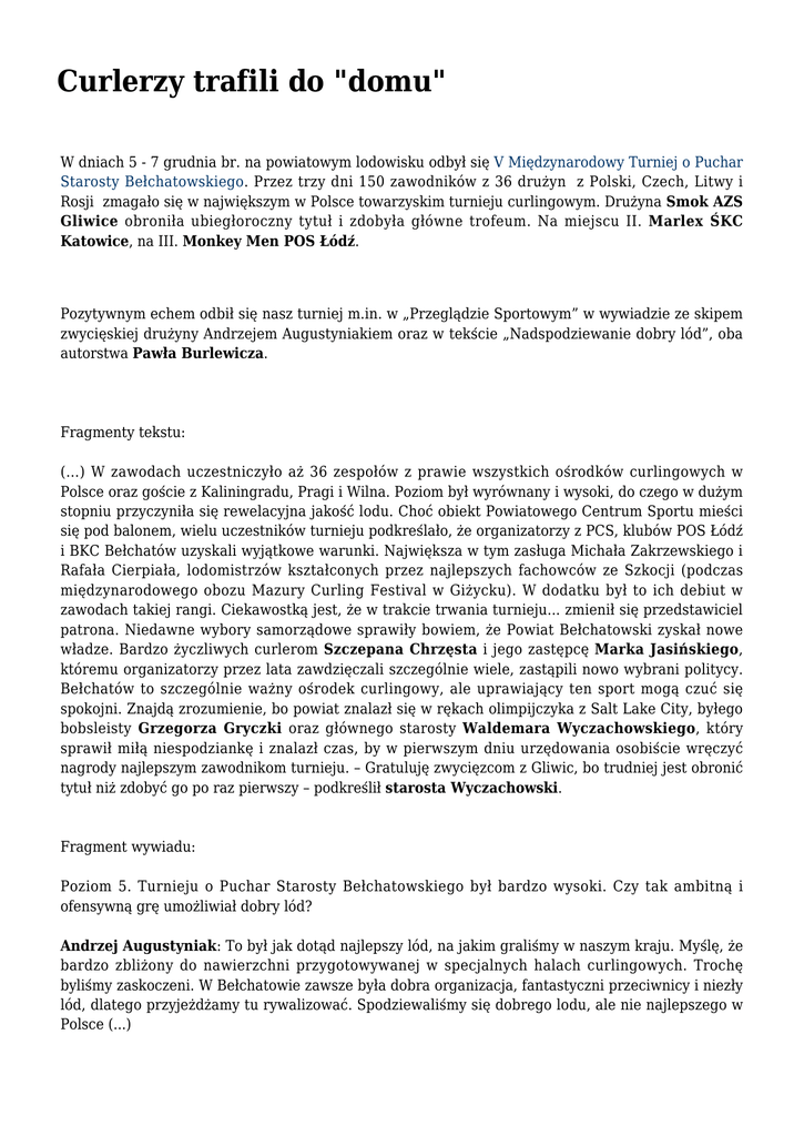 Curlerzy trafili do "domu" W dniach 5 - 7 grudnia br. na powiatowym lodowisku odbył się V Międzynarodowy Turniej o Puchar Starosty Bełchatowskiego. Przez trzy dni 150 zawodników z 36 drużyn z Polski, Czech, Litwy i Rosji zmagało się w największym w Polsce towarzyskim turnieju curlingowym. Drużyna Smok AZS Gliwice obroniła ubiegłoroczny tytuł i zdobyła główne trofeum. Na miejscu II. Marlex ŚKC Katowice, na III. Monkey Men POS Łódź. Pozytywnym echem odbił się nasz turniej m.in. w „Przeglądzie Sportowym” w wywiadzie ze skipem zwycięskiej drużyny Andrzejem Augustyniakiem oraz w tekście „Nadspodziewanie dobry lód”, oba autorstwa Pawła Burlewicza. Fragmenty tekstu: (…) W zawodach uczestniczyło aż 36 zespołów z prawie wszystkich ośrodków curlingowych w Polsce oraz goście z Kaliningradu, Pragi i Wilna. Poziom był wyrównany i wysoki, do czego w dużym stopniu przyczyniła się rewelacyjna jakość lodu. Choć obiekt Powiatowego Centrum Sportu mieści się pod balonem, wielu uczestników turnieju podkreślało, że organizatorzy z PCS, klubów POS Łódź i BKC Bełchatów uzyskali wyjątkowe warunki. Największa w tym zasługa Michała Zakrzewskiego i Rafała Cierpiała, lodomistrzów kształconych przez najlepszych fachowców ze Szkocji (podczas międzynarodowego obozu Mazury Curling Festival w Giżycku). W dodatku był to ich debiut w zawodach takiej rangi. Ciekawostką jest, że w trakcie trwania turnieju... zmienił się przedstawiciel patrona. Niedawne wybory samorządowe sprawiły bowiem, że Powiat Bełchatowski zyskał nowe władze. Bardzo życzliwych curlerom Szczepana Chrzęsta i jego zastępcę Marka Jasińskiego, któremu organizatorzy przez lata zawdzięczali szczególnie wiele, zastąpili nowo wybrani politycy. Bełchatów to szczególnie ważny ośrodek curlingowy, ale uprawiający ten sport mogą czuć się spokojni. Znajdą zrozumienie, bo powiat znalazł się w rękach olimpijczyka z Salt Lake City, byłego bobsleisty Grzegorza Gryczki oraz głównego starosty Waldemara Wyczachowskiego, który sprawił miłą niespodziankę i znalazł czas, by w pierwszym dniu urzędowania osobiście wręczyć nagrody najlepszym zawodnikom turnieju. – Gratuluję zwycięzcom z Gliwic, bo trudniej jest obronić tytuł niż zdobyć go po raz pierwszy – podkreślił starosta Wyczachowski. Fragment wywiadu: Poziom 5. Turnieju o Puchar Starosty Bełchatowskiego był bardzo wysoki. Czy tak ambitną i ofensywną grę umożliwiał dobry lód? Andrzej Augustyniak: To był jak dotąd najlepszy lód, na jakim graliśmy w naszym kraju. Myślę, że bardzo zbliżony do nawierzchni przygotowywanej w specjalnych halach curlingowych. Trochę byliśmy zaskoczeni. W Bełchatowie zawsze była dobra organizacja, fantastyczni przeciwnicy i niezły lód, dlatego przyjeżdżamy tu rywalizować. Spodziewaliśmy się dobrego lodu, ale nie najlepszego w Polsce (...) Polecamy do obejrzenia fotogalerię. Krzysztof Borowski Rzecznik prasowy Starostwo Powiatowe w Bełchatowie