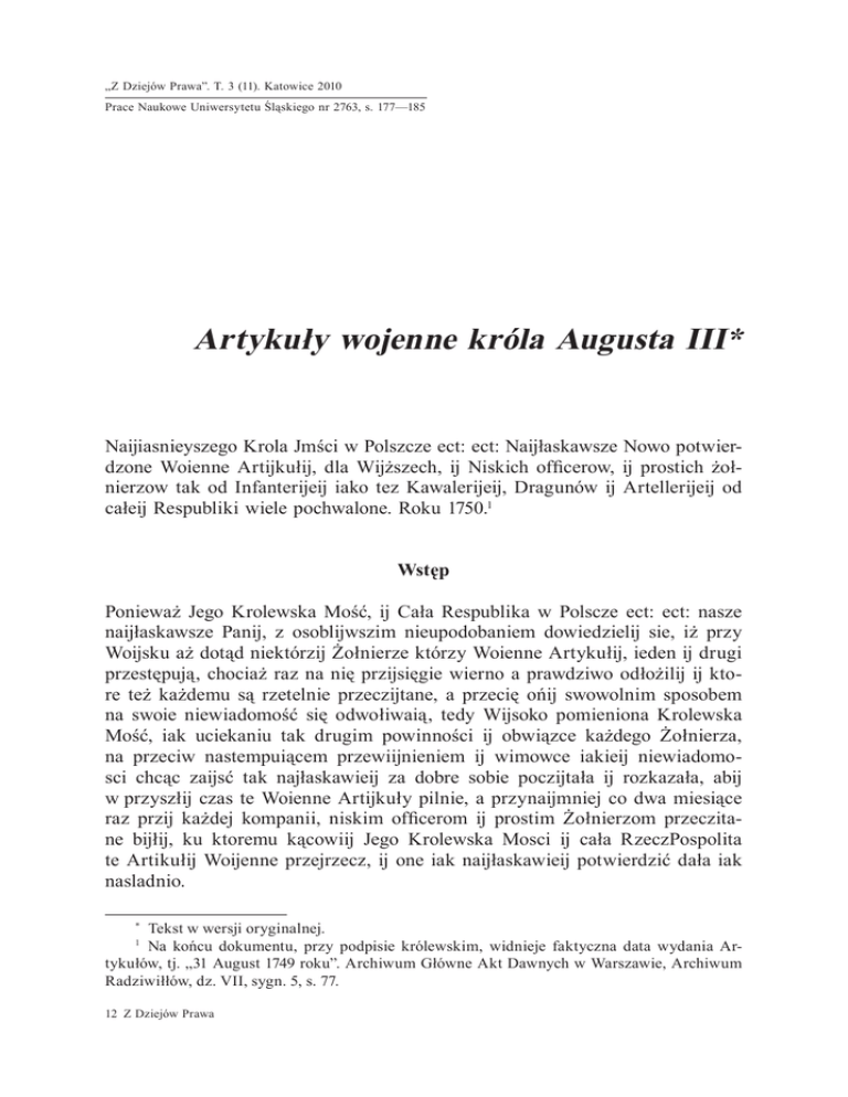 „Z Dziejów Prawa”. T. 3 (11). Katowice 2010 Prace Naukowe Uniwersytetu Śląskiego nr 2763, s. 177—185 Artykuły wojenne króla Augusta III* Naijiasnieyszego Krola Jmści w Polszcze ect: ect: Naijłaskawsze Nowo potwierdzone Woienne Artijkułij, dla Wijższech, ij Niskich officerow, ij prostich żołnierzow tak od Infanterijeij iako tez Kawalerijeij, Dragunów ij Artellerijeij od całeij Respubliki wiele pochwalone. Roku 1750. Wstęp Ponieważ Jego Krolewska Mość, ij Cała Respublika w Polscze ect: ect: nasze naijłaskawsze Panij, z osoblijwszim nieupodobaniem dowiedzielij sie, iż przy Woijsku aż dotąd niektórzij Żołnierze którzy Woienne Artykułij, ieden ij drugi przestępują, chociaż raz na nię przijsięgie wierno a prawdziwo odłożilij ij ktore też każdemu są rzetelnie przeczijtane, a przecię ońij swowolnim sposobem na swoie niewiadomość się odwołiwaią, tedy Wijsoko pomieniona Krolewska Mość, iak uciekaniu tak drugim powinności ij obwiązce każdego Żołnierza, na przeciw nastempuiącem przewiijnieniem ij wimowce iakieij niewiadomosci chcąc zaijsć tak najłaskawieij za dobre sobie poczijtała ij rozkazała, abij w przyszłij czas te Woienne Artijkuły pilnie, a przynaijmniej co dwa miesiące raz przij każdej kompanii, niskim officerom ij prostim Żołnierzom przeczitane bijłij, ku ktoremu kącowiij Jego Krolewska Mosci ij cała RzeczPospolita te Artikułij Woijenne przejrzecz, ij one iak naijłaskawieij potwierdzić dała iak nasladnio. Tekst w wersji oryginalnej. Na końcu dokumentu, przy podpisie królewskim, widnieje faktyczna data wydania Artykułów, tj. „31 August 1749 roku”. Archiwum Główne Akt Dawnych w Warszawie, Archiwum Radziwiłłów, dz. VII, sygn. 5, s. 77. * 12 Z Dziejów Prawa 178 Artykuły wojenne króla Augusta III Artykuł I Każdy żołnierz, ij ktokolwiek przy Regimentach, Bataliach ij Kompaniach zostaie ma zawsze Chrześcijanski ij pobożnij żijwot prowadzić, a wszelakiego ij niezbożnego żijwota wstrzijmować ij wijstrzegać, na odprawowanie Publiczneij Służbij Bożeij ma się pilnie stawiać ij przijchodzić, od nadaremno brania Imienia Naijświętszego Bożego ij Jego chwalebnego y Świętego Sakramentu złorzeczeniem i przysięganiem, pod karą więzienia, Palow ij Rozg biegania albo insziech ułożonich kar ma się wcale wstrzimować. Artykuł II Ktorij żołnierz Imię Boże zaklinaniem zbroij, twardo czynieniem albo inszemi zakazanemi fortelami szatańskiemi ij czarowaniem nadaremno bierze Boski Majestat, wszistkowiadomość wszędzi bijtność ij tim podobne własności, Christusowo Zasługe Sakramenta ij Słowo Boże Bluznij ij Sromoci, ten Żijwot tracij. Artykuł III Każdy Żołnierz Krola Jego Mości, iako naijwiższey Głowie ij Panu Woijska, wiernim, skląnijm, ij zawsze posłusznijm ma bijć, Naijaśnieijszemu Krolowiij należito cześć oddawać, Jego i całeij Rzeczij Pospoliteij pozitku szukać, szkode ij utrate oddalać anij się mu w żadno umowe szkodliwo wdawać iak na przeciwko Krola Jego Mości, tak też całeij Rzeczij Pospoliteij, Woijsku, Królestwu ij Ziemieij, ale raczej wszijstko co tylko szkodliwego iest, czego się tilko dowie ma oznaijmić, pod karo na Sławie, ciele ij Żijwocie. Artykuł IV Przijtim ma ij musij kazdij Żołnierz Krola Jmci, wszistko Komande maiąco Generalitete iako naijasnieijszego Krola Imici własną Osobę wisoką czcie ij ieij posłusznim bijć a nij się Jeij sprzeciwiać, pod karą na ciele, ij Zijwocię. Artykuł V Salve-Garders, albo obronne Lijstij, ktore od Naijiasnieijszego Krola Jmścii sameij Osobij, albo na rozkazanie ij order Jego od Generalitetij wijstawione i wij- Artykuły wojenne króla Augusta III 179 dane będo, maią czcić ij respektować ij w wielkieij powadze trzymane pod karą na ciele ij Żijwocie. Artykuł VI Do Tego maią wszijsci niszi Officerowie ij prosci Zołnierze wysokich Officerow od pierwszego aż do ostatnego lub od tegoż Regimentu lub od drugiego, powinnem Respectem ij posłuszenstwim wenerować ij potikać. Artykuł VII Ktorij bij się wysokim albo według okaziji niskim officerom postanowioneij ij urzędneij Komendzie sprzeciwił, choćbij tilko słowami albo resonowaniem, ten rozg bieganiem, ktore według kondiciji obrażonego ij według okoliczności, aż do 30 razow podwiszone, skazanij ma bijć, kto spadę swoią obnaża, albo takieij wsameij rzeczij zazijwa, takoweij komendzie się sprzeciwiaiąc, ma bijć przestrzelonij. Artykuł VIII Rożne biijcia ij niepotrzebne hałasy karaniem rozg bieganiem zakazane będo, kto te pocznie przy tijch karach ij kapitulaciją swoią utraci; gdijż każdij żołnierz swoią zbroią ku potrzbie ij obronie ma zażijwać gdijbij ale swowolnim ij umyślnem sposobem swego kamerata, to iest towarzysza albo kogo inszego, obraził, albo przebił ma bijć według znalezonich okliczności przez Prawo woienne na ciele ij żywocie sakranij. Artykuł IX Osobliwie ale maią ci ktorzij na pojedynek idą albo się dueluią a przebitij albo zabitij ieden z nich będzie, bez miłosierdzia obieszonij, gdij ale żaden przebicie się nie stanie, ieżelij kto będzie zranionij albo nie według okoliczności znalezionich, wieczno robotą szancową, albo inszo częstą karą na ciele, a cij którzy kapitulaciją maią, utratą oneij, skarani bijć. 12* 180 Artykuły wojenne króla Augusta III Artykuł X Granie w kartij, albo w kostki pod karą rozg biegania zakazane będzie. Artykuł XI Ktory żołnierz po biciu bębna do spania albo po Czopie przijbicia w swoieij kwaterze znaleziony nie będzie na rozg bieganiem skaranij bijć. Artykuł XII Do roboty, albo w polu, albo przij oblężeniu albo w Garnizonie ma się każdij Żołnierz słusznego czasu dobrowolnie ij chętnie stawiijć pod karą rozg biegania, kto się ale słowami albo czijm inszijm sprzeciwi, będzie na ciele ij żijciu skaranij. Artykuł XIII Przy obsadzoneij warcie, osobliwie czasu nocnego, żaden nie ma hałasu niepotrzebnego czijnić p