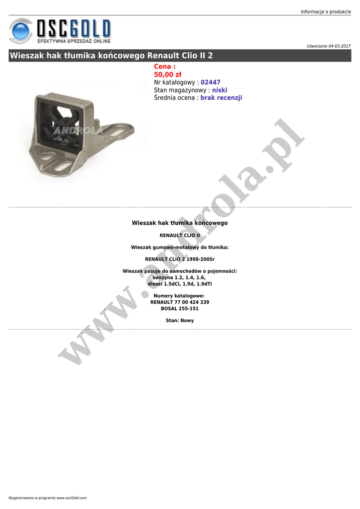 Informacje o produkcie Utworzono 04-03-2017 Wieszak hak tłumika końcowego Renault Clio II 2 Cena : 50,00 zł ro la .p l Nr katalogowy : 02447 Stan magazynowy : niski Średnia ocena : brak recenzji Wieszak hak tłumika końcowego nd RENAULT CLIO II Wieszak gumowo-metalowy do tłumika: RENAULT CLIO 2 1998-2005r w .a Wieszak pasuje do samochodów o pojemności: benzyna 1.2, 1.4, 1.6, diesel 1.5dCi, 1.9d, 1.9dTi w w Numery katalogowe: RENAULT 77 00 424 339 BOSAL 255-151 Wygenerowano w programie www.oscGold.com Stan: Nowy