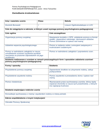 Pomoc Psychologiczno-Pedagogiczna PLAN DZIAŁAŃ WSPIERAJĄCYCH, autor: Anna Tulczyńska Zaniedbania środowiskowe Imię i nazwisko ucznia Klasa Szkoła Dominik Borowski I Liceum Ogólnokształcące nr LXV Cele do osiągnięcia w zakresie, w którym uczeń wymaga pomocy psychologiczno-pedagogicznej Cele ogólne Cele szczegółowe Organizacja pomocy socjalnej. Nawiązanie kontaktu z OPS, udzielenie pomocy w formie zasiłku, stypendium szkolnego, darmowych obiadów. Pomoc Dominikowi w opiece nad mamą. Udzielnie wsparcia psychologicznego. Pomoc w radzeniu sobie z emocjami związanymi z trudnościami codziennymi. Pomoc w nadrobieniu zaległości w nauce, Pomoc w nadrobieniu zaległości i poprawieniu ocen. umożliwienie uczniowi uzyskania wyników nauczania na poziomie odpowiednim do jego możliwości. Działania realizowane z uczniem w ramach poszczególnych form i sposobów udzielania uczniowi pomocy psychologiczno-pedagogicznej Formy i sposoby Działania Przydzielenie pomocy socjalnej. Zapewnienie środków na utrzymanie rodziny, zakup podręczników. Przydzielenie asystenta rodziny. Pomoc asystenta w prowadzeniu domu i opiece nad mamą. Pomoc rówieśnicza. Wyznaczenie przez wychowawcę uczniów, którzy będą wspierać Dominika w nauce tych przedmiotów, z którymi ma najwięcej trudności. Działania wspierające rodziców ucznia Konsultacje wychowawcy z mamą i asystentem rodziny w miarę potrzeb. Zakres współdziałania z innymi instytucjami Ośrodek Pomocy Społecznej. www.pracujezklasa.pl