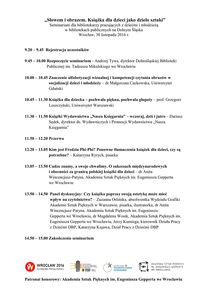 „Słowem i obrazem. Książka dla dzieci jako dzieło sztuki” Seminarium dla bibliotekarzy pracujących z dziećmi i młodzieżą w bibliotekach publicznych na Dolnym Śląsku Wrocław, 30 listopada 2016 r. 9.20 – 9.45 Rejestracja uczestników 9.45 – 10.00 Rozpoczęcie seminarium - Andrzej Tyws, dyrektor Dolnośląskiej Biblioteki Publicznej im. Tadeusza Mikulskiego we Wrocławiu 10.00 – 10.45 Znaczenie alfabetyzacji wizualnej i kompetencji czytania obrazów w socjalizacji dzieci i młodzieży – dr Małgorzata Cackowska, Uniwersytet Gdański 10.45 – 11.30 Książka dla dziecka – pochwała piękna, pochwała głupoty – prof. Grzegorz Leszczyński, Uniwersytet Warszawski 11.30 – 11.50 Książki Wydawnictwa „Nasza Księgarnia” – wczoraj, dziś i jutro – Dariusz Sędek, dyrektor ds. Wydawniczych i Promocji Wydawnictwa „Nasza Księgarnia” 11.50 – 12.20 Przerwa 12.20 – 13.05 Kim jest Fredzia Phi-Phi? Ponowne tłumaczenia książek dla dzieci, czy są potrzebne? – Katarzyna Ryrych, pisarka 13.05 – 13.50 Cudze znamy, a swoje chwalimy. O sukcesach międzynarodowych i obecności za granicą polskiej książki dla dzieci – dr Anita Wincencjusz-Patyna, Akademia Sztuk Pięknych im. Eugeniusza Gepperta we Wrocławiu 13.50 – 14.50 Panel dyskusyjny: Czy książka poprzez swoją estetykę może mieć wpływ na czytelnictwo? – Zuzanna Orlińska, absolwentka Wydziału Grafiki Akademii Sztuk Pięknych w Warszawie, pisarka, ilustratorka, dr Anita Wincencjusz-Patyna, Akademia Sztuk Pięknych im. Eugeniusza Gepperta we Wrocławiu, dr Magdalena Wosik, Akademia Sztuk Pięknych im. Eugeniusza Gepperta we Wrocławiu, Jerzy Kumiega, kierownik Działu Pracy z Dziećmi DBP, Katarzyna Kujawa, Dział Pracy z Dziećmi DBP 14.50 – 15.00 Zakończenie seminarium Patronat honorowy: Akademia Sztuk Pięknych im. Eugeniusza Gepperta we Wrocławiu