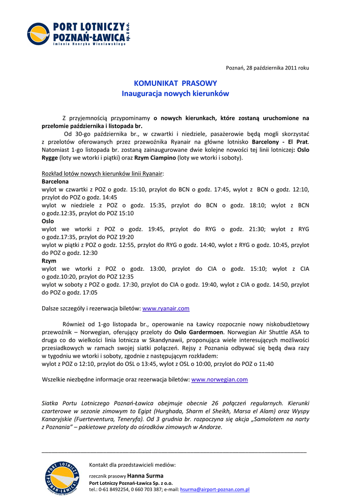Poznań, 28 października 2011 roku KOMUNIKAT PRASOWY Inauguracja nowych kierunków Z przyjemnością przypominamy o nowych kierunkach, które zostaną uruchomione na przełomie października i listopada br. Od 30-go października br., w czwartki i niedziele, pasażerowie będą mogli skorzystać z przelotów oferowanych przez przewoźnika Ryanair na główne lotnisko Barcelony - El Prat. Natomiast 1-go listopada br. zostaną zainaugurowane dwie kolejne nowości tej linii lotniczej: Oslo Rygge (loty we wtorki i piątki) oraz Rzym Ciampino (loty we wtorki i soboty). Rozkład lotów nowych kierunków linii Ryanair: Barcelona wylot w czwartki z POZ o godz. 15:10, przylot do BCN o godz. 17:45, wylot z BCN o godz. 12:10, przylot do POZ o godz. 14:45 wylot w niedziele z POZ o godz. 15:35, przylot do BCN o godz. 18:10; wylot z BCN o godz.12:35, przylot do POZ 15:10 Oslo wylot we wtorki z POZ o godz. 19:45, przylot do RYG o godz. 21:30; wylot z RYG o godz.17:35, przylot do POZ 19:20 wylot w piątki z POZ o godz. 12:55, przylot do RYG o godz. 14:40, wylot z RYG o godz. 10:45, przylot do POZ o godz. 12:30 Rzym wylot we wtorki z POZ o godz. 13:00, przylot do CIA o godz. 15:10; wylot z CIA o godz.10:20, przylot do POZ 12:35 wylot w soboty z POZ o godz. 17:30, przylot do CIA o godz. 19:40, wylot z CIA o godz. 14:50, przylot do POZ o godz. 17:05 Dalsze szczegóły i rezerwacja biletów: www.ryanair.com Również od 1-go listopada br., operowanie na Ławicy rozpocznie nowy niskobudżetowy przewoźnik – Norwegian, oferujący przeloty do Oslo Gardermoen. Norwegian Air Shuttle ASA to druga co do wielkości linia lotnicza w Skandynawii, proponująca wiele interesujących możliwości przesiadkowych w ramach swojej siatki połączeń. Rejsy z Poznania odbywać się będą dwa razy w tygodniu we wtorki i soboty, zgodnie z następującym rozkładem: wylot z POZ o 12:10, przylot do OSL o 13:45, wylot z OSL o 10:00, przylot do POZ o 11:40 Wszelkie niezbędne informacje oraz rezerwacja biletów: www.norwegian.com Siatka Portu Lotniczego Poznań-Ławica obejmuje obecnie 26 połączeń regularnych. Kierunki czarterowe w sezonie zimowym to Egipt (Hurghada, Sharm el Sheikh, Marsa el Alam) oraz Wyspy Kanaryjskie (Fuerteventura, Teneryfa). Od 3 grudnia br. rozpoczyna się akcja „Samolotem na narty z Poznania” – pakietowe przeloty do ośrodków zimowych w Andorze. __________________________________________________________________________________ Kontakt dla przedstawicieli mediów: rzecznik prasowy Hanna Surma Port Lotniczy Poznań-Ławica Sp. z o.o. tel.: 0-61 8492254, 0 660 703 387; e-mail: [email protected]