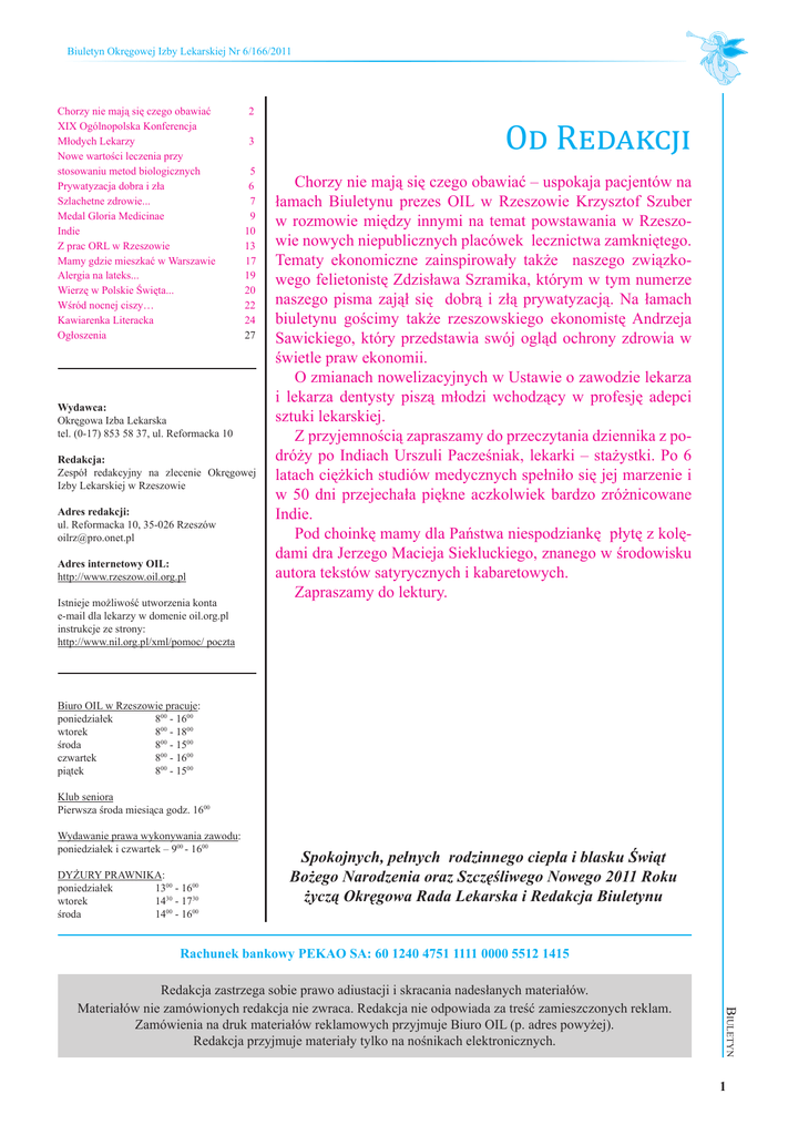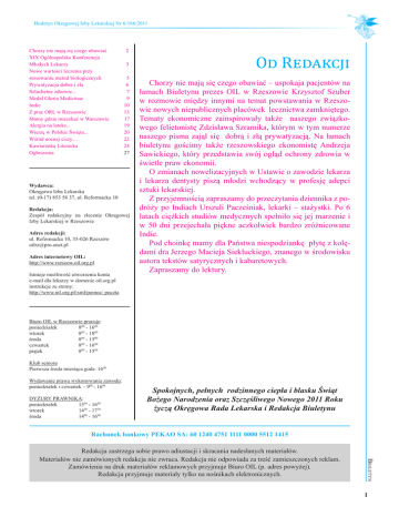 Biuletyn Okręgowej Izby Lekarskiej Nr 6/166/2011 Chorzy nie mają się czego obawiać XIX Ogólnopolska Konferencja Młodych Lekarzy Nowe wartości leczenia przy stosowaniu metod biologicznych Prywatyzacja dobra i zła Szlachetne zdrowie... Medal Gloria Medicinae Indie Z prac ORL w Rzeszowie Mamy gdzie mieszkać w Warszawie Alergia na lateks... Wierzę w Polskie Święta... Wśród nocnej ciszy… Kawiarenka Literacka Ogłoszenia 2 3 5 6 7 9 10 13 17 19 20 22 24 27 Wydawca: Okręgowa Izba Lekarska tel. (0-17) 853 58 37, ul. Reformacka 10 Redakcja: Zespół redakcyjny na zlecenie Okręgowej Izby Lekarskiej w Rzeszowie Adres redakcji: ul. Reformacka 10, 35-026 Rzeszów [email protected] Adres internetowy OIL: http://www.rzeszow.oil.org.pl Istnieje możliwość utworzenia konta e-mail dla lekarzy w domenie oil.org.pl instrukcje ze strony: http://www.nil.org.pl/xml/pomoc/ poczta Od Redakcji Chorzy nie mają się czego obawiać – uspokaja pacjentów na łamach Biuletynu prezes OIL w Rzeszowie Krzysztof Szuber w rozmowie między innymi na temat powstawania w Rzeszowie nowych niepublicznych placówek lecznictwa zamkniętego. Tematy ekonomiczne zainspirowały także naszego związkowego felietonistę Zdzisława Szramika, którym w tym numerze naszego pisma zajął się dobrą i złą prywatyzacją. Na łamach biuletynu gościmy także rzeszowskiego ekonomistę Andrzeja Sawickiego, który przedstawia swój ogląd ochrony zdrowia w świetle praw ekonomii. O zmianach nowelizacyjnych w Ustawie o zawodzie lekarza i lekarza dentysty piszą młodzi wchodzący w profesję adepci sztuki lekarskiej. Z przyjemnością zapraszamy do przeczytania dziennika z podróży po Indiach Urszuli Pacześniak, lekarki – stażystki. Po 6 latach ciężkich studiów medycznych spełniło się jej marzenie i w 50 dni przejechała piękne aczkolwiek bardzo zróżnicowane Indie. Pod choinkę mamy dla Państwa niespodziankę płytę z kolędami dra Jerzego Macieja Siekluckiego, znanego w środowisku autora tekstów satyrycznych i kabaretowych. Zapraszamy do lektury. Biuro OIL w Rzeszowie pracuje: poniedziałek 800 - 1600 wtorek 800 - 1800 środa 800 - 1500 czwartek 800 - 1600 piątek 800 - 1500 Klub seniora Pierwsza środa miesiąca godz. 1600 Wydawanie prawa wykonywania zawodu: poniedziałek i czwartek – 900 - 1600 DYŻURY PRAWNIKA: poniedziałek 1300 - 1600 wtorek 1430 - 1730 środa 1400 - 1600 Spokojnych, pełnych rodzinnego ciepła i blasku Świąt Bożego Narodzenia oraz Szczęśliwego Nowego 2011 Roku życzą Okręgowa Rada Lekarska i Redakcja Biuletynu Rachunek bankowy PEKAO SA: 60 1240 4751 1111 0000 5512 1415 Biuletyn Redakcja zastrzega sobie prawo adiustacji i skracania nadesłanych materiałów. Materiałów nie zamówionych redakcja nie zwraca. Redakcja nie odpowiada za treść zamieszczonych reklam. Zamówienia na druk materiałów reklamowych przyjmuje Biuro OIL (p. adres powyżej). Redakcja przyjmuje materiały tylko na nośnikach elektronicznych. 1 Biuletyn Okręgowej Izby Lekarskiej Nr 6/166/2011 Rozmowa z dr. Krzysztofem Szuberem prezesem ORL w Rzeszowie Czasy się zmieniły Redakcja: Bieżący rok powoli dobiega konca. Czas na pierwsze podsumowania. Rozpocznijmy od spraw finansowych związanych z funkcjonowaniem służby zdrowia. dr Krzysztof Szuber: Na pewno nigdy nie będzie tak, że zabezpieczymy wszystkie żądania pacjentów. Kolejki, co ma związek między innymi z limitem finansowym są i na pewno jeszce długo bedą. Inną sprawą jest fakt - sporo jest takich głosów - że wiele środków publicznych jest źle zagospodarowywanych. Mam na myśli na przykład pewne procedury, które można byłoby wykonywać w trybie ambulatoryjnym jak choćby diagnostyczne. Wykonuje się je w szpitalach, co pochłania środki i blokuje miejsca dla pacjentów. Często zdarza się też, że nie ma właściwej kontroli nad zakupem nieraz bardzo drogiego sprzętu. Jest on niejednokrotnie wykorzystywany w ograniczonym zakresie, bo brakuje kadry do obsługi lub stoi nieużyteczny, bo wymiana zepsutego elementu przekracza możliwości finansowe właściciela. Polska nie jest jedynym przykładem, że finansów brakuje. Nie takie potęgi jak nasz kraj narzekają na brak środków, aby zapewnić każdemu obywatelowi pełen zakres usług medycznych. W pracy lekarzy w tym roku było mniej niepokojów niż w latach ubiegłych? To fakt, było spokojniej, ale oczywiście nie brakowało niepokojów związanych np. ze zmieniającymi się przepisami prawa. Przykładem mogą być zmienione w tym roku zasady ubezpieczeń bez zachowania okresu przejściowego. Wymagało to zmiany przez lekarzy polis ubezpieczeniowych, a od nowego roku jak się dowiadujemy będą nowe. Sporo jest teraz zamętu jeżeli chodzi o ustawę refundacyjną, gdzie dużym problemem jest sprawdzenie ubezpieczenia pacjenta. Problemem jest także interpretacja wystawienia recept refundowanych, gdzie decyzja o tym czy została ona poprawnie napisana nadal jest po stronie urzędników NFZ. Lekarz nie ma możliwości sprawdzenia czy w danym dniu pacjent jest ubezpieczony, poza tym panuje chaos informacyjny jakie leki przysługują przewlekle chorym. Lekarze - związkowcy zachęcaja do bojkotowania tej ustawy, jakie jest stanowisko samorządu lekarskiego? Drugiego grudnia odbędzie się nadzwyczajne posiedzenie Naczelnej Rady Lekarskiej poświęcone temu problemowi. Rozwiązaniem niekorzystnym dla pacjentów jest wypisywanie recept o odpłatności 100%, jeśli nie po2 trafi chory udokumentować faktu, że jest ubezpieczony. Dobrym rozwiązaniem byłoby przeniesienie problemu na płatnika czyli na NFZ. Mogłyby w tym pośredniczyć apteki, które są już na tyle skomputeryzowane, że każdą receptę można by weryfikowanać zgodnością PESEL. W tym przypadku znacznemu uproszczeniu uległaby cała procedura. Druga możliwość - chory jak w Wielkiej Brytanii deklaruje, że jest ubezpieczony i bieże za to pełną odpowiedzialność. Zdjęta zostałaby z lekarzy, 