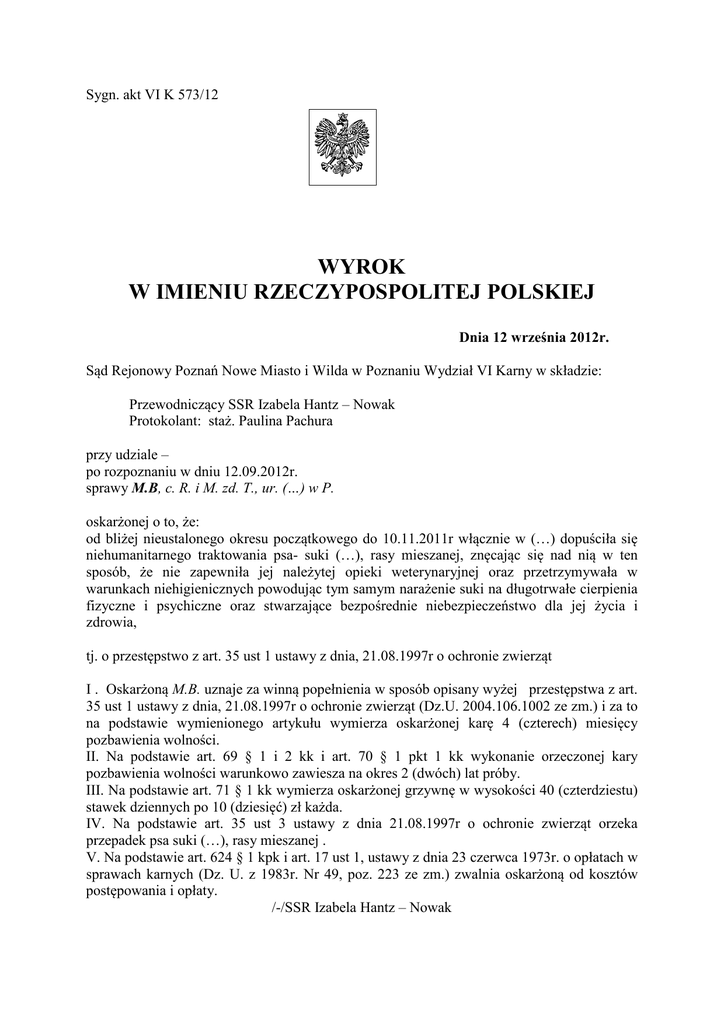 Sygn. akt VI K 573/12 WYROK W IMIENIU RZECZYPOSPOLITEJ POLSKIEJ Dnia 12 września 2012r. Sąd Rejonowy Poznań Nowe Miasto i Wilda w Poznaniu Wydział VI Karny w składzie: Przewodniczący SSR Izabela Hantz – Nowak Protokolant: staż. Paulina Pachura przy udziale – po rozpoznaniu w dniu 12.09.2012r. sprawy M.B, c. R. i M. zd. T., ur. (…) w P. oskarżonej o to, że: od bliżej nieustalonego okresu początkowego do 10.11.2011r włącznie w (…) dopuściła się niehumanitarnego traktowania psa- suki (…), rasy mieszanej, znęcając się nad nią w ten sposób, że nie zapewniła jej należytej opieki weterynaryjnej oraz przetrzymywała w warunkach niehigienicznych powodując tym samym narażenie suki na długotrwałe cierpienia fizyczne i psychiczne oraz stwarzające bezpośrednie niebezpieczeństwo dla jej życia i zdrowia, tj. o przestępstwo z art. 35 ust 1 ustawy z dnia, 21.08.1997r o ochronie zwierząt I . Oskarżoną M.B. uznaje za winną popełnienia w sposób opisany wyżej przestępstwa z art. 35 ust 1 ustawy z dnia, 21.08.1997r o ochronie zwierząt (Dz.U. 2004.106.1002 ze zm.) i za to na podstawie wymienionego artykułu wymierza oskarżonej karę 4 (czterech) miesięcy pozbawienia wolności. II. Na podstawie art. 69 § 1 i 2 kk i art. 70 § 1 pkt 1 kk wykonanie orzeczonej kary pozbawienia wolności warunkowo zawiesza na okres 2 (dwóch) lat próby. III. Na podstawie art. 71 § 1 kk wymierza oskarżonej grzywnę w wysokości 40 (czterdziestu) stawek dziennych po 10 (dziesięć) zł każda. IV. Na podstawie art. 35 ust 3 ustawy z dnia 21.08.1997r o ochronie zwierząt orzeka przepadek psa suki (…), rasy mieszanej . V. Na podstawie art. 624 § 1 kpk i art. 17 ust 1, ustawy z dnia 23 czerwca 1973r. o opłatach w sprawach karnych (Dz. U. z 1983r. Nr 49, poz. 223 ze zm.) zwalnia oskarżoną od kosztów postępowania i opłaty. /-/SSR Izabela Hantz – Nowak UZASADNIENIE W dniu 10 listopada 2011r. do gabinetu weterynaryjnego zadzwoniła kobieta, z fundacji (…), że na ul. (…) jest zaniedbany pies. M.C. pojechał na miejsce tj. na ul. (…) w (…). Wezwano patrol policji w osobach A.J., H.J., przybyli o godz. 18:15. Posesja była ogrodzona, zadzwonili na dzwonek przy furtce. Podszedł chłopiec w wieku ok. 13 lat, który był sam w domu. Po posesji biegał pies typu amstaf. W trakcie rozmowy policjanci usłyszeli dochodzący z głębi posesji skowyt psa. Chłopiec otworzył furtkę i zaprowadził obecnych do psa. Pies znajdował się w komórce wielkości ok. 2 x 2,5 m, znajdowały się tam stare niepotrzebne domowe urządzenia i przedmioty. Pies leżał na ziemi, miał mało powierzchni do poruszania się. Na widok ludzi pies od razu podniósł się i wybiegł, był oszołomiony, ocierał się pyskiem o krzaki i piszczał. W pomieszczeniu nie było śladów jedzenia ani żadnych misek. Chłopiec na polecenie przyniósł miskę z wodą. Pies łapczywie wypił całą miskę, i następną. Chłopiec skontaktował się z matką M.B., która przyjechała po ok. 2 godzinach. Poinformowano Straż Ochrony Zwierząt. Na miejsce przyjechał T.P. Pies zamknięty w komórce był rasy przypominającej owczarka niemieckiego, wabił się (…), był wychudzony, ledwo trzymał się na łapach, posiadał ranę otwartą, świeżą. Oskarżona zobowiązała się opiekować psem, udzielono jej pomocy w dostarczeniu pokarmu i leków. T.P. i J.G. przemyli psu ranę. Rana była otwarta darta od pyska do ucha, miał silne zapalenia zewnętrznych przewodów słuchowych, zaropiałe oczy, wydzieliny ropne, pies był w stanie wyniszczenia i odwodnienia. W dniu 12.11.11r. T.P. przewiózł psa do gabinetu doktora D.F. Wykonano badanie i lekarz potwierdził stwierdzone zaniedbania. Pies (…) został zwrócony właścicielce, która zobowiązała się do opieki zgodnie z wskazówkami lekarza. Lekarz wystawił zaświadczenie, z którego wynika, że pies był silnie odwodniony, wyniszczony, sierść psa brudna i posklejana, miał ranę otwartą na policzku, silne zapalenie zewnętrznych przewodów słuchowych z dużą ilością ropy, stan zapalny spojówek (k. 17). W dniu 21.11.11r. T.P. z lekarzem M.C. udał się do oskarżonej w celu kontroli stanu psa. Weterynarz stwierdził, że stan psa nie uległ poprawie, wbrew zaleceniom pies nadal przebywał na dworze. W dniu 21.11.11r. pies został przyjęty do lecznicy w (…). Lecznica zwróciła się o eutanazję psa z uwagi na jego skrajnie zły stan, pies został uśpiony. Oskarżona otrzymała od straży ochrony zwierząt niezbędną pomoc w postaci leków, za nic nie płaciła, odmówiła wizyty już opłaconej u weterynarza, nie przeniosła psa w ciepłe pomieszczenie. W dniu 10.11.11r. oskarżona napisała oświadczenie, z którego wynika, że dobrowolnie oddaje sukę (…) w ręce Straży Ochrony Zwierząt pod opiekę fundacji (…) i zrzeka się jakichkolwiek praw do niej. Przyznała, że zaniedbała psa i nie zapewniła mu opieki weterynaryjnej doprowadziła do skrajnego zaniedbania, w wyniku czego pies znajdował się w stanie agonalnym (k. 12). Oskarżona została poddana badaniom psychiatrycznym i psychologicznym. Biegli stwierdzili u niej okresowo występujące zaburzenia adaptacyjne typu depresyjnego, in tempore criminis miała zachowaną zdolność rozumienia znaczenia czynu i pokierowania swym postępowaniem (k. 67). Oskarżona M.B. ma (…) lat, jest rozwiedziona, ma dwoje dzieci w wieku 21 i 14 lat, z zawodu jest krawcową, jest pracownikiem fizycznym w firmie (…) z dochodem ok. (…) zł, posiada działkę i samochód (…), nie była karana. Powyższy stan faktyczny Sąd ustalił na podstawie: - częściowo wyjaśnień oskarżonej (k. 122, 50), - zeznań świadków: T.P. (k. 2-3, 9-11 w zw. z k. 122), H.J. (k. 7 w zw. z k. 122), A.W.-G. (k. 26 w zw. z k. 122), M.C. (k. 31 w zw. z k. 122), D.F. (k. 32 w zw. z k. 122), J.G. (k. 45 w zw. z k. 122), A.J. (k. 46 w zw. z k. 122), - dokumentów w postaci: notatka (k. 1, 30, 52), oświadczenie (