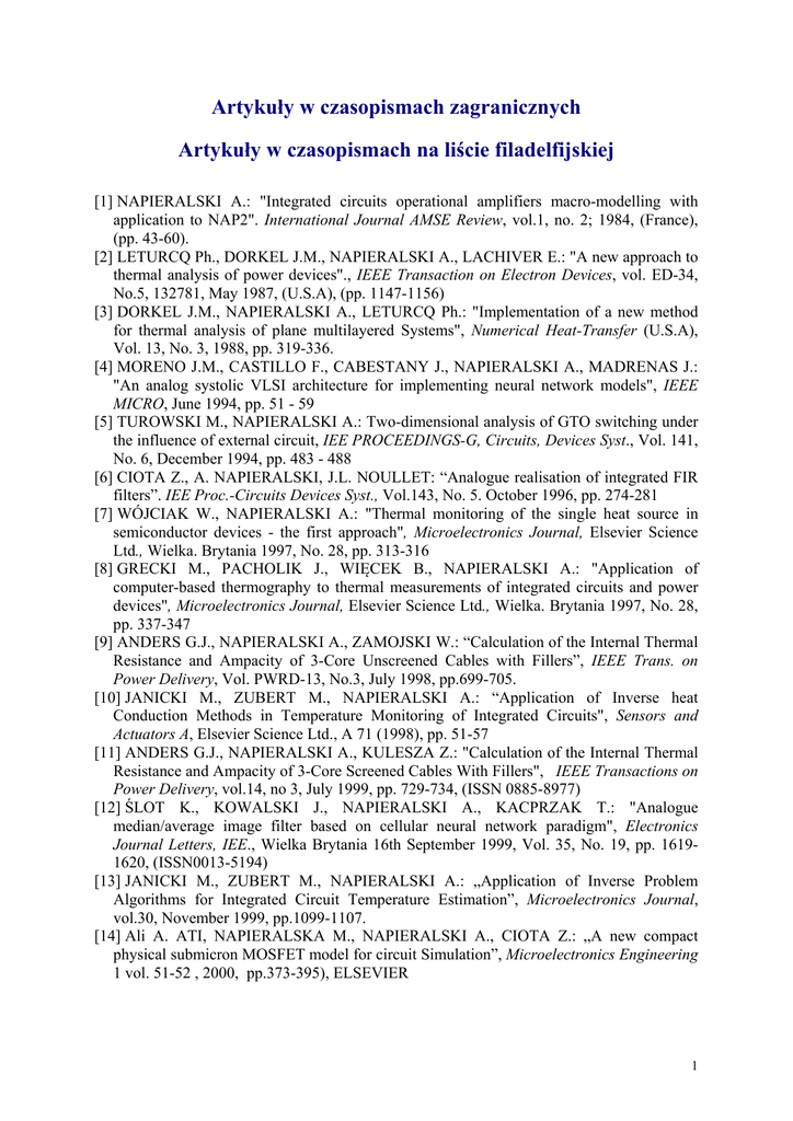 Artykuły w czasopismach zagranicznych Artykuły w czasopismach na liście filadelfijskiej [1] NAPIERALSKI A.: "Integrated circuits operational amplifiers macro-modelling with application to NAP2". International Journal AMSE Review, vol.1, no. 2; 1984, (France), (pp. 43-60). [2] LETURCQ Ph., DORKEL J.M., NAPIERALSKI A., LACHIVER E.: "A new approach to thermal analysis of power devices"., IEEE Transaction on Electron Devices, vol. ED-34, No.5, 132781, May 1987, (U.S.A), (pp. 1147-1156) [3] DORKEL J.M., NAPIERALSKI A., LETURCQ Ph.: "Implementation of a new method for thermal analysis of plane multilayered Systems", Numerical Heat-Transfer (U.S.A), Vol. 13, No. 3, 1988, pp. 319-336. [4] MORENO J.M., CASTILLO F., CABESTANY J., NAPIERALSKI A., MADRENAS J.: "An analog systolic VLSI architecture for implementing neural network models", IEEE MICRO, June 1994, pp. 51 - 59 [5] TUROWSKI M., NAPIERALSKI A.: Two-dimensional analysis of GTO switching under the influence of external circuit, IEE PROCEEDINGS-G, Circuits, Devices Syst., Vol. 141, No. 6, December 1994, pp. 483 - 488 [6] CIOTA Z., A. NAPIERALSKI, J.L. NOULLET: “Analogue realisation of integrated FIR filters”. IEE Proc.-Circuits Devices Syst., Vol.143, No. 5. October 1996, pp. 274-281 [7] WÓJCIAK W., NAPIERALSKI A.: "Thermal monitoring of the single heat source in semiconductor devices - the first approach", Microelectronics Journal, Elsevier Science Ltd., Wielka. Brytania 1997, No. 28, pp. 313-316 [8] GRECKI M., PACHOLIK J., WIĘCEK B., NAPIERALSKI A.: "Application of computer-based thermography to thermal measurements of integrated circuits and power devices", Microelectronics Journal, Elsevier Science Ltd., Wielka. Brytania 1997, No. 28, pp. 337-347 [9] ANDERS G.J., NAPIERALSKI A., ZAMOJSKI W.: “Calculation of the Internal Thermal Resistance and Ampacity of 3-Core Unscreened Cables with Fillers”, IEEE Trans. on Power Delivery, Vol. PWRD-13, No.3, July 1998, pp.699-705. [10] JANICKI M., ZUBERT M., NAPIERALSKI A.: “Application of Inverse heat Conduction Methods in Temperature Monitoring of Integrated Circuits", Sensors and Actuators A, Elsevier Science Ltd., A 71 (1998), pp. 51-57 [11] ANDERS G.J., NAPIERALSKI A., KULESZA Z.: "Calculation of the Internal Thermal Resistance and Ampacity of 3-Core Screened Cables With Fillers", IEEE Transactions on Power Delivery, vol.14, no 3, July 1999, pp. 729-734, (ISSN 0885-8977) [12] ŚLOT K., KOWALSKI J., NAPIERALSKI A., KACPRZAK T.: "Analogue median/average image filter based on cellular neural network paradigm", Electronics Journal Letters, IEE., Wielka Brytania 16th September 1999, Vol. 35, No. 19, pp. 16191620, (ISSN0013-5194) [13] JANICKI M., ZUBERT M., NAPIERALSKI A.: „Application of Inverse Problem Algorithms for Integrated Circuit Temperature Estimation”, Microelectronics Journal, vol.30, November 1999, pp.1099-1107. [14] Ali A. ATI, NAPIERALSKA M., NAPIERALSKI A., CIOTA Z.: „A new compact physical submicron MOSFET model for circuit Simulation”, Microelectronics Engineering 1 vol. 51-52 , 2000, pp.373-395), ELSEVIER 1 [15] JANICKI M., NAPIERALSKI A., FEDASYUK D., PETROV D.: „Thermal modelling of hybrid circuits – simulation method comparison”, Pergamon Press – Elsevier Science Ltd., Microelectronics Reliability 40 (2000) pp. 541-546 [16] JANICKI M., NAPIERALSKI A.: “Modeling electronic circuit radiation cooling using analytical thermal model”, Microelectronic Journal 31 ( 2000), Elsevier, pp. 781-785 [17] GRAMS A., LIBERSKI P., SOBÓW T., NAPIERALSKA M., ZUBERT M., NAPIERALSKI A.,: „The morphometric analysis and recognition an amyloid plaque in microscope images by computer image processing”. Folia Neuropathologica, Vol. 39 (4) 2000, pp. 183-187, PL ISSN 0028-3894 [18] ZUBERT M., NAPIERALSKA M., NAPIERALSKI A.: “RESCUER – The new solution in multidomain simulations”, Microelectronics Journal 31, No 11-12, Nov.-Dec.2000, pp. 945-954 [19] JANICKI M., De MEY G., NAPIERALSKI A.: “Transient thermal analysis of multilayered structures using Green's functions”, Microelectronics Relability 42, Elsevier Science Ltd. June 2002, Volume 42/7, pp.1059-1064 [20] JANICKI M., De MEY G., NAPIERALSKI A: “Application of Green's Functions for Analysis of Transient Thermal States in Electronic Circuits”, Microelectronics Journal, ISSN 0026-2692, Elsevier Science Ltd. September 2002, Volume 33/9, pp. 733-738 [21] ANDERS G., NAPIERALSKI A., ZUBERT M, ORLIKOWSKI M.: "Advanced Modeling Techniques for Dynamic Feeder Rating Systems", IEEE Transactions on Industry Applications, May/June 2003, Vol.39, Number3, pp. 619-626. [22] SUSZYŃSKI Z., ARSOBA R., NAPIERALSKI A., TYLMAN W. „Infrared Detection of Delaminations Using Induction Heating” IEEE Transactions on Components and Packaging Technologies, March 2004, pp.112-116, ISSN 1521-3331 [23] JANICKI M., DANIEL M., SZERMER M., NAPIERALSKI A.: „Ion sensitive field effect transistor modelling for multidomain simulation purposes” Microelectronics Journal, 35 (2004) pp. 831-840, ISSN 0026-2692 [24] DANIEL M., JANICKI M., WRÓBLEWSKI, DYBKO A., BRZÓZKA Z., NAPIERALSKI A., ”Ion selective transistor modelling for behavioural simulations” Water Science & Technology, Vol. 50, No 11,2004, pp.115-123, ISSN 02730-1223 [25] RATECKI K., SAKOWICZ B., WÓJTOWSKI M., NAPIERALSKI A.: „Web Accessible Multiaccount Configurable Client Email Application” str 79-85, International Journal of Computing, May 2006, vol. 5, issue 1, ISSN 1727-6209. [26] MAKOWSKI D., GRECKI M., NAPIERALSKI A., SIMROCK S., MUKHERJEE B.: „A Distributed System for Radiation Monitoring at Linear Accelerators”, str.2008-2015, IEEE Transactions on Nuclear Science, August 2006, vol. 53, no 4, ISSN 0018-9499 [27] JANICKI M, De MEY G., NAPIERALSKI A.: ‘Thermal Analysis of Layered Electronic Circuits with Green’s Functions’, Microelectronics Journal, Vol. 38, No. 2, February 2007, pp. 177-184, ISSN 0026-2692. [28] PAWLIK P, GRECKI M., SIMROCK S. and Nap