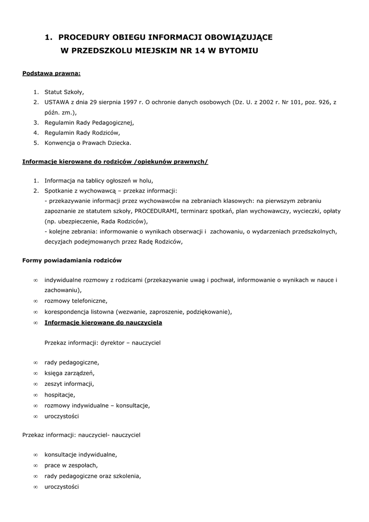 1. PROCEDURY OBIEGU INFORMACJI OBOWIĄZUJĄCE W PRZEDSZKOLU MIEJSKIM NR 14 W BYTOMIU Podstawa prawna: 1. Statut Szkoły, 2. USTAWA z dnia 29 sierpnia 1997 r. O ochronie danych osobowych (Dz. U. z 2002 r. Nr 101, poz. 926, z późn. zm.), 3. Regulamin Rady Pedagogicznej, 4. Regulamin Rady Rodziców, 5. Konwencja o Prawach Dziecka. Informacje kierowane do rodziców /opiekunów prawnych/ 1. Informacja na tablicy ogłoszeń w holu, 2. Spotkanie z wychowawcą – przekaz informacji: - przekazywanie informacji przez wychowawców na zebraniach klasowych: na pierwszym zebraniu zapoznanie ze statutem szkoły, PROCEDURAMI, terminarz spotkań, plan wychowawczy, wycieczki, opłaty (np. ubezpieczenie, Rada Rodziców), - kolejne zebrania: informowanie o wynikach obserwacji i zachowaniu, o wydarzeniach przedszkolnych, decyzjach podejmowanych przez Radę Rodziców, Formy powiadamiania rodziców • indywidualne rozmowy z rodzicami (przekazywanie uwag i pochwał, informowanie o wynikach w nauce i zachowaniu), • rozmowy telefoniczne, • korespondencja listowna (wezwanie, zaproszenie, podziękowanie), • Informacje kierowane do nauczyciela Przekaz informacji: dyrektor – nauczyciel • rady pedagogiczne, • księga zarządzeń, • zeszyt informacji, • hospitacje, • rozmowy indywidualne – konsultacje, • uroczystości Przekaz informacji: nauczyciel- nauczyciel • konsultacje indywidualne, • prace w zespołach, • rady pedagogiczne oraz szkolenia, • uroczystości • tablica informacyjna w pokoju nauczycielskim. Przekaz informacji: rodzic – nauczyciel • spotkania indywidualne, • wywiadówki (zebrania grupowe) • kontakt telefoniczny, • korespondencja służbowa, 2. PROCEDURY UDOSTĘPNIANIA DOKUMENTACJI SZKOLNEJ OBOWIĄZUJĄCE W PRZEDSZKOLU MIEJSKIM NR14 W BYTOMIU PODSTAWA PRAWNA: 1. Rozporządzenie Ministra Edukacji Narodowej z dnia 14 marca 2005 r. w sprawie zasad wydawania oraz wzorów świadectw, dyplomów państwowych i innych druków szkolnych, sposobu dokonywania ich sprostowań i wydawania duplikatów, a także zasad legalizacji dokumentów przeznaczonych do obrotu prawnego z zagranicą oraz zasad odpłatności za wykonywanie tych czynności (Dz. U. Nr 58, poz. 504, z późn. zm.) 2. USTAWA z dnia 29 sierpnia 1997 r. O ochronie danych osobowych (Dz. U. z 2002 r. Nr 101, poz. 926, z późn. zm.) 3. Statut Informacja o prowadzonych w szkole rejestrach, ewidencjach i archiwach oraz o sposobach i zasadach udostępniania danych w nich zawartych. • Ewidencja akt osobowych pracowników. • Rejestr akt i zaświadczeń - awans zawodowy nauczycieli. • Ewidencja zastępstw. • Protokoły Rad Pedagogicznych, Rady Rodziców • Rejestr korespondencji. • Ewidencja czasu pracy. • Dokumentacja oceny ryzyka zawodowego. • Archiwum dokumentacji przedszkola. Osoba starająca się o wgląd do dokumentów powinna złożyć podanie u dyrektora przedszkola. Nauczyciele i pracownicy przedszkola mogą ustnie zgłosić prośbę o wgląd na miejscu do dokumentów dotyczących spraw osobistych lub przedszkolnych z zachowaniem Ustawy o Ochronie Danych Osobowych. Sposób przyjmowania i załatwiania spraw: • Dyrektor przedszkola przyjmuje podania, wnioski i pisma interesantów (korespondencję można kierować również drogą elektroniczną na adres [email protected]) • Sprawy są rozpatrywane z zachowaniem trybu i terminów zgodnych z kodeksem postępowania administracyjnego. • Dyrektor (społeczny zastępca) udziela szczegółowych informacji dotyczących sposobu załatwiania spraw. Dokumentacja grupowa • Dziennik lekcyjny; • Arkusze obserwacji pedagogicznych; • Zeszyt uwag ( kontaktów z rodzicami); • Protokoły z zebrań grupowych; Nauczyciel powinien umożliwić rodzicom wgląd do ww. dokumentów z zachowaniem Ustawy o Ochronie Danych Osobowych. Wydawanie zaświadczeń i duplikatów Przedszkole wydaje zaświadczenia i inne druki szkolne według zasad określonych w rozporządzeniu Ministra Edukacji Narodowej i Sportu, powołanym na wstępie. Procedury dotyczące spełniania obowiązku rocznego przygotowania przedszkolnego przez dzieci zapisanych na dany rok szkolny do Przedszkola Miejskiego Nr 14 w Bytomiu Podstawa prawna: art. 15 – 20 ustawy z dnia 7 września 1991 r. o systemie oświaty. I kontrola Frekwencji 1. Systematyczna kontrola frekwencji przez nauczycieli prowadzących zajęcia, adnotacja w dzienniku lub innej odpowiedniej dokumentacji przedszkola. ( CZYTNIK POBYTU DZIECKA W PLACÓWCE) 2. Comiesięczna kontrola, przy wykonywaniu zestawienia przez wychowawcę. Kontrola przez dyrektora przedszkola wg potrzeb( naniesienie frekwencji dzieci do programu OSON II. Postępowanie w przypadku nie realizowania obowiązku rocznego przygotowania przedszkolnego przez dziecko. 1. Skontaktowanie się z rodzicami (prawnych opiekunów) o absencji ucznia. Formy kontaktu: - telefoniczny z odnotowaniem w dzienniku i zeszycie rozmów telefonicznych, - pisemnie za potwierdzeniem odbioru (wezwanie do przyjścia do przedszkola i wyjaśnienie przyczyn nieobecności dziecka), 2. Dyrektor sprawdza przyczyny nieobecności dziecka poprzez: - rozmowę z rodzicami dziecka na terenie przedszkola, w trakcie której informuje rodziców (opiekunów) o obowiązujących przepisach prawnych w zakresie obowiązku rocznego przygotowania przedszkolnego, w tym o środkach egzekucyjnych, 3. Rodzice mają obowiązek usprawiedliwić nieobecności dziecka w terminie do tygodnia po dłuższej nieobecności dziecka w przedszkolu; 4. W przypadku braku współpracy rodzica (opiekuna) z wychowawcą rodzic nie uczestniczy w zebraniach, konsultacjach, nie wyraża chęci na spotkania indywidualne) oraz w przypadku dalszego uchylania się realizacji obowiązku r.p.p, wychowawca zgłasza fakt dyrektorowi szkoły. 5. Powiadomienie innych kompetentnych instytucji przez dyrektora szkoły: - MOPR- o kontrole sytuacji rodzinnej dziecka - Sąd Rodzinny ds. Nieletnich (kuratora sądowego), - Policja, 3. PROCEDURA PROCESU AD
