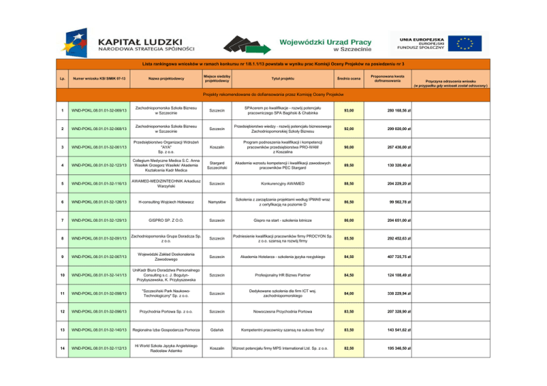 Lista rankingowa wniosków w ramach konkursu nr 1/8.1.1/13 powstała w wyniku prac Komisji Oceny Projeków na posiedzeniu nr 3 Lp. Numer wniosku KSI SIMIK 07-13 Nazwa projektodawcy Miejsce siedziby projektodawcy Tytuł projektu Średnia ocena Proponowana kwota dofinansowania Projekty rekomendowane do dofiansowania przez Komisję Oceny Projeków 1 WND-POKL.08.01.01-32-069/13 Zachodniopomorska Szkoła Biznesu w Szczecinie Szczecin SPAcerem po kwalifikacje - rozwój potencjału pracowniczego SPA Bagiński & Chabinka 93,00 280 168,56 zł 2 WND-POKL.08.01.01-32-068/13 Zachodniopomorska Szkoła Biznesu w Szczecinie Szczecin Przedsiębiorstwo wiedzy - rozwój potencjału biznesowego Zachodniopomorskiej Szkoły Biznesu 92,00 299 020,00 zł 3 WND-POKL.08.01.01-32-061/13 Przedsiębiorstwo Organizacji WdroŜeń "AYA" Sp. z o.o. Koszalin Program podnoszenia kwalifikacji i kompetencji pracowników przedsiębiorstwa PRO-WAM z Koszalina 90,00 267 436,00 zł 4 WND-POKL.08.01.01-32-123/13 Collegium Medyczne Medica S.C. Anna Wasiłek Grzegorz Wasiłek/ Akademia Kształcenia Kadr Medica Stargard Szczeciński Akademia wzrostu kompetencji i kwalifikacji zawodowych pracowników PEC Stargard 89,50 130 320,40 zł 5 WND-POKL.08.01.01-32-116/13 AWAMED-MEDIZINTECHNIK Arkadiusz Warzyński Szczecin Konkurencyjny AWAMED 88,50 204 229,20 zł 6 WND-POKL.08.01.01-32-126/13 H-consulting Wojciech Hołowacz Namysłów Szkolenia z zarządzania projektami według IPMA® wraz z certyfikacją na poziomie D 86,50 99 562,78 zł 7 WND-POKL.08.01.01-32-129/13 GISPRO SP. Z O.O. Szczecin Gispro na start - szkolenia lotnicze 86,00 204 651,00 zł 8 WND-POKL.08.01.01-32-091/13 Zachodniopomorska Grupa Doradcza Sp. z o.o. Szczecin Podniesienie kwalifikacji pracowników firmy PROCYON Sp. z o.o. szansą na rozwój firmy 85,50 292 452,63 zł 9 WND-POKL.08.01.01-32-067/13 Wojewódzki Zakład Doskonalenia Zawodowego Szczecin Akademia Hotelarza - szkolenia języka rosyjskiego 84,50 407 725,75 zł 10 WND-POKL.08.01.01-32-141/13 UniKadr Biuro Doradztwa Personalnego Consulting s.c. J. BogutynPrzybyszewska, K. Przybyszewska Szczecin Profesjonalny HR Biznes Partner 84,50 124 108,49 zł 11 WND-POKL.08.01.01-32-098/13 "Szczeciński Park NaukowoTechnologiczny" Sp. z o.o. Szczecin Dedykowane szkolenia dla firm ICT woj. zachodniopomorskiego 84,00 338 229,94 zł 12 WND-POKL.08.01.01-32-096/13 Przychodnia Portowa Sp. z o.o. Szczecin Nowoczesna Przychodnia Portowa 83,50 207 328,90 zł 13 WND-POKL.08.01.01-32-140/13 Regionalna Izba Gospodarcza Pomorza Gdańsk Kompetentni pracownicy szansą na sukces firmy! 83,50 143 541,62 zł 14 WND-POKL.08.01.01-32-112/13 Hi World Szkoła Języka Angielskiego Radosław Adamko Koszalin 82,50 195 346,50 zł Wzrost potencjału firmy MPS International Ltd. Sp. z o.o. Przyczyna odrzucenia wniosku (w przypadku gdy wniosek został odrzucony ) 15 WND-POKL.08.01.01-32-088/13 GABINETY LEKARSKIE I CENTRUM ORTOPEDII I REHABILITACJI ZBIGNIEW PAWŁOWSKI Szczecin Innowacyjne kwalifikacje rehabilitantów 82,00 95 237,90 zł 16 WND-POKL.08.01.01-32-078/13 Centrum Doradztwa i Szkoleń Zawodowych Aleksander Igielski Szczecin Certyfikaty EKO Przewoźnika i Bezpiecznego Przewoźnika drogą do poprawy konkurencyjności 3 firm transportowych woj. zachodniopomorskiego 82,00 197 999,59 zł 17 WND-POKL.08.01.01-32-109/13 Stowarzyszenie Rozwoju Społecznego "Omni-Modo" Koszalin Droga do realizacji strategii firmy 82,00 553 334,60 zł 18 WND-POKL.08.01.01-32-142/13 Regionalna Izba Gospodarcza Pomorza Gdańsk Czas na jakość - Czas na zmiany 82,00 380 082,99 zł 19 WND-POKL.08.01.01-32-110/13 HOTELE I DOMY WCZASOWE "DIAMENT" SP. Z O.O. Grzybowo Wzrost konkurencyjności w zakresie certyfikowanych usług w Domu Zdrojowym Diament Spa 81,00 108 362,50 zł 20 WND-POKL.08.01.01-32-150/13 SZJ - CONSULTING Krzysztof Szulczyński Koszalin Kompetentny pracownik-Konkurencyjna firma. Program podnoszenia kwalifikacji i kompetencji pracowników przedsiębiorstwa GIPO z Koszalina 80,50 186 111,90 zł 21 WND-POKL.08.01.01-32-127/13 DM QUALITAS Sp. z o.o. Wielka Wieś Rozwój przedsiębiorstw i kwalifikacji pracowników w zakresie standardów IFS i BRC 80,50 270 120,70 zł 22 WND-POKL.08.01.01-32-077/13 AUTOPARTNER S.C.G. PODOLECKI, M.SOPRYCH Mierzyn Inwestycja w kapitał AUTOPARTNER S.C. 80,50 197 052,93 zł 23 WND-POKL.08.01.01-32-100/13 Najda Consulting Andrzej Najda Szczecin Doskonalenia kompetencji zawodowych pracowników firmy Flash-Butrym sp. j. 80,00 334 489,14 zł 24 WND-POKL.08.01.01-32-059/13 4 EDU Anna Potoka Mierzyn Rozwój lokalnych przedsiębiorców 79,50 573 960,00 zł 25 WND-POKL.08.01.01-32-131/13 Północny Związek Pracodawców Szczecin Certyfikowane kompetencje pracowników kluczem do sukcesu firmy 79,00 575 582,33 zł Projekty rekomendowane do dofiansowania przez Komisję Oceny Projeków, lecz nie przyjęte do dofinansowania z powodu wyczerpania alokacji w ramach ww. konkursu 26 WND-POKL.08.01.01-32-058/13 Ed-Pro Sp. z o.o. Szczecin Na Zdrowie-nowe kwalifikacje nowe perspektywy 79,00 392 160,20 zł 27 WND-POKL.08.01.01-32-085/13 EOT Sp. z o.o. Szczecin Wzrost konkurencyjności firmy EOT Sp. z o.o. 79,00 349 418,40 zł 28 WND-POKL.08.01.01-32-090/13 Zachodniopomorska Grupa Doradcza Sp. z o.o. Szczecin WyŜsze kwalifikacje-nowe moŜliwości 78,50 230 364,20 zł 29 WND-POKL.08.01.01-32-124/13 UNI-MEBEL Spółka Cywilna Tadeusz Cichoń, Andrzej Parawa Szczecin Podniesienie kwalifikacji zawodowychpracowników firmy UNI-MEBEL s.c. 78,00 163 045,00 zł 30 WND-POKL.08.01.01-32-073/13 HOTEL SENATOR S.A. Dźwirzyno HOTEL SENATOR-SZKOLIMY SIĘ 78,00 352 564,89 zł 31 WND-POKL.08.01.01-32-074/13 HOTEL LIDIA SPÓŁKA Z OGRANICZONĄ ODPOWIEDZIALNOŚCIĄ S.K.A Darłowo Certyfikowane szkolenia=wzrost konkurencyjności Hotelu Lidia 76,50 286 324,50 zł 32 WND-POKL.08.01.01-32-137/13 BLStream Sp. z o.o. Szczecin Rozwój kompetencji BLStream rozwojem Regionu 75,00 232 606,32 zł 33 WND-POKL.08.01.01-32-089/13 EURO-CAPITAL Doradztwo Gospodarcze Piotr Sibilski Bezr