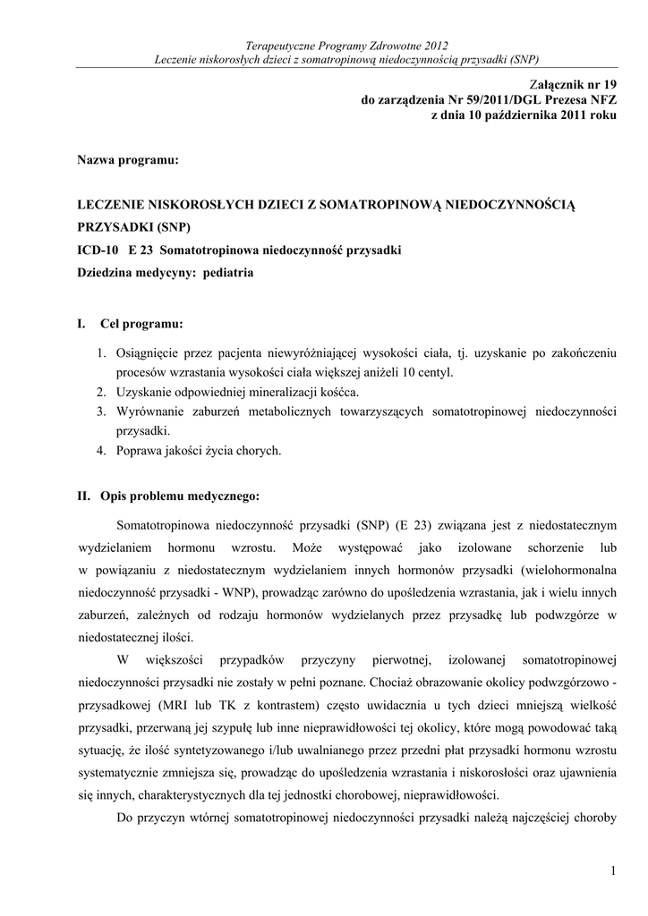 Terapeutyczne Programy Zdrowotne 2012 Leczenie niskorosłych dzieci z somatropinową niedoczynnością przysadki (SNP) Załącznik nr 19 do zarządzenia Nr 59/2011/DGL Prezesa NFZ z dnia 10 października 2011 roku Nazwa programu: LECZENIE NISKOROSŁYCH DZIECI Z SOMATROPINOWĄ NIEDOCZYNNOŚCIĄ PRZYSADKI (SNP) ICD-10 E 23 Somatotropinowa niedoczynność przysadki Dziedzina medycyny: pediatria I. Cel programu: 1. Osiągnięcie przez pacjenta niewyróżniającej wysokości ciała, tj. uzyskanie po zakończeniu procesów wzrastania wysokości ciała większej aniżeli 10 centyl. 2. Uzyskanie odpowiedniej mineralizacji kośćca. 3. Wyrównanie zaburzeń metabolicznych towarzyszących somatotropinowej niedoczynności przysadki. 4. Poprawa jakości życia chorych. II. Opis problemu medycznego: Somatotropinowa niedoczynność przysadki (SNP) (E 23) związana jest z niedostatecznym wydzielaniem hormonu wzrostu. Może występować jako izolowane schorzenie lub w powiązaniu z niedostatecznym wydzielaniem innych hormonów przysadki (wielohormonalna niedoczynność przysadki - WNP), prowadząc zarówno do upośledzenia wzrastania, jak i wielu innych zaburzeń, zależnych od rodzaju hormonów wydzielanych przez przysadkę lub podwzgórze w niedostatecznej ilości. W większości przypadków przyczyny pierwotnej, izolowanej somatotropinowej niedoczynności przysadki nie zostały w pełni poznane. Chociaż obrazowanie okolicy podwzgórzowo przysadkowej (MRI lub TK z kontrastem) często uwidacznia u tych dzieci mniejszą wielkość przysadki, przerwaną jej szypułę lub inne nieprawidłowości tej okolicy, które mogą powodować taką sytuację, że ilość syntetyzowanego i/lub uwalnianego przez przedni płat przysadki hormonu wzrostu systematycznie zmniejsza się, prowadząc do upośledzenia wzrastania i niskorosłości oraz ujawnienia się innych, charakterystycznych dla tej jednostki chorobowej, nieprawidłowości. Do przyczyn wtórnej somatotropinowej niedoczynności przysadki należą najczęściej choroby 1 Terapeutyczne Programy Zdrowotne 2012 Leczenie niskorosłych dzieci z somatropinową niedoczynnością przysadki (SNP) rozrostowe i „następstwa” ich terapii oraz urazy, stany zapalne i inne schorzenia prowadzące do anatomicznych i/lub czynnościowych uszkodzeń ośrodkowego układu nerwowego. Przyczyny somatropinowej niedoczynności przysadki są zróżnicowane, mogą być wrodzone lub nabyte. SNP najczęściej spowodowana jest nieprawidłowościami rozwoju okolicy podwzgórzowo przysadkowej i/lub uszkodzeniami tej okolicy w okresie ciąży i/lub porodu. Postać nabyta występuje u ponad 1/3 dzieci z SNP i najczęściej spowodowana jest procesami rozrostowymi, szczególnie w obrębie ośrodkowego układu nerwowego i powikłaniami ich terapii, jak również urazami i innymi chorobami uszkadzającymi ośrodkowy układ nerwowy. Zmniejszenie tempa wzrastania jest zasadniczym objawem sugerującym możliwość somatotropinowej niedoczynności przysadki. Chociaż w przypadku ciężkiej, wrodzonej SNP jedynym objawem sugerującym możliwość tej choroby mogą być ciężkie, nawracające stany hipoglikemii u noworodka i/lub niemowlęcia, szczególnie w przypadku, gdy stanom hipoglikemii towarzyszą wady linii pośrodkowej ciała. Zmniejszone tempo wzrastania występuje tym wcześniej im większy jest niedobór hormonu wzrostu. Najczęściej jednak rodzice i lekarze zauważają, że dziecko jest niższe od rówieśników i wolniej rośnie w 3-4 roku życia dziecka. Nie podjęcie leczenia hormonem wzrostu w tym okresie powoduje, że niedobór wzrostu pogłębia się, prowadząc nieuchronnie do skrajnej niskorosłości – karłowatości. Z czasem trwania choroby pojawiają się również, początkowo dyskretne, nieprawidłowości metaboliczne, prowadzące po latach do trwałych, nieodwracalnych zmian, początkowo czynnościowych, a następnie strukturalnych, w obrębie wielu narządów i układów, takich jak: miażdżyca naczyń krwionośnych (od wczesnego dzieciństwa narastająca hipercholesterolemia, z dyslipidemią), upośledzenie funkcji lewej komory serca, prowadzące do niewydolności mięśnia sercowego oraz upośledzenie przepływu krwi przez naczynia szyjne, w efekcie prowadzące do udarów mózgu, jak również narastająca otyłość, osteoporoza i patologiczne złamania kośćca. Epidemiologia: Wrodzona postać somatotropinowej niedoczynności przysadki występuje z częstością 1/3 500 1/10 000 urodzeń. Postać nabyta szacowana jest natomiast na ok. 1/3 przypadków niedoboru hormonu wzrostu u dzieci i młodzieży, a jej częstość zależy m.in. od efektywności leczenia chorób rozrostowych i przeżycia dzieci z „uszkodzeniami” ośrodkowego układu nerwowego, szczególnie dzieci urodzonych z bardzo małą masą ciała. 2 Terapeutyczne Programy Zdrowotne 2012 Leczenie niskorosłych dzieci z somatropinową niedoczynnością przysadki (SNP) III. Opis programu W przypadku somatotropinowej niedoczynności przysadki postępowaniem z wyboru jest jak najszybsze rozpoczęcie terapii z użyciem preparatów rekombinowanego, ludzkiego hormonu wzrostu. Przy zastosowaniu takiego leczenia rokowanie jest korzystne. 1. Substancja czynna finansowana w ramach programu: rekombinowany, ludzki hormon wzrostu Opis działania leku: Hormon wzrostu spełnia różną funkcję, zależnie od okresu rozwoju organizmu. W okresie wzrastania stymuluje wzrost i podziały komórek, w tym wzrost chrząstki, a za pośrednictwem chrząstki przynasadowej wzrost kości na długość. Stymuluje także podziały innych komórek. Moduluje również przebieg dojrzewania płciowego, wpływa na gospodarkę tłuszczową, węglowodanową i białkową, a ponadto gospodarkę wodno-elektrolitową, mineralizację szkieletu, układ mięśniowy i krążenia. Hormon wzrostu działa poprzez receptor błonowy, z rodziny receptorów cytokin, w wielu swoich działaniach za pośrednictwem insulinopodobnego czynnika wzrostu – I (I