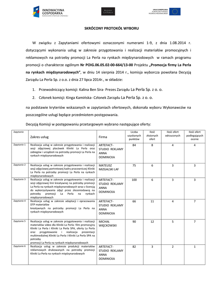 SKRÓCONY PROTOKÓŁ WYBORU W związku z Zapytaniami ofertowymi oznaczonymi numerami 1-9, z dnia 1.08.2014 r. dotyczącymi wykonania usług w zakresie przygotowania i realizacji materiałów promocyjnych i reklamowych na potrzeby promocji La Perla na rynkach międzynarodowych w ramach programu promocji o charakterze ogólnym Nr POIG.06.05.02-00-664/13-00 Projektu „Promocja firmy La Perla na rynkach międzynarodowych”, w dniu 14 sierpnia 2014 r., komisja wyborcza powołana Decyzją Zarządu La Perla Sp. z o.o. z dnia 27 lipca 2014r., w składzie: 1. Przewodniczący komisji: Kalina Ben Sira- Prezes Zarządu La Perla Sp. z o. o. 2. Członek komisji: Kinga Kamińska- Członek Zarządu La Perla Sp. z o. o. na podstawie kryteriów wskazanych w zapytaniach ofertowych, dokonała wyboru Wykonawców na poszczególne usługi będące przedmiotem postępowania. Decyzją Komisji w postępowaniu przetargowym wybrano następujące oferty: Liczba uzyskanych punktów Ilość złożonych ofert Ilość ofert odrzuconych Ilość ofert podlegających ocenie ARTEFACTSTUDIO REKLAMY ANNA DOMINICKA 84 8 4 4 Realizacja usług w zakresie przygotowania i realizacji sesji zdjęciowej portretowej kadry pracowniczej Kliniki La Perla na potrzeby promocji La Perla na rynkach międzynarodowych Realizacja usług w zakresie przygotowania i realizacji sesji zdjęciowej linii kreatywnej na potrzeby promocji La Perla na rynkach międzynarodowych wraz z licencją do wykorzystywania zdjęć przez zleceniodawcę na potrzeby promocji La Perla na rynkach międzynarodowych Realizacja usług w zakresie adaptacji i opracowania DTP materiałów kreatywnych na potrzeby promocji La Perla na rynkach międzynarodowych MATEUSZ MIZGALSKI LAF 75 6 3 3 ARTEFACTSTUDIO REKLAMY ANNA DOMINICKA 100 6 3 3 ARTEFACTSTUDIO REKLAMY ANNA DOMINICKA 66 11 4 7 Realizacja usług w zakresie przygotowania i realizacji materiałów video dla Kliniki La Perla: film promocyjny Kliniki La Perla i Kliniki La Perla SPA, oferty La Perla oraz przygotowanie i realizacja prezentacji multimedialnej Kliniki La Perla i Kliniki La Perla SPA na potrzeby promocji La Perla na rynkach międzynarodowych Realizacja usług w zakresie produkcji materiałów reklamowych drukowanych na potrzeby promocji Kliniki La Perla na rynkach międzynarodowych MICHAŁ WIĘCKOWSKI 90 12 5 7 ARTEFACTSTUDIO REKLAMY ANNA DOMINICKA 82 3 2 1 Zapytanie Zakres usług Firma Zapytanie 1 Realizacja usług w zakresie przygotowania i realizacji sesji zdjęciowej placówek Kliniki La Perla oraz zabiegów i urządzeń na potrzeby promocji La Perla na rynkach międzynarodowych Zapytanie 2 Zapytanie 3 Zapytanie 4 Zapytanie 5 Zapytanie 6 Zapytanie 7 Zapytanie 8 Zapytanie 9 Przygotowania i realizacja podstrony informacyjnej dotyczącej Projektów Unijnych oraz adaptację strony www.la-perla na potrzeby promocji Kliniki La Perla na rynkach międzynarodowych w tym promocję turystyki medycznej oraz dodatkowo realizację materiału na stronie www z obecności firmy La Perla na targach „Sao Paulo Beauty Fair 2014” Realizacja usług w zakresie dotyczącym przygotowania i produkcji gadżetów reklamowych – komplet: długopisy, klapki, parasole, torby plażowe, na potrzeby promocji Kliniki La Perla na rynkach międzynarodowych Realizacja usług w zakresie dotyczącym przygotowania i produkcji toreb reklamowych na kosmetyki , na potrzeby promocji Kliniki La Perla na rynkach międzynarodowych Piotr Esse SPERO 100 8 1 7 14 ZERO SYLWIA OPARA 100 8 1 7 Dominik Kukliński, Krzysztof Pawlak AGENCJA REKLAMOWA NEXO 100 5 2 3 Szczegółowe protokoły z obrad Komisji dostępne są do wglądu w Biurze Zarządu La Perla Sp. z o.o. w Warszawie przy ul. Aleje Jerozolimskie 89 lok. 149, 02-001 Warszawa, od poniedziałku do piątku w godzinach 9.00- 17.00. Osobami upoważnionymi do wglądu w Protokoły wyboru mają wyłącznie przedsiębiorcy biorący udział w danym postępowaniu oraz wyłącznie po uprzednim, minimum jednodniowym, telefonicznym umówieniu terminu i godziny spotkania. Osoby wykonujące czynności w postępowaniu o udzielenie zamówienia złożyły oświadczenie określone w art. 17 ust. 2 Prawo zamówień publicznych w protokołach wymienionych powyżej.