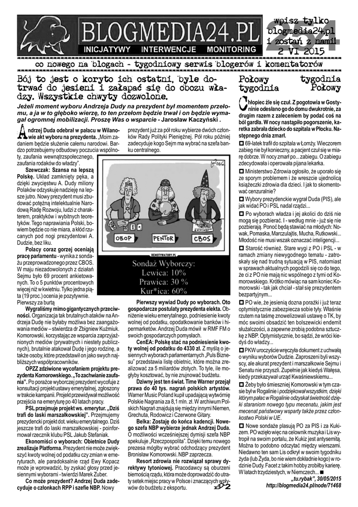 wpisz tylko blogmedia24.pl i zostañ z nami! 2 VI 2015 ========================================================================================== 254 co nowego na blogach - tygodniowy serwis blogerów i komentatorów ========================================================================================== tygodnia Bój to jest o koryto ich ostatni, byle doPo³owy Po³owy trwaæ do jesieni i za³apaæ siê do obozu w³atygodnia dzy. Wszystkie chwyty dozwolone. Jeżeli moment wyboru Andrzeja Dudy na prezydent był momentem przełomu, a ja w to głęboko wierzę, to ten przełom będzie trwał i on będzie wymagał ogromnej mobilizacji. Proszę Was o wsparcie - Jarosław Kaczyński . A ndrzej Duda odebrał w pałacu w Wilanowie akt wyboru na prezydenta. „Moim zadaniem będzie służenie całemu narodowi. Bardzo potrzebujemy odbudowy poczucia wspólnoty, zaufania wewnątrzspołecznego, zaufania rodaków do władzy”. Szewczak: Szansa na lepszą Polskę. Układ zamknięty pęka, a dzięki zwycięstwu A. Dudy miliony Polaków odzyskuje nadzieję na lepsze jutro. Nowy prezydent musi zbudować potężną intelektualnie Narodową Radę Rozwoju, ludzi z charakterem, praktyków i wybitnych teoretyków. Tego naprawiania Polski, bowiem będzie co nie miara, a kłód rzucanych pod nogi prezydentowi A. Dudzie, bez liku. Polacy coraz gorzej oceniają pracę parlamentu - wynika z sondażu przeprowadzonego przez CBOS. W maju niezadowolonych z działań Sejmu było 69 procent ankietowanych. To o 5 punktów procentowych więcej niż w kwietniu. Tylko jedna piąta (19 proc.) ocenia je pozytywnie. Pierwszy za burtą Wygraliśmy mimo gigantycznych przeciwności. Organizacja tak brutalnych ataków na Andrzeja Dudę nie byłaby możliwa bez zaangażowania mediów – stwierdza dr Zbigniew Kuźmiuk. Komorowski, korzystając ze wsparcia zaprzyjaźnionych mediów (prywatnych i niestety publicznych), brutalnie atakował Dudę i jego rodzinę, a także osoby, które przedstawił on jako swych najbliższych współpracowników. OPZZ zdziwione wycofaniem projektu prezydenta Komorowskiego. „To zachwianie zaufania”. Po porażce wyborczej prezydent wycofuje z konsultacji projekt ustawy emerytalnej, zgłoszony w trakcie kampanii. Projekt przewidywał możliwość przejścia na emeryturę po 40 latach pracy. PSL przejmuje projekt ws. emerytur. „Dziś trafi do laski marszałkowskiej”. Przejmujemy prezydencki projekt dot. wieku emerytalnego. Dziś jeszcze trafi do laski marszałkowskiej - poinformował rzecznik klubu PSL Jakub Stefaniak. Ekonomiści o wyborach: Obietnice Dudy zrealizuje Platforma. Prezydent nie może zwiększyć kwoty wolnej od podatku czy zmian w emeryturach, ale paradoksalnie rząd Ewy Kopacz może je wprowadzić, by zyskać głosy przed jesiennymi wyborami - twierdzi Marek Zuber. Co może prezydent? Andrzej Duda zadecyduje o członkach RPP i szefie NBP. Nowy prezydent już za pół roku wybierze dwóch członków Rady Polityki Pieniężnej. Pół roku później zadecyduje kogo Sejm ma wybrać na szefa banku centralnego. Pierwszy wywiad Dudy po wyborach. Oto gospodarcze postulaty prezydenta elekta. Obniżenie wieku emerytalnego, podniesienie kwoty wolnej od podatku, opodatkowanie banków i hipermarketów. Andrzej Duda mówił w RMF FM o swoich gospodarczych pomysłach. CenEA: Polskę stać na podniesienie kwoty wolnej od podatku do 4330 zł. Z myślą o jesiennych wyborach parlamentarnych „Puls Biznesu” przedstawia listę obietnic, które można zrealizować za 5 miliardów złotych. To tyle, ile mogłyby kosztować, by nie zrujnować budżetu. Dziwny jest ten świat. Time Warner przejął prawa do 40 tys. nagrań polskich artystów. Warner Music Poland kupił upadającą wytwórnię Polskie Nagrania za 8,1 mln. zł. W archiwum Polskich Nagrań znajdują się między innymi Niemen, Grechuta, Rodowicz i Czerwone Gitary. Belka: Zostaję do końca kadencji. Nowego szefa NBP wybierze jednak Andrzej Duda. O możliwości wcześniejszej dymisji szefa NBP spekuluje „Rzeczpospolita”. Dzięki temu nowego prezesa mógłby wybrać odchodzący prezydent Bronisław Komorowski. NBP zaprzecza. Resort zdrowia nie rozwiązał sprawy dyrektywy tytoniowej. Pracodawcy są oburzeni biernością rządu, która może doprowadzić do utraty setek miejsc pracy w Polsce i znaczących wpły2 wów do budżetu z eksportu. C hłopiec źle się czuł. Z pogotowia w Gostyninie odesłano go do domu dwukrotnie, za drugim razem z zaleceniem by podać coś na ból gardła. W nocy nastąpiło pogorszenie, karetka zabrała dziecko do szpitala w Płocku. Następnego dnia zmarł. 69-latek trafił do szpitala w Łomży. Wieczorem zabieg nie był konieczny, a pacjent czuł się w miarę dobrze. W nocy zmarł po... zabiegu. O zabiegu zdecydowała i operowała pijana lekarka. Ministerstwo Zdrowia ogłosiło, że uporało się ze sporym problemem i że wreszcie ujednolicą książeczki zdrowia dla dzieci. I jak to skomentować cenzuralnie? Wybory prezydenckie wygrał Duda (PIS), ale jak widać PO i PSL nadal rządzi... Po wyborach władza i jej akolici do dziś nie mogą się pozbierać. I - według mnie - już się nie pozbierają. Ponoć będą stawiać na młodych: Nowak, Pomaska, Marczulajtis, Mucha, Rutkowski... Młodość nie musi wszak oznaczać inteligencji... Starość również. Stare wygi z PO i PSL - w ramach zmiany niewygodnego tematu - zatroskały się nad trudną sytuacją w PIS, natomiast w sprawach aktualnych pogodzili się co do tego, że ci z PO nie mają nic wspólnego z tymi od Komorowskiego. Krótko mówiąc na sam koniec Komorowski - tak jak chciał - stał się prezydentem bezpartyjnym... PO wie, że jesienią dozna porażki i już teraz optymistycznie zabezpiecza sobie tyły. Właśnie rzutem na taśmę znowelizowali ustawę o TK, by móc swoimi obsadzić ten bolszewicki endemit służalczości, a zapewne zrobią podobna sztuczkę z NBP. Optymistycznie, bo sądzi, że wróci kiedyś do władzy... PKW uroczy