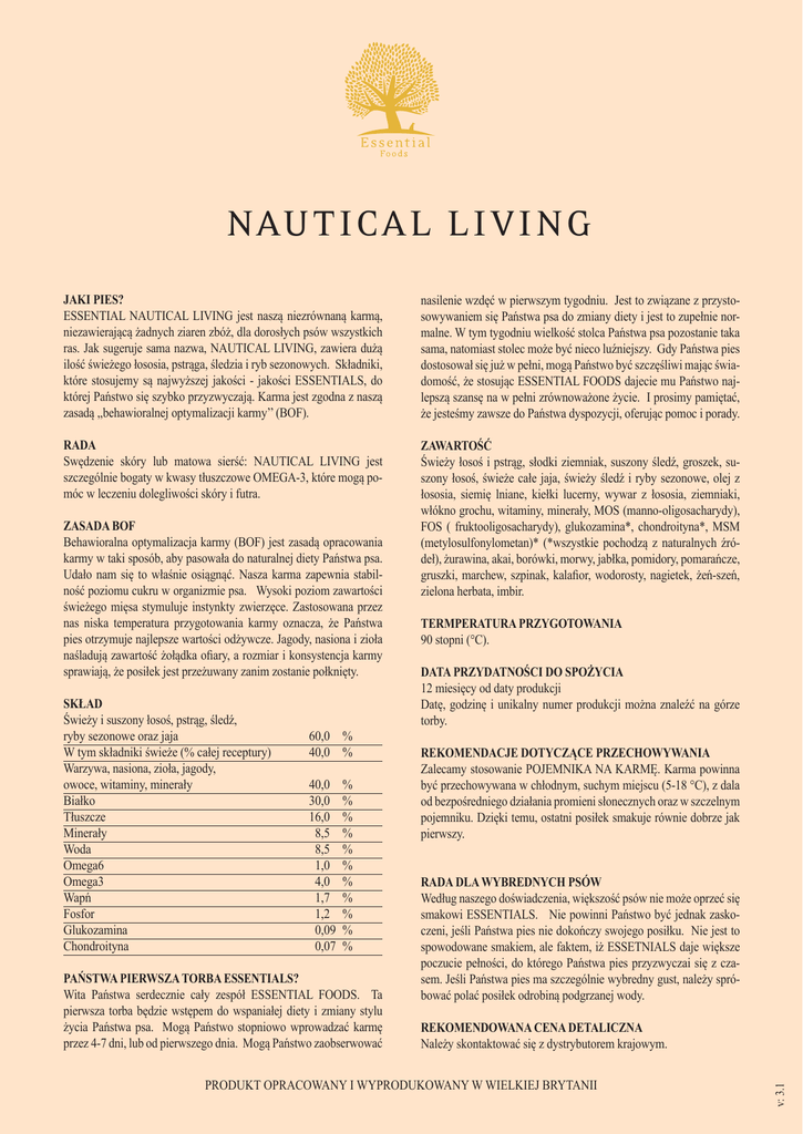 NAUTICAL LIVING JAKI PIES? ESSENTIAL NAUTICAL LIVING jest naszą niezrównaną karmą, niezawierającą żadnych ziaren zbóż, dla dorosłych psów wszystkich ras. Jak sugeruje sama nazwa, NAUTICAL LIVING, zawiera dużą ilość świeżego łososia, pstrąga, śledzia i ryb sezonowych. Składniki, które stosujemy są najwyższej jakości - jakości ESSENTIALS, do której Państwo się szybko przyzwyczają. Karma jest zgodna z naszą zasadą ,,behawioralnej optymalizacji karmy’’ (BOF). nasilenie wzdęć w pierwszym tygodniu. Jest to związane z przystosowywaniem się Państwa psa do zmiany diety i jest to zupełnie normalne. W tym tygodniu wielkość stolca Państwa psa pozostanie taka sama, natomiast stolec może być nieco luźniejszy. Gdy Państwa pies dostosował się już w pełni, mogą Państwo być szczęśliwi mając świadomość, że stosując ESSENTIAL FOODS dajecie mu Państwo najlepszą szansę na w pełni zrównoważone życie. I prosimy pamiętać, że jesteśmy zawsze do Państwa dyspozycji, oferując pomoc i porady. RADA Swędzenie skóry lub matowa sierść: NAUTICAL LIVING jest szczególnie bogaty w kwasy tłuszczowe OMEGA-3, które mogą pomóc w leczeniu dolegliwości skóry i futra. ZAWARTOŚĆ Świeży łosoś i pstrąg, słodki ziemniak, suszony śledź, groszek, suszony łosoś, świeże całe jaja, świeży śledź i ryby sezonowe, olej z łososia, siemię lniane, kiełki lucerny, wywar z łososia, ziemniaki, włókno grochu, witaminy, minerały, MOS (manno-oligosacharydy), FOS ( fruktooligosacharydy), glukozamina*, chondroityna*, MSM (metylosulfonylometan)* (*wszystkie pochodzą z naturalnych źródeł), żurawina, akai, borówki, morwy, jabłka, pomidory, pomarańcze, gruszki, marchew, szpinak, kalafior, wodorosty, nagietek, żeń-szeń, zielona herbata, imbir. SKŁAD Świeży i suszony łosoś, pstrąg, śledź, ryby sezonowe oraz jaja W tym składniki świeże (% całej receptury) Warzywa, nasiona, zioła, jagody, owoce, witaminy, minerały Białko Tłuszcze Minerały Woda Omega6 Omega3 Wapń Fosfor Glukozamina Chondroityna 60,0 % 40,0 % 40,0 % 30,0 % 16,0 % 8,5 % 8,5 % 1,0 % 4,0 % 1,7 % 1,2 % 0,09 % 0,07 % PAŃSTWA PIERWSZA TORBA ESSENTIALS? Wita Państwa serdecznie cały zespół ESSENTIAL FOODS. Ta pierwsza torba będzie wstępem do wspaniałej diety i zmiany stylu życia Państwa psa. Mogą Państwo stopniowo wprowadzać karmę przez 4-7 dni, lub od pierwszego dnia. Mogą Państwo zaobserwować TERMPERATURA PRZYGOTOWANIA 90 stopni (°C). DATA PRZYDATNOŚCI DO SPOŻYCIA 12 miesięcy od daty produkcji Datę, godzinę i unikalny numer produkcji można znaleźć na górze torby. REKOMENDACJE DOTYCZĄCE PRZECHOWYWANIA Zalecamy stosowanie POJEMNIKA NA KARMĘ. Karma powinna być przechowywana w chłodnym, suchym miejscu (5-18 °C), z dala od bezpośredniego działania promieni słonecznych oraz w szczelnym pojemniku. Dzięki temu, ostatni posiłek smakuje równie dobrze jak pierwszy. RADA DLA WYBREDNYCH PSÓW Według naszego doświadczenia, większość psów nie może oprzeć się smakowi ESSENTIALS. Nie powinni Państwo być jednak zaskoczeni, jeśli Państwa pies nie dokończy swojego posiłku. Nie jest to spowodowane smakiem, ale faktem, iż ESSETNIALS daje większe poczucie pełności, do którego Państwa pies przyzwyczai się z czasem. Jeśli Państwa pies ma szczególnie wybredny gust, należy spróbować polać posiłek odrobiną podgrzanej wody. REKOMENDOWANA CENA DETALICZNA Należy skontaktować się z dystrybutorem krajowym. PRODUKT OPRACOWANY I WYPRODUKOWANY W WIELKIEJ BRYTANII v: 3.1 Zasada BOF Behawioralna optymalizacja karmy (BOF) jest zasadą opracowania karmy w taki sposób, aby pasowała do naturalnej diety Państwa psa. Udało nam się to właśnie osiągnąć. Nasza karma zapewnia stabilność poziomu cukru w organizmie psa. Wysoki poziom zawartości świeżego mięsa stymuluje instynkty zwierzęce. Zastosowana przez nas niska temperatura przygotowania karmy oznacza, że Państwa pies otrzymuje najlepsze wartości odżywcze. Jagody, nasiona i zioła naśladują zawartość żołądka ofiary, a rozmiar i konsystencja karmy sprawiają, że posiłek jest przeżuwany zanim zostanie połknięty. Organiczne Akai Kiełki Lucerny Jabłko Borówka Marchew Kalafior Żurawina JajA Imbir Żeń-szeń Zielona herbata Śledź Nagietek Morwa Pomarańcz Gruszka Groszek angielski Rozmaryn Szkocki łosoś Ręcznie zbierane wodorosty Szpinak Ziemniaki Russet Probiotyki Słodkie ziemniaki Beauregard i Jewel Pomidory Pstrąg Salisbury Rainbow Witaminy i minerały Dzienna łączna dawka. Podane ilości są tylko zaleceniami i powinny być dostosowane do indywidualnych potrzeb zwierzęcia PRODUKT OPRACOWANY I WYPRODUKOWANY W WIELKIEJ BRYTANII v: 3.1 Brytyjskie brązowe siemię lniane