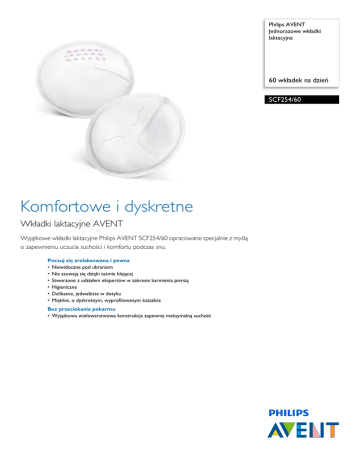 Philips AVENT Jednorazowe wkładki laktacyjne 60 wkładek na dzień SCF254/60 Komfortowe i dyskretne Wkładki laktacyjne AVENT Wyjątkowe wkładki laktacyjne Philips AVENT SCF254/60 opracowane specjalnie z myślą o zapewnieniu uczucia suchości i komfortu podczas snu. Poczuj się zrelaksowana i pewna • Niewidoczne pod ubraniem • Nie zsuwają się dzięki taśmie klejącej • Stworzone z udziałem ekspertów w zakresie karmienia piersią • Higieniczne • Delikatne, jedwabiste w dotyku • Miękkie, o dyskretnym, wyprofilowanym kształcie Bez przeciekania pokarmu • Wyjątkowa wielowarstwowa konstrukcja zapewnia maksymalną suchość SCF254/60 Jednorazowe wkładki laktacyjne 60 wkładek na dzień Dane techniczne Kraj pochodzenia Zalety Funkcje • Chiny • Wyjątkowa suchość: Kilka warstw, Wierzchnia warstwa z jednej strony Materiał • Wkładka laktacyjna: Przetestowana dermatologicznie Wymiary i waga Zawartość zestawu Maksymalna wygoda Wzornictwo Delikatne, jedwabiste w dotyku • Jednorazowe wkładki laktacyjne na dzień: 60 szt. • Dyskretny, wyprofilowany kształt Stworzone z udziałem ekspertów • Wymiary: 135 x 200 x 110 mm • Nie zsuwają się: Taśma klejąca • Delikatna, jedwabista w dotyku folia zewnętrzna: Oddychające, naturalne materiały, Przetestowana dermatologicznie • Stworzone z udziałem Vicky Scott — położnej i doradczyni w sprawach dzieci — która od 15 lat pomaga mamom w karmieniu piersią. Delikatne, jedwabiste w dotyku Delikatna, jedwabista w dotyku folia i oddychające, naturalne materiały. Przetestowane dermatologicznie. Data wydania 2014-03-27 © 2014 Koninklijke Philips N.V. Wszelkie prawa zastrzeżone. Wersja: 4.2.1 Dane techniczne mogą ulec zmianie bez powiadomienia. Znaki towarowe są własnością Koninklijke Philips N.V. lub własnością odpowiednich firm. www.philips.com