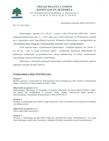 URZĄD MIASTA I GMINY KONSTANCIN-JEZIORNA 05-52 O KONSTANcIN-JEZIORNA, ul. Warszawska 32 tel.22 7564810,2275642 50, fax 22 7564885 Konstancin-Jezioma, dnia 10.03.2016 r. ZP. 271.10.2.2016 Zamawiający, zgodnie z art. 38 ust. I ustawy z dnia 29 stycznia 2004 roku — Prawo zamówień publicznych (Dz. U. z 2015 roku, poz. 2164) informuje, że Wykonawcy zwrócili się o wyjaśnienie treści Specyfikacji Istotnych Warunków Zamówienia w postępowaniu na: „Przebudowę ulicy Zakopane w Konstancinie-Jeziornie wraz z infrastrukturą” Treść zapytań wraz z wyjaśnieniami Zamawiający art. 38 ust. 1 pkt 3) wyżej cytowanej ustawy — — działając zgodnie z art. 38 ust. 2 i przekazuje niniejszym dokumentem do publicznej wiadomości za pośrednictwem strony internetowej, na której zamieszczono Specyfikację Istotnych Warunków Zamówienia. Informację o złożonych pytaniach Zamawiający sporządził według kolejności wpływu zapytania, kierując się data wpływu. Pytania zadane w dniu: 07.03.2016 roku: Pytanie 1: Bardzo prosimy o dołączenie do dokumentacji karty katalogowej albo rysunku technicznego słupa i uchwytów do mocowania kwiatów i flag. Odpowiedź napytanie nr 1: Zamawiający informuje, że rezygnuje z montażu uchwytów do mocowania kwiatów i flag i nie należy ich uwzględniać w wycenie oferty. Należy zastosować słupy zgodne z dokumentacją i warunkami technicznymi z dnia 24.04.20 15 r. Pytanie 2: Prosimy o informację jaka będzie waga uchwytów wraz z kwiatami mocowanymi na słupach oświetleniowych. Odpowiedź na pytanie nr 2: Patrz odpowiedź na pytanie 1. Pytanie 3: Prosimy o informację na jaki kolor mają być pomalowane słupy oświetleniowe i czy mają mieć elastomer, jeżeli tak to prosimy o podanie do jakiej wysokości ma być pomalowany? URZĄD MIASTA I GMINY KONSTANCIN-JEZIORNA 05-52 O KONSTANcIN-JEZIORNA, ul. Warszawska 32 tel. 22 756 48 10, 22 756 42 50, fax 22 756 48 85 -ji 1- Odpowiedź na pytanie nr 3: Zamawiający informuje, że należy zastosować słupy zgodne z dokumentacją i warunkami technicznymi z dnia 24.04.2015 r. Nie przewidziano malowania słupów ani zastosowania elastomeru. Pytanie 4: W części opisowej w punkcie B.1.5 jest napisane „Do projektu przyjęto słupy stalowe okrągłe ocynkowane tzw. BEZSZWOWE o wysokości 7m” natomiast w obliczeniach jest określona wysokość montażu oprawy na 8 metrach Prosimy o informację czy oprawa oświetleniowa będzie mocowana na sztorc, czy na wysięgniku. Jeżeli na wysięgniku to prosimy o informację o długości wysięgu. . Odpowiedź napytanie nr 4: Zamawiający informuje, że wysokość montażu oprawy wynosi 8m. Należy zastosować wysięgniki wg. normy dla słupów o wysokości do 1 Om. Pytanie 5: W której pozycji przedmiaru robót „Przebudowa oświetlenia ulicy Zakopane w Konstancinie Jeziornie” należy ująć roboty związane z ułożeniem bednarki FeZn 3Ox4mm o której jest mowa w opisie i w zestawieniu materiałów? — Odpowiedź na pytanie nr 5: Zamawiający informuje, że zgodnie z SIWZ przedmiar jest materiałem pomocniczym. Podstawą do wyceny oferty jest dokumentacja projektowa, specyfikacje techniczne wykonania i odbioru robót oraz postanowienia SIWZ. Pytanie 6: Prosimy o informację jakie złącza kablowe należy przyjąć do wyceny jest różnica w rodzaju złącz między przedmiarem „Przebudowa linii napowietrznej NN-0,4KV typu AL. Na kablową NN-O,4KV typu YAKXS 4x 1 20mm2”, zestawieniem materiałów i schematem ideowym rys nr E-2. Odpowiedź napytanie nr 6: Należy przyjąć 6 sztuk złącz, tj: ZK2!GTR2!SLI -2 szt. ZK2!GTR2!SL2 2 szt. ZK2/GTR 3/SL3 1 szt. -1 szt. ZK1/SL - - Pytanie 7: Bardzo prosimy o wskazanie które ilości należy przyjąć do wyceny te w przedmiarze, czy w zestawieniu materiałów (występują różnice w : ilość rury SRS1 10, ilość rury DVK1 10, ilość bednarki FeZn 3Ox4mrn). Odpowiedź napytanie nr 7: Należy przyjąć następujące ilości: URZĄD MIASTA I GMINY KONSTANCIN-JEZIORNA 05-52 O KONSTANcIN-JEZIORNA, ul. Warszawska 32 te!. 22 756 48 10, 22 756 42 50, fax 22 756 48 85 1 SRS 110—ok. 49m DyK 110- ok.43m Bednarka prowadzona po trasie kabla w wykopie — — przyjąć na podstawie długości kabla. Pytanie zadane w dniu 10.03.2016 roku: Pytanie 1: W załączniku nr 7 do SIWZ w punkcie 8 jest wpisana zieleń. Natomiast brak jest dokumentacji zieleni. Prosimy o zamieszczenie lub usunięcie zielni z załącznika nr 7 Odpowiedź napytanie nr 1: Zamawiający informuje, że prace związane z urządzeniem zieleni obejmują obsianie trawą projektowanego pobocza gruntowego, co należy ująć w ofercie. Pozostałe zapisy treści Specyfikacji Istotnych Warunków Zamówienia pozostają bez zmian. Sporz.w]egz. URMISTRZ mgr m”rz LLI5ńczuk