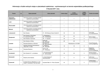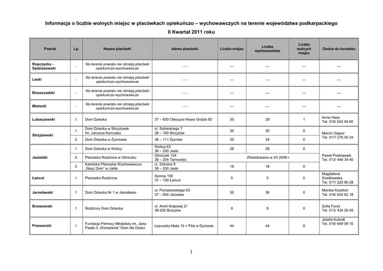Informacja o liczbie wolnych miejsc w placówkach opiekuńczo – wychowawczych na terenie województwa podkarpackiego II Kwartał 2011 roku Lp. Nazwa placówki Adres placówki Liczba miejsc Liczba wychowanków Liczba wolnych miejsc Osoba do kontaktu Ropczycko Sędziszowski - Na terenie powiatu nie istnieją placówki opiekuńczo-wychowawcze --- --- --- --- --- Leski - Na terenie powiatu nie istnieją placówki opiekuńczo-wychowawcze --- --- --- --- --- Bieszczadzki - Na terenie powiatu nie istnieją placówki opiekuńczo-wychowawcze --- --- --- --- --- Mielecki - Na terenie powiatu nie istnieją placówki opiekuńczo-wychowawcze --- --- --- --- --- Lubaczowski 1. Dom Dziecka 37 – 630 Oleszyce Nowa Grobla 83 30 29 1 1. Dom Dziecka w StrzyŜowie Im. Janusza Korczaka ul. Sobieskiego 7 38 – 100 StrzyŜów 30 30 0 2. Dom Dziecka w śyznowie 38 – 111 śyznów 30 34 0 1. Dom Dziecka w Wolicy 28 28 0 2. Placówka Rodzinna w Gliniczku 3. Katolicka Placówka Wychowawcza „Nasz Dom” w Jaśle Łańcut 1. Placówka Rodzinna Jarosławski 1. Powiat StrzyŜowski Jasielski Brzozowski Przeworski Wolica 63 38 – 200 Jasło Gliniczek 104 38 – 204 Tarnowiec ul. Szkolna 9 38 – 200 Jasło Anna Hass Tel. 016/ 632 94 60 Marcin Gąsior Tel. 017/ 276 50 34 Paweł Podstawski Tel. 013/ 448 34 40 Zlikwidowana w VII 2008 r. 18 18 0 Sonina 150 37 – 100 Łańcut 5 5 0 Magdalena Szadkowska Tel. 017/ 225 80 28 Dom Dziecka Nr 1 w Jarosławiu ul. Poniatowskiego 63 37 – 500 Jarosław 30 36 0 Monika Kozdroń Tel. 016/ 624 62 18 1. Rodzinny Dom Dziecka ul. Armii Krajowej 21 36-200 Brzozów 8 8 0 Zofia Foryś Tel. 013/ 434 20 45 1. Fundacja Pomocy MłodzieŜy im. Jana Pawła II „Wzrastanie” Dom dla Dzieci Łopuszka Mała 13 + Filia w Dynowie 44 44 0 1 Józefa Kubrak Tel. 016/ 649 09 10 1. Tarnobrzeski 2. Dom Dziecka w Skopaniu Placówka Opiekuńczo – Wychowawcza /Zespól Socjalizacyjny/ 39 – 451 Skopanie 186 ul. Św. Barbary 1 39 – 400 Tarnobrzeg Placówka Opiekuńczo – Wychowawcza /Zespól Interwencyjny/ 44 41 3 20 21 0 10 1 9 Krystyna Duma Tel. 015/ 822 13 40 Marta Wojciechowska Tel. 015/ 823 07 38 3. Rodzinny Dom Dziecka ul. Słoneczna 17 39 – 400 Tarnobrzeg 8 9 0 1. Dom Dziecka im. Ks. Zygmunta Gorazdowskiego ul. Grodzka 2 38 – 400 Krosno 30 28 2 2. Dom Dziecka im. Janusza Korczaka w Długiem Długie 9 38 – 460 Jedlicze 30 28 2 3. Katolicka Placówka Wychowawcza „Nasz Dom” w Miejscu Piastowym ul. Ks. B. Markiewicza 22 38 - 430 Miejsce Piastowe 12 13 0 4. Rodzinny Dom Dziecka w Głowience ul. Podgórze 76 38 – 455 Głowienka 8 8 0 5. Rodzinny Dom Dziecka w Targowiskach ul. Suchodolskiego 5, Targowiska 38 – 430 Miejsce Piastowe 8 9 0 6. Rodzinny Dom Dziecka w Widaczu Widacz 136 38 – 430 Miejsce Piastowe 8 11 0 Dębicki 1. Dom Dziecka „Hanka” ul. Gawrzyłowska 33 39 – 200 Dębica 24 27 0 Aleksandra Kurcz Tel. 014/ 680 31 21 NiŜański 1. Dom Dziecka „Nasz Dom Dzieciątka Jezus” ul. Piaskowa 11 37 – 420 Rudnik n. Sanem 30 32 0 Renata Mazur Tel. 015/ 841 63 68 wew. 25 1. Placówka Opiekuńczo – Wychowawcza w Nienadowej Nienadowa 555 37 – 750 Dubiecko 30 31 0 Prałkowce 240 37 – 700 Przemyśl 30 26 4 ElŜbieta Gac Tel. 013/ 432 00 39 Krośnieński 2. Dom Dziecka „Moja Rodzina” w Prałkowcach 3. Dom dla dzieci „Nasza Chata” ul. Siemiradzkiego 6A 37 – 700 Przemyśl 28 30 0 4. Wielofunkcyjna Placówka Opiekuńczo – Wychowawcza „Maciek” ul. Jasińskiego 1 37 – 700 Przemyśl 40 45 0 ElŜbieta Mierzyńska Tel. 013/ 437 57 34 Katarzyna Szpakowska Tel. O16/ 678 50 54 wew. 128 Przemyski 2 Wioletta Zachajusz Tel. 016/ 675 05 59 Wew. 70 1. 2. Rzeszowski 3. Placówka Opiekuńczo – Wychowawcza w Budziwoju Katolicka Placówka Opiekuńczo – Wychowawczo - Socjalizacyjna Katolicka Placówka Opiekuńczo – Wychowawczo – Interwencyjna dla niemowląt Zespół Placówek Opiekuńczo – Wychowawczych Dom dla Dzieci i MłodzieŜy „Mieszko” w Rzeszowie w tym: Dom Małego Dziecka – placówka socjalizacyjna ( 0 - 3 r. Ŝ.) Dom dla Dzieci i MłodzieŜy – placówka socjalizacyjna ( 3 -18 r. Ŝ.) ul. Budziwojska 149 35 – 317 Rzeszów 30 17 13 30 32 0 10 6 4 25 19 6 30 30 0 30 22 8 4 3 1 36 – 004 Łąka 260 a Joanna Graboń Tel. 017/ 867 14 22 ul. Nizinna 30 35 – 303 Rzeszów ul. Unii Lubelskiej 4 35 – 016 Rzeszów ul. Bernackiego 14 35 – 602 Rzeszów Marcin Peszko, Monika Machowicz Tel. 017/ 863 69 33 w.26 4. Pogotowie Opiekuńcze w Rzeszowie 5. Rodzinny Dom Dziecka LeŜajski 1 Dom Dziecka w Nowej Sarzynie ul. Łukaszewicza 3 37 – 310 Nowa Sarzyna 30 35 Kolbuszowski 1. Katolicka Placówka Wychowawcza „Nasz Dom” Zgromadzenia Sióstr św. Michała 36 – 145 Widełka 153 12 11 1 Marta Furgał Tel. 017/ 744 57 15 Sanocki 1. Powiatowa Placówka Socjalizacyjna ul. Sadowa 21 38 – 500 Sanok 30 30 0 Anna Chytła Tel. 013/ 464 54 45 1. Dom Dziecka ul. Podleśna 6 37 – 450 Stalowa Wola 30 28 2 2. Dom Dziecka „Ochronka” ul. Wałowa 46 37 – 450 Stalowa Wola 40 37 3 3. Placówka Interwencyjna dla Dzieci i MłodzieŜy przy ZP KOOW „Oratorium” ul. Ofiar Katynia 57 37 – 450 Stalowa Wola 8 7 1 892 869 60 Stalowowolski W sumie 3 0 Aneta CzaplaKaszowska 017/ 242 82 58 Grzegorz Kwitek Tel. 015/ 643 36 67 -