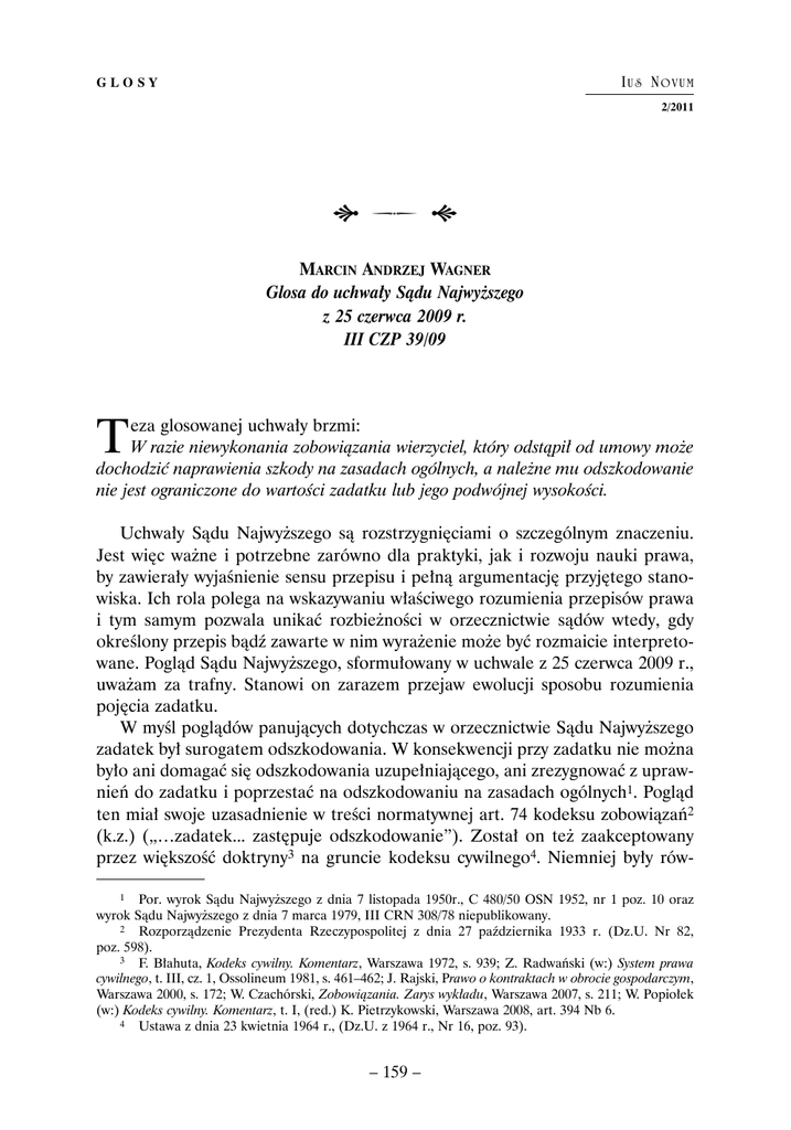 IUS NOVUM GLOSY 2/2011 MARCIN ANDRZEJ WAGNER Glosa do uchwały Sądu Najwyższego z 25 czerwca 2009 r. III CZP 39/09 T eza glosowanej uchwały brzmi: W razie niewykonania zobowiązania wierzyciel, który odstąpił od umowy może dochodzić naprawienia szkody na zasadach ogólnych, a należne mu odszkodowanie nie jest ograniczone do wartości zadatku lub jego podwójnej wysokości. Uchwały Sądu Najwyższego są rozstrzygnięciami o szczególnym znaczeniu. Jest więc ważne i potrzebne zarówno dla praktyki, jak i rozwoju nauki prawa, by zawierały wyjaśnienie sensu przepisu i pełną argumentację przyjętego stanowiska. Ich rola polega na wskazywaniu właściwego rozumienia przepisów prawa i tym samym pozwala unikać rozbieżności w orzecznictwie sądów wtedy, gdy określony przepis bądź zawarte w nim wyrażenie może być rozmaicie interpretowane. Pogląd Sądu Najwyższego, sformułowany w uchwale z 25 czerwca 2009 r., uważam za trafny. Stanowi on zarazem przejaw ewolucji sposobu rozumienia pojęcia zadatku. W myśl poglądów panujących dotychczas w orzecznictwie Sądu Najwyższego zadatek był surogatem odszkodowania. W konsekwencji przy zadatku nie można było ani domagać się odszkodowania uzupełniającego, ani zrezygnować z uprawnień do zadatku i poprzestać na odszkodowaniu na zasadach ogólnych1. Pogląd ten miał swoje uzasadnienie w treści normatywnej art. 74 kodeksu zobowiązań2 (k.z.) („…zadatek... zastępuje odszkodowanie”). Został on też zaakceptowany przez większość doktryny3 na gruncie kodeksu cywilnego4. Niemniej były rów1 Por. wyrok Sądu Najwyższego z dnia 7 listopada 1950r., C 480/50 OSN 1952, nr 1 poz. 10 oraz wyrok Sądu Najwyższego z dnia 7 marca 1979, III CRN 308/78 niepublikowany. 2 Rozporządzenie Prezydenta Rzeczypospolitej z dnia 27 października 1933 r. (Dz.U. Nr 82, poz. 598). 3 F. Błahuta, Kodeks cywilny. Komentarz, Warszawa 1972, s. 939; Z. Radwański (w:) System prawa cywilnego, t. III, cz. 1, Ossolineum 1981, s. 461–462; J. Rajski, Prawo o kontraktach w obrocie gospodarczym, Warszawa 2000, s. 172; W. Czachórski, Zobowiązania. Zarys wykładu, Warszawa 2007, s. 211; W. Popiołek (w:) Kodeks cywilny. Komentarz, t. I, (red.) K. Pietrzykowski, Warszawa 2008, art. 394 Nb 6. 4 Ustawa z dnia 23 kwietnia 1964 r., (Dz.U. z 1964 r., Nr 16, poz. 93). – 159 – IUS NOVUM GLOSY 2/2011 nież wyrażane odmienne zapatrywania. Zdaniem Czesławy Żuławskiej5, o i ile pogląd przyjmujący, że zadatek należy traktować jako surogat odszkodowania, był uzasadniony na gruncie art. 74 k.z., o tyle inna treść normatywna art. 394 k.c. pozbawia go tego uzasadnienia. W glosowanym orzeczeniu podstawę rozstrzygnięcia stanowił następujący stan faktyczny. Oto strony zawarły umowę, w której pozwany zobowiązał się do wybudowania, a następnie przeniesienia na rzecz powoda własności domu jednorodzinnego. Strony nadto ustaliły, że należyte wykonanie umowy będzie zabezpieczać zadatek. Pozwany nie wywiązał się ze swojego obowiązku, a powód nie odstąpił od umowy i wystąpił przeciwko pozwanemu z powództwem odszkodowawczym. Zdaniem sądu okręgowego, orzekającego w I instancji, skoro strony ustanowiły zadatek, to roszczenie odszkodowawcze powoda ogranicza się tylko do żądania zwrotu zadatku w podwójnej wysokości, a ponieważ pozwany zwrócił powodowi zadatek w tej wysokości, należało oddalić powództwo. Powód, nie godząc się z takim rozstrzygnięciem, wniósł apelację. Sąd apelacyjny, rozpoznając apelację dostrzegł poważne wątpliwości prawne i przedstawił Sądowi Najwyższemu do rozstrzygnięcia zagadnienie prawne następującej treści: Czy w przypadku gdy wierzyciel nie skorzystał z możliwości odstąpienia od umowy na podstawie art. 394 § 1 k.c., a do niewykonania umowy doszło ze względu na okoliczności, za które wyłączną odpowiedzialność ponosi dłużnik, wysokość świadczenia odszkodowawczego, jakiego wierzyciel może się domagać, jest ograniczona do wartości przedmiotu zadatku lub jego podwójnej wysokości. Sąd Najwyższy, udzielając odpowiedzi na przedstawione zagadnienie prawne, doszedł do wniosku, że art. 394 § 1 k.c. nie może być rozumiany jako przepis szczególny w stosunku do art. 471 i nast. k.c., wobec czego ustanowiony w umowie zadatek nie wyklucza roszczenia o naprawienie szkody na zasadach ogólnych. Innymi słowy, wierzyciel, który w takiej sytuacji nie odstąpił od umowy, może dochodzić naprawienia szkody na zasadach ogólnych, a należne mu z tego tytułu odszkodowanie nie jest ograniczone do wartości zadatku lub jego podwójnej wysokości. Częściowo przeciw przedstawionemu stanowisku Sądu Najwyższego w glosowanym orzeczeniu opowiedział się Piotr Machnikowski6. Stwierdza on mianowicie, że po to, by wierzyciel mógł domagać się naprawienia szkody spowodowanej niewykonaniem zobowiązania, musi przedtem zrezygnować z wykonania zobowiązania nie tylko w myśl art. 477 § 2 k.c., art. 491 k.c., 492 k.c., ale także z art. 394 k.c. Odstąpienie od umowy stanowi rezygnację z wykonania zobowiązania, zatem wierzyciel musi skorzystać z przysługującego mu prawa do odstą- 5 Cz. Żuławska (w:) Komentarz do kodeksu cywilnego. Księga trzecia. Zobowiązania, t. 1, Warszawa 1996, s. 152. 6 P. Machnikowski (w:) Kodeks cywilny. Komentarz, (red.) E. Gniewek, Warszawa 2010, art. 394, Nb 10. – 160 – IUS NOVUM GLOSY 2/2011 pienia od umowy. Z kolei Adam Olejniczak7 stwierdza, że wierzyciel nie musi korzystać z prawa do odstąpienia od umowy. Zdaniem autora glosy, wykładnia gramatyczna art. 394 k.c. prowadzi do wniosku, że wierzyciel, jeśli chce skorzystać z uprawnienia do żądania zadatku lub jego podwójnej wysokości, musi wpierw od umowy odstąpić. Wynika to bezpośrednio z treści art. 394 k.c. („…druga strona może…od umowy odstąpić i otrzymany zadatek zachować…”). Zastosowana przez ustawodawcę koniunkcja polegająca na u