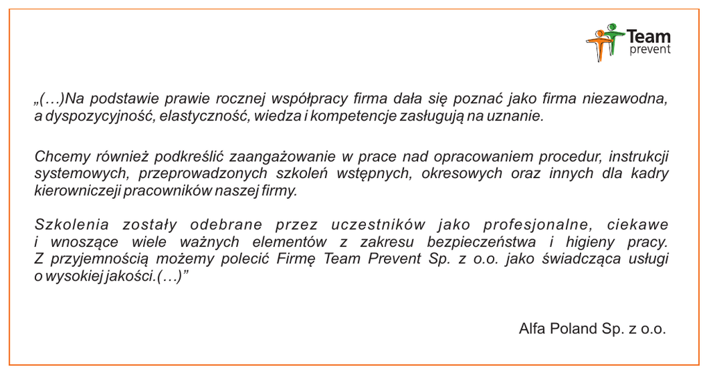 „(…)Na podstawie prawie rocznej wspó³pracy firma da³a siê poznaæ jako firma niezawodna, a dyspozycyjnoœæ, elastycznoœæ, wiedza i kompetencje zas³uguj¹ na uznanie. Chcemy równie¿ podkreœliæ zaanga¿owanie w prace nad opracowaniem procedur, instrukcji systemowych, przeprowadzonych szkoleñ wstêpnych, okresowych oraz innych dla kadry kierowniczeji pracowników naszej firmy. Szkolenia zosta³y odebrane przez uczestników jako profesjonalne, ciekawe i wnosz¹ce wiele wa¿nych elementów z zakresu bezpieczeñstwa i higieny pracy. Z przyjemnoœci¹ mo¿emy poleciæ Firmê Team Prevent Sp. z o.o. jako œwiadcz¹ca us³ugi o wysokiej jakoœci.(…)” Alfa Poland Sp. z o.o.