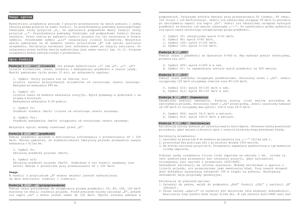 Uwagi ogólne Wyœwietlacz urz¹dzenia posiada 3 pozycje przeznaczone na wynik pomiaru i jedn¹ skrajn¹ praw¹ pozycjê na numer funkcji. Do przechodzenia pomiêdzy poszczególnymi funkcjami s³u¿y przycisk „F„. Do wybierania podpunktów danej funkcji s³u¿y przycisk „-”. Przechodzenie pomiêdzy funkcjami lub podpunktami funkcji dzia³a okrê¿nie. Przez chwilê po wybraniu funkcji pojawia siê jej oznaczenie w formie symbolu. Przyk³adem symbol „Lic” oznaczaj¹cy licznik kilometrów. Wszystkie wyniki pamiêtane s¹ do momentu resetu przyciskiem „R” lub zaniku zasilania urz¹dzenia. Kalibracja natomiast jest zachowana nawet po zdjêciu zasilania. Po za³¹czeniu przez krótk¹ chwilê wyœwietlany jest numer wersji (np. v1.1). Program urz¹dzenia mo¿na zaktualizowaæ u producenta. Opis funkcji Funkcja 1 - „Lic” (licznik) (na prawym wyœwietlaczu „1” lub „b”, „c”, „d”) Licznik kilometrów, czasu, œredniej i maksymalnej prêdkoœci w czasie jazdy. Wyniki pamiêtane tylko przez 15 min. po wy³¹czeniu zap³onu. 1. Symbol (który pojawia siê na chwilê) Lic: Licznik ³¹cznie przejechanych kilometrów od ostatniego resetu rêcznego. Maksymalne wskazanie 999 km. b. Symbol cS: Licznik czasu od momentu w³¹czenia stacyjki. Wynik podawany w godzinach i za kropk¹ w minutach. Maksymalne wskazanie 9.59 godzin. c. Symbol Pr: Prêdkoœæ œrednia (km/h) liczona od ostatniego resetu rêcznego. d. Symbol Prr: Prêdkoœæ maksymalna (km/h) osi¹gniêta od ostatniego resetu rêcznego. Wszystkie wyniki mo¿emy resetowaæ przez „R”. Funkcja 2 - „Pr” (prêdkoœæ) Pomiar prêdkoœci pojazdu z mo¿liwoœci¹ informowania o przekroczeniu 60 i 100 km/h. Nale¿y pamiêtaæ, ¿e szybkoœciomierz fabryczny pojazdu przewa¿nie zawy¿a wskazania o kilka km. 2. Symbol Pr: Aktualna prêdkoœæ pojazdu (km/h). b. Symbol biP: Aktualna prêdkoœæ pojazdu (km/h). Dodatkowo w tej funkcji wydawany jest krótki dŸwiêk z g³oœniczka przy przekraczaniu 60 i 100 km/h. Uwaga W funkcji 2 przyciskiem „R” mo¿esz zmieniæ jasnoœæ wyœwietlacza. S¹ dwie mo¿liwoœci (jaœniej i ciemniej). podpunktach. Us³yszymy krótkie dŸwiêki przy przekraczaniu 50 (jeden), 80 (dwa), 100 (trzy) i 120 km/h(cztery). Je¿eli nie zdo³aliœmy osi¹gn¹æ 50 km/h to ponownie po zatrzymaniu zapali siê napis „Go”. Je¿eli nie zdo³aliœmy osi¹gn¹æ wy¿szych prêdkoœci na miejscu ich wyniku zobaczymy „---”. Po zakoñczeniu próby wyœwietla siê wynik czasu ostatniego osi¹gniêtego progu prêdkoœci. 3. b. c. d. Symbol Symbol Symbol Symbol 50: odczytujemy wynik 0÷50 km/h. 80: wynik 0÷80 km/h. 100: wynik 0÷100 km/h. 120: wynik 0÷120 km/h. Funkcja 4 - „400” Pomiar czasu i prêdkoœci na dystansie 0÷400 m. Aby wykonaæ pomiar resetujemy, pojawia siê „Go”. 4. Symbol 400: wynik 0÷400 m w sek. B. Symbol Pr: tu zapamiêtany zostaje wynik prêdkoœci na 400 metrze. Funkcja 5 - „610” Pomiar czasu pomiêdzy osi¹ganymi prêdkoœciami. Konieczny reset i „Go”. Je¿eli osi¹gniemy 120 km/h otrzymamy równie¿ czas 80-120 km/h. 5. Symbol 610: wynik 60÷100 km/h w sek. b. Symbol 812: wynik 80÷120 km/h w sek. Funkcja 6 - „H50” (hamowanie) Dynamiczne pomiary hamowania. Funkcja mierzy iloœæ metrów potrzebn¹ do zatrzymania pojazdu. Konieczny reset i „Go” przed prób¹. Je¿eli zaczniemy hamowaæ od 100 km/h to otrzymamy dwa wyniki: 100÷0 oraz 50÷0 km/h. 6. Symbol H50: wynik 50÷0 km/h w metrach. b. Symbol H10: wynik 100÷0 km/h w metrach. Funkcja 7 - „CAL” (kalibracja) Kalibracjê nale¿y wykonaæ po zainstalowaniu Auto-Speca. Okresowo mo¿na powtarzaæ procedurê, gdy¿ zmiana ciœnienia opon i zu¿ycie bie¿nika mog¹ powodowaæ b³êdy. Kalibracja urz¹dzenia: 1. naciskaæ na przycisk R do momentu pojawienia siê „---” (kilka sek.). 2. przejechaæ bez poœlizgu kó³ i po prostej drodze 1000 metrów. 3. Na krótko nacisn¹æ przycisk R. Urz¹dzenie zapamiêta wyœwietlon¹ w tym momencie liczbê impulsów. Podczas jazdy urz¹dzenie zlicza iloœæ impulsów na odcinku 1 km. Liczba ta jest wyœwietlana przewa¿nie bez ostatniej pozycji, gdy¿ najczêœciej otrzymywana jest wartoœæ z przedzia³u 1000÷8000. Dok³adnoœæ kalibracji ma istotne znaczenie. Mo¿emy kalibrowaæ w oparciu o licznik pojazdu, ale przeniesiemy jego ewentualny b³¹d. Przy nowych drogach doœæ dok³adnie wyznaczaj¹ odleg³oœæ 100 m s³upki na poboczu. Najwiêksz¹ dok³adnoœæ daj¹ przyrz¹dy geodezyjne. Funkcja 3 - „50” (przyspieszenie) Pomiar czasu potrzebnego do osi¹gniêcia progów prêdkoœci: 50, 80, 100, 120 km/h mierzony od chwili ruszenia pojazdu. Przed pomiarem nale¿y nacisn¹æ „R”, poka¿e sie napis „Go” i mo¿na jechaæ nawet do 120 km/h. Wyniki zostan¹ zebrane w Kalibracja do pomiarów paliwa: 1. Zatankuj do pe³na, wejdŸ do podpunktu „EnG” funkcji „CAL” i naciœnij „R” (d³u¿ej). 2. Teraz nale¿y „spaliæ” co najmniej pó³ zbiornika (dla wiêkszej dok³adnoœci). Realizacja tego punktu mo¿e zaj¹c kilka dni. W tym okresie Auto-SPEC musi byæ 2 3 ci¹gle pod³¹czone do zasilanej (12V) instalacji samochodu. 3. Ponownie zatankuj do pe³na, zanotuj iloœæ paliwa i wartoœæ „EnG” oraz podziel iloœæ paliwa przez „EnG”. Otrzymasz wspó³czynnik „Ust”. Przyk³ad - paliwo = 51,0 litra - wskazanie „EnG” = 6.15 - „Ust” = 510 / 615 = 0,83 - wprowadzamy do Auto-SPEC’a liczbê = 083 (patrz punkt 4.) 4. WprowadŸ wspó³czynnik „Ust” do AutoSpec: - wejdŸ do „Ust” funkcji „CAL”. - naciœnij „R”, a¿ zacznie migaæ jedna pozycja. - klawiszami „F” i „-” ustaw w³aœciw¹ wartoœæ w migaj¹cej pozycji. - zacznie migaæ nastêpna pozycja, któr¹ te¿ nale¿y ustawiæ itp. Kropki dziesiêtnej nie wprowadzamy. 5. Koñczymy przez naciœniêcie „R”. Instrukcja obs³ugi v 1.1 UWAGA Je¿eli nie chcesz samemu wprowadzaæ wspó³czynnika,poproœ o to instalatora. Funkcja 8 - „PAL” (zu¿