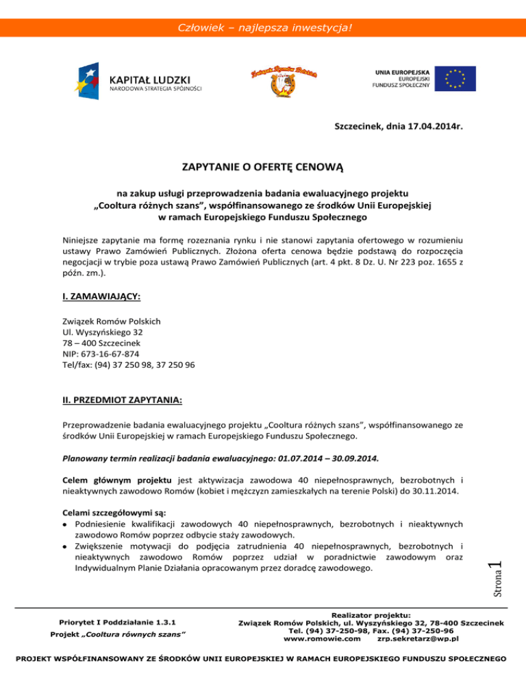 Człowiek – najlepsza inwestycja! Szczecinek, dnia 17.04.2014r. ZAPYTANIE O OFERTĘ CENOWĄ na zakup usługi przeprowadzenia badania ewaluacyjnego projektu „Cooltura różnych szans”, współfinansowanego ze środków Unii Europejskiej w ramach Europejskiego Funduszu Społecznego Niniejsze zapytanie ma formę rozeznania rynku i nie stanowi zapytania ofertowego w rozumieniu ustawy Prawo Zamówieo Publicznych. Złożona oferta cenowa będzie podstawą do rozpoczęcia negocjacji w trybie poza ustawą Prawo Zamówieo Publicznych (art. 4 pkt. 8 Dz. U. Nr 223 poz. 1655 z późn. zm.). I. ZAMAWIAJĄCY: Związek Romów Polskich Ul. Wyszyoskiego 32 78 – 400 Szczecinek NIP: 673-16-67-874 Tel/fax: (94) 37 250 98, 37 250 96 II. PRZEDMIOT ZAPYTANIA: Przeprowadzenie badania ewaluacyjnego projektu „Cooltura różnych szans”, współfinansowanego ze środków Unii Europejskiej w ramach Europejskiego Funduszu Społecznego. Planowany termin realizacji badania ewaluacyjnego: 01.07.2014 – 30.09.2014. Priorytet I Poddziałanie 1.3.1 Projekt „Cooltura równych szans” Strona Celami szczegółowymi są: Podniesienie kwalifikacji zawodowych 40 niepełnosprawnych, bezrobotnych i nieaktywnych zawodowo Romów poprzez odbycie staży zawodowych. Zwiększenie motywacji do podjęcia zatrudnienia 40 niepełnosprawnych, bezrobotnych i nieaktywnych zawodowo Romów poprzez udział w poradnictwie zawodowym oraz Indywidualnym Planie Działania opracowanym przez doradcę zawodowego. 1 Celem głównym projektu jest aktywizacja zawodowa 40 niepełnosprawnych, bezrobotnych i nieaktywnych zawodowo Romów (kobiet i mężczyzn zamieszkałych na terenie Polski) do 30.11.2014. Realizator projektu: Związek Romów Polskich, ul. Wyszyńskiego 32, 78-400 Szczecinek Tel. (94) 37-250-98, Fax. (94) 37-250-96 www.romowie.com [email protected] PROJEKT WSPÓŁFINANSOWANY ZE ŚRODKÓW UNII EUROPEJSKIEJ W RAMACH EUROPEJSKIEGO FUNDUSZU SPOŁECZNEGO Człowiek – najlepsza inwestycja! Zwiększenie szans na odbycie stażu kobietom romskim, które wychowują małoletnie dzieci, poprzez zapewnienie dzieciom opieki w placówkach edukacyjno - wychowawczych w czasie trwania stażu. Podniesienie kwalifikacji zawodowych niepełnosprawnych, bezrobotnych i nieaktywnych zawodowo Romów poprzez sfinansowanie dla 6 osób kursu prawa jazdy kategorii B. Wzrost świadomości otoczenia, w szczególności pracodawców, na temat możliwości zatrudnienia osób niepełnosprawnych pochodzenia romskiego zamieszkałych na terenie Polski. III.OPIS PRZEDMIOTU EWALUACJI: 1. Cele ewaluacji projektu diagnoza barier i możliwości integracji zawodowej osób niepełnosprawnych pochodzenia romskiego; diagnoza opinii i postaw wobec zatrudniania niepełnosprawnych osób pochodzenia romskiego; 2. Zakres badania Badaniem objęci zostaną pracodawcy i stażyści biorący udział w zadaniu, a także Urzędy Pracy i Ośrodki Pomocy Społecznej z terenu całej Polski. Badanie będzie miało charakter poznawczy, emocjonalny i behawioralny beneficjentów ostatecznych oraz przedstawicieli Urzędów Pracy i Ośrodków Pomocy Społecznej, wobec zmian zachodzących w Polsce. 3. Wymagane metody/techniki badawcze: Badanie zostanie zrealizowane w oparciu o analizy danych zastanych (desk research), wywiady, ankiety/kwestionariusze. Wykonawca może zaproponowad zastosowanie dodatkowych metod badawczych. 4. Kryteria ewaluacji: Wykonawca dokona oceny zebranego materiału na podstawie następujących kryteriów ewaluacyjnych: - skuteczności, - trafności, - efektywności. Strona 2 5. Kluczowe pytania badawcze: Pytania badawcze powinny dotyczyd barier i możliwości integracji zawodowej osób niepełnosprawnych pochodzenia romskiego, a także opinii i postaw wobec zatrudniania niepełnosprawnych osób z mniejszości romskiej. Wykonawca może zaproponowad zastosowanie dodatkowe pytania badawcze. Priorytet I Poddziałanie 1.3.1 Projekt „Cooltura równych szans” Realizator projektu: Związek Romów Polskich, ul. Wyszyńskiego 32, 78-400 Szczecinek Tel. (94) 37-250-98, Fax. (94) 37-250-96 www.romowie.com [email protected] PROJEKT WSPÓŁFINANSOWANY ZE ŚRODKÓW UNII EUROPEJSKIEJ W RAMACH EUROPEJSKIEGO FUNDUSZU SPOŁECZNEGO Człowiek – najlepsza inwestycja! 6. Prezentacja wyników badania: W ramach zamówienia Wykonawca dostarczy: A. Raport metodologiczny, który będzie zawierał następujące elementy: 1. Szczegółowy opis procesu realizacji zamówienia ze wskazaniem harmonogramu oraz zakresem obowiązków i podziałem odpowiedzialności członków zespołu ewaluatorów; 2. Szczegółowy opis metodologii (metod i technik badawczych); 3. Narzędzia badawcze przewidziane do wykorzystania w badaniu; 4. Szczegółowy opis sposobu doboru prób. Dane pozyskane z badao ankietowych zostaną zakodowane i dostarczone w postaci tabel krzyżowych w formacie MS EXCEL. B. Wstępną wersję Raportu koocowego – 1 sztuka w wersji papierowej oraz 1 sztuka w wersji elektronicznej na adres mailowy [email protected]. Termin dostarczenia: 30.08.2014r. C. Ostateczną wersję Raportu koocowego wraz z dokumentami zawierającymi zgromadzony materiał badawczy – 2 sztuki w wersji papierowej oraz 1 sztuka w wersji elektronicznej CD/DVD. Termin dostarczenia: 12.09.2014r. D. Multimedialną prezentację wyników badania. Prezentacja zostanie dostarczona w 1 egzemplarzu w formacie MS Power Point na płycie CD/DVD. Termin dostarczenia: 30.09.2014r. Priorytet I Poddziałanie 1.3.1 Projekt „Cooltura równych szans” Strona RAPORT KOOCOWY zawierał będzie następujące elementy: 1. Jednostronicowe podsumowanie. 2. Spis treści. 3. Wprowadzenie 4. Opis przedmiotu badania, celów badania. 5. Streszczenie najważniejszych wniosków i rekomendacji. 6. Opis metodologii. 7. Prezentacja najważniejszych wyników badania. 8. Odpowiedzi na pytania badawcze. 9. Wnioski i rekomendacje, ze wskazaniem proponowanych działao oraz przypisanych im adresatów zostaną przedstawione w formie tabeli. 10. Zgromadzony materi