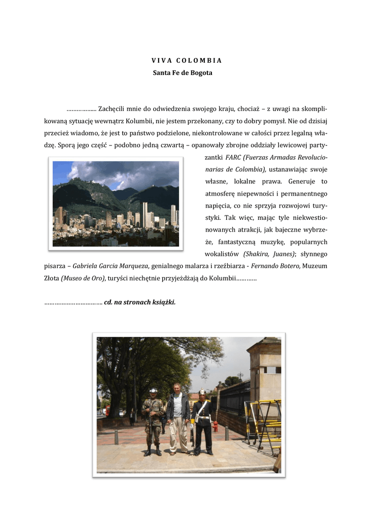 VIVA COLOMBIA Santa Fe de Bogota ……………... Zachęcili mnie do odwiedzenia swojego kraju, chociaż – z uwagi na skomplikowaną sytuację wewnątrz Kolumbii, nie jestem przekonany, czy to dobry pomysł. Nie od dzisiaj przecież wiadomo, że jest to państwo podzielone, niekontrolowane w całości przez legalną władzę. Sporą jego część – podobno jedną czwartą – opanowały zbrojne oddziały lewicowej partyzantki FARC (Fuerzas Armadas Revolucionarias de Colombia), ustanawiając swoje własne, lokalne prawa. Generuje to atmosferę niepewności i permanentnego napięcia, co nie sprzyja rozwojowi turystyki. Tak więc, mając tyle niekwestionowanych atrakcji, jak bajeczne wybrzeże, fantastyczną muzykę, popularnych wokalistów (Shakira, Juanes); słynnego pisarza – Gabriela Garcia Marqueza, genialnego malarza i rzeźbiarza - Fernando Botero, Muzeum Złota (Museo de Oro), turyści niechętnie przyjeżdżają do Kolumbii………… ……………………………. cd. na stronach książki.