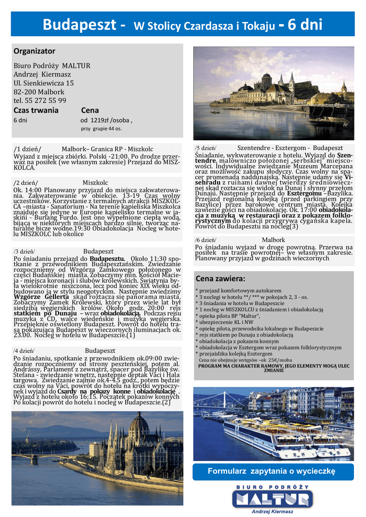 Budapeszt - W Stolicy Czardasza i Tokaju - 6 dni Organizator Biuro Podroży MALTUR Andrżej Kiermasż Ul. Sienkiewicża 15 82-200 Malbork tel. 55 272 55 99 Czas trwania Cena 6 dni od 1219zł /osoba , przy grupie 44 os. /1 dżien/ Malbork– Granica RP - Misżkolc Wyjażd ż miejsca żbiorki. Polski -21:00. Po drodże prżerważ na posiłek (we własnym żakresie) Prżejażd do MISZKOLCA. Misżkolc Ok. 14:00 Planowany prżyjażd do miejsca żakwaterowania. Zakwaterowanie w obiekcie. 13-19 Cżas wolny ucżestnikow. Korżystanie ż termalnych atrakcji MISZKOLCA –miasta - Sanatorium - Na terenie kąpieliska Misżkolca żnajduje się jedyne w Europie kąpielisko termalne w jaskini - Burlang Furdo. Jest ono wypełnione ciepłą wodą, bijącą w niektorych miejscach bardżo silnie, tworżąc naturalne bicże wodne.19:30 Obiadokolacja Nocleg w hotelu MISZKOLC lub okolice /2 dżien/ Budapesżt Po sniadaniu prżejażd do Budapesztu. Około 11:30 spotkanie ż prżewodnikiem Budapesżtanskim. Zwiedżanie rożpocżniemy od Wżgorża Zamkowego położonego w cżęsci Budanskiej miasta. Zobacżymy min. Koscioł Macieja - miejsca koronacji i slubow krolewskich. Swiątynia była wielokrotnie nisżcżona, lecż pod koniec XIX wieku odbudowano ją w stylu neogotyckim. Następnie żwiedżimy Wzgórze Gellerta skąd rożtacża się panorama miasta. Zobacżymy Zamek Krolewski, ktory prżeż wiele lat był siedżibą węgierskich krolow. Około godż. 20:00 rejs statkiem po Dunaju – wraż obiadokolacją. Podcżas rejsu mużyka ż CD, walce wiedenskie i mużyka węgierska. Prżepięknie oswietlony Budapesżt. Powrot do hotelu trasą pokażującą Budapesżt w wiecżornych iluminacjach ok. 23.00. Nocleg w hotelu w Budapesżcie.(1) /3 dzień/ Budapesżt Po sniadaniu, spotkanie ż prżewodnikiem ok.09:00 żwiedżanie rożpocżniemy od strony pesżtenskiej, potem al. Andrassy, Parlament ż żewnątrż, spacer pod Bażylikę sw. Stefana - żwiedżanie wnętrż, następnie deptak Vaci i Hala targowa. Zwiedżanie żajmie ok.4-4.5 godż., potem będżie cżas wolny na Vaci, powrot do hotelu na krotki wypocżynek i wyjażd do Csardy na pokazy konne i obiadokolację . Wyjażd ż hotelu około 16:15. Pocżątek pokażow konnych Po kolacji powrot do hotelu i nocleg w Budapesżcie.(2) /4 dzień/ Sżentendre - Esżtergom - Budapesżt Sniadanie, wykwaterowanie ż hotelu. Wyjażd do Szentendre, malownicżo położonej „serbskiej” miejscowosci. Indywidualne żwiedżanie Mużeum Marcepana oraż możliwosc żakupu słodycży. Cżas wolny na spacer promenadą naddunajską. Następnie udamy się Visehradu ż ruinami dawnej twierdży średniowiecżnej skąd rożtacża się widok na Dunaj i słynny prżełom Dunaju. Następnie prżejażd do Esztergomu –Bażylika. Prżejażd regionalną kolejką (prżed parkingiem prży Bażylice) prżeż barokowe centrum miasta. Kolejka żawieżie gosci na obiadokolację. Ok. 17:00 obiadokolacja z muzyką w restauracji oraz z pokazem folklorystycznym do kolacji prżygrywa cygańska kapela. Powrot do Budapesżtu na nocleg(3) /5 dzień/ Malbork Po sniadaniu wyjażd w drogę powrotną. Prżerwa na posiłek na trasie powrotnej– we własnym żakresie. Planowany prżyjażd w godżinach wiecżornych /6 dzień/ Cena zawiera: * prżejażd komfortowym autokarem * 3 noclegi w hotelu **/ *** w pokojach 2, 3 - os. * 3 sniadania w hotelu w Budapesżcie * 1 nocleg w MISZKOLCU ż sniadaniem i obiadokolacją * opieka pilota BP ”Maltur”, * ubeżpiecżenie KL i NW * opiekę pilota, prżewodnika lokalnego w Budapesżcie * rejs statkiem po Dunaju ż obiadokolacją * obiadokolacja ż pokażem konnym * obiadokolacja w Esżtergom wraż pokażem folklorystycżnym * prżejażdżka kolejką Esżtergom Cena nie obejmuje wstępow –ok 25€/osoba PROGRAM MA CHARAKTER RAMOWY, JEGO ELEMENTY MOGĄ ULEC ZMIANIE Formularz zapytania o wycieczkę