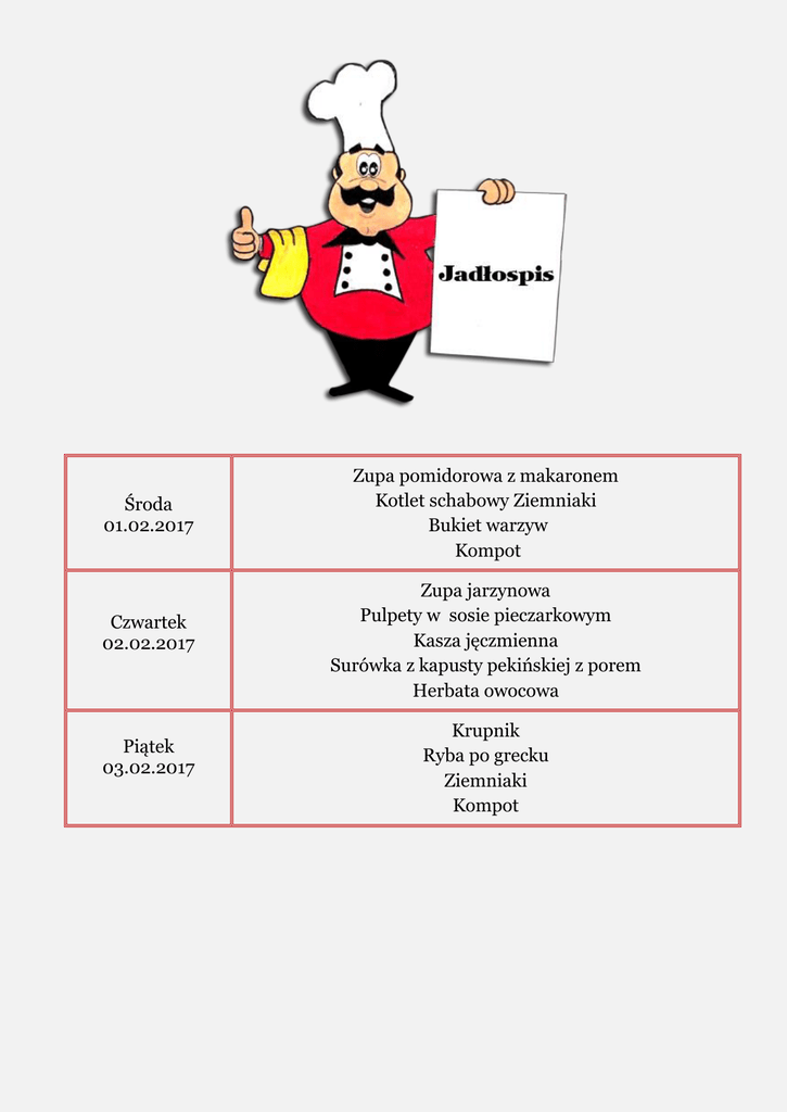 Środa 01.02.2017 Zupa pomidorowa z makaronem Kotlet schabowy Ziemniaki Bukiet warzyw Kompot Czwartek 02.02.2017 Zupa jarzynowa Pulpety w sosie pieczarkowym Kasza jęczmienna Surówka z kapusty pekińskiej z porem Herbata owocowa Piątek 03.02.2017 Krupnik Ryba po grecku Ziemniaki Kompot Poniedziałek 06.02.2017 Zupa brokułowa Spaghetti z serem Herbata owocowa Wtorek 07.02.2017 Zupa serowa Udko pieczone Ziemniaki Marchewka mini Kompot Środa 08.02.2017 Zupa kalafiorowa Gołąbki Ziemniaki Herbata owocowa Czwartek 09.02.2017 Piątek 10.02.2017 Kapuśniak Kotlet mielony drobiowy Ziemniaki Mizeria kompot Zupa pieczarkowa Ryba smażona Ziemniaki Surówka z kiszonej kapusty Herbata owocowa Poniedziałek 27.02.2017 Rosół Potrawka chińska Ryż Kompot Wtorek 28.02.2017 Barszcz ukraiński Gulasz wołowy Kluski śląskie Surówka z ogórków Herbata owocowa