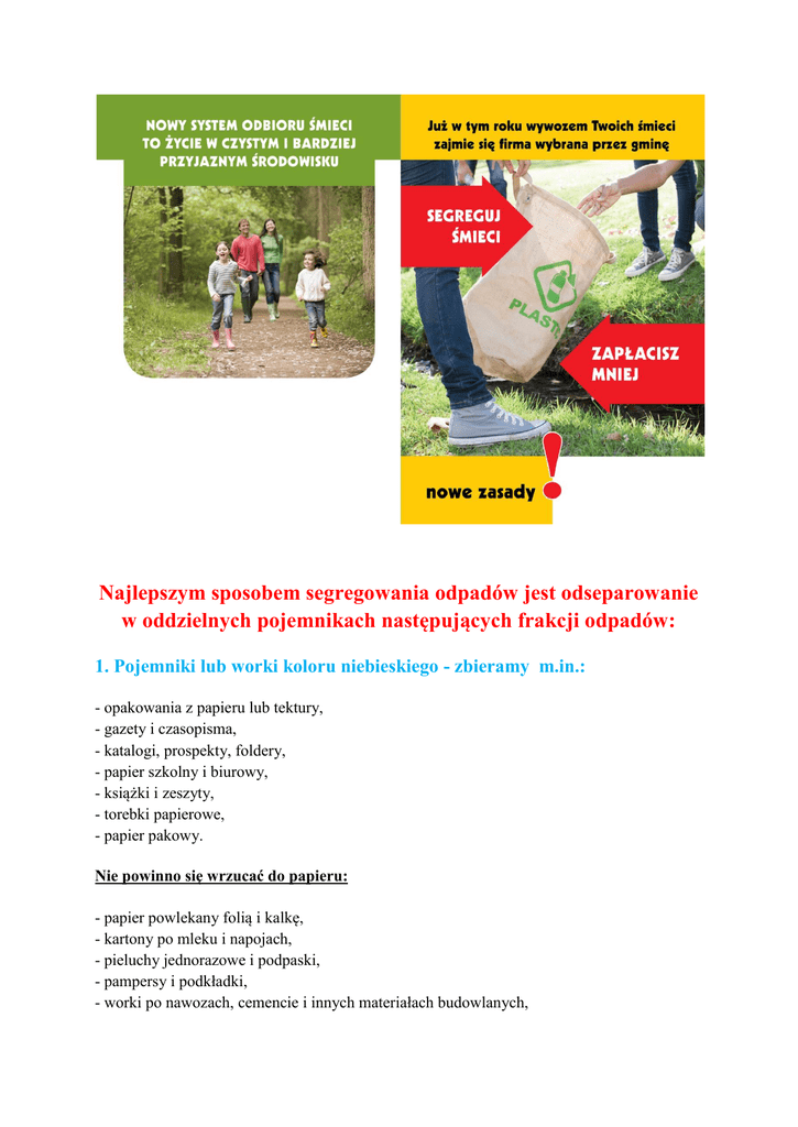 Najlepszym sposobem segregowania odpadów jest odseparowanie w oddzielnych pojemnikach następujących frakcji odpadów: 1. Pojemniki lub worki koloru niebieskiego - zbieramy m.in.: - opakowania z papieru lub tektury, - gazety i czasopisma, - katalogi, prospekty, foldery, - papier szkolny i biurowy, - książki i zeszyty, - torebki papierowe, - papier pakowy. Nie powinno się wrzucać do papieru: - papier powlekany folią i kalkę, - kartony po mleku i napojach, - pieluchy jednorazowe i podpaski, - pampersy i podkładki, - worki po nawozach, cemencie i innych materiałach budowlanych, - tapety, - inne odpady komunalne (w tym niebezpieczne). 2. Pojemniki lub worki koloru żółtego - zbieramy tworzywa sztuczne i metale oraz m.in.: - butelki po napojach, - opakowania po chemii gospodarczej, kosmetykach (np. szamponach, proszkach, płynach do mycia naczyń itp.), - opakowania po produktach spożywczych, - plastikowe zakrętki, - plastikowe torebki, worki, reklamówki i inne folie, - plastikowe koszyczki po owocach i innych produktach, - puszki po napojach, sokach, - puszki z blachy stalowej po żywności (konserwy), - złom żelazny i metale kolorowe, - metalowe kapsle z butelek, zakrętki słoików i innych pojemników, - folia aluminiowa, Nie powinno się wrzucać do tworzyw sztucznych i metali: - Strzykawki, wenflony i inne artykuły medyczne, - odpady budowlane i rozbiórkowe, - nie opróżnione opakowania po lekach i farbach, lakierach i olejach, - zużyte baterie i akumulatory, - zużyty sprzęt elektryczny i elektroniczny, - inne odpady komunalne (w tym niebezpieczne). Zaleca się zgnieść tworzywa sztuczne przed wrzuceniem do worka. 3. Pojemniki lub worki koloru zielonego- zbieramy szkło opakowaniowe oraz m.in.: - butelki i słoiki szklane po napojach i żywności, - butelki po napojach alkoholowych, - szklane opakowania po kosmetykach, - kartoniki po mleku i napojach - wielomateriałowe odpady opakowaniowe. Nie powinno się wrzucać do szkła: - szkło stołowe - żaroodporne, - ceramika, doniczki, - znicze z zawartością wosku, - żarówki i świetlówki, - szkło kryształowe, - reflektory, - nie opróżnione opakowania po lekach, olejach, rozpuszczalnikach, - termometry i strzykawki, - monitory i lampy telewizyjne, - szyby okienne i zbrojone, - szyby samochodowe, - lustra i witraże, - fajans i porcelana, - inne odpady komunalne (w tym niebezpieczne). WAŻNE! Zaleca się wrzucać opakowania opróżnione z produktu, bez zakrętek, starać się nie tłuc szkła. 4. Pojemniki lub worki koloru brązowego -zbieramy odpady „zielone" roślinne oraz m.in.: - drobne gałęzie drzew i krzewów, - liście, kwiaty i skoszona trawa, - trociny i kora drzew, - owoce, warzywa itp. Nie powinno się wrzucać do odpadów „zielonych" - roślinnych: - kości zwierząt, - mięso i padlina zwierząt, - olej jadalny, - drewno impregnowane, - płyty wiórowe i MDF, - leki, - odchody zwierząt, - popiół z węgla kamiennego, - inne odpady komunalne (w tym niebezpieczne). Pozostałe odpady trafią do pojemnika na odpady zmieszane. Odpadami komunalnymi, które mogą być przekazywane do punktu są: - odpady poremontowe i budowlane, - odpady wielkogabarytowe (tj. meble, wyposażenie wnętrz, itp.), - zużyty sprzęt elektryczny i elektroniczny (pralki, lodówki, telewizory, radioodbiorniki, komputery, kalkulatory, itp.), -zużyte baterie i akumulatory, - przeterminowane lekarstwa, strzykawki itp., - opony, - odpady niebezpieczne z gospodarstw domowych (pozostałości farb, lakierów, rozpuszczalników, kwasów, olejów, płynów do chłodnic, itp.). Pamiętaj ! Przed włożeniem segregowanych śmieci do worka lub pojemnika należy zgnieść opakowanie plastikowe, by zajmowały jak najmniej miejsca oraz odkręcić od opakowań zakrętki, pokrywki. Odpady należy także opróżnić z resztek produktu lub jedzenia.