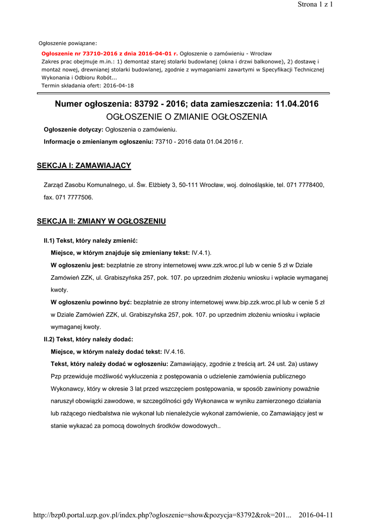 Strona 1 z 1 Ogłoszenie powiązane: Ogłoszenie nr 73710-2016 z dnia 2016-04-01 r. Ogłoszenie o zamówieniu - Wrocław Zakres prac obejmuje m.in.: 1) demontaż starej stolarki budowlanej (okna i drzwi balkonowe), 2) dostawę i montaż nowej, drewnianej stolarki budowlanej, zgodnie z wymaganiami zawartymi w Specyfikacji Technicznej Wykonania i Odbioru Robót... Termin składania ofert: 2016-04-18 Numer ogłoszenia: 83792 - 2016; data zamieszczenia: 11.04.2016 OGŁOSZENIE O ZMIANIE OGŁOSZENIA Ogłoszenie dotyczy: Ogłoszenia o zamówieniu. Informacje o zmienianym ogłoszeniu: 73710 - 2016 data 01.04.2016 r. SEKCJA I: ZAMAWIAJĄCY Zarząd Zasobu Komunalnego, ul. Św. Elżbiety 3, 50-111 Wrocław, woj. dolnośląskie, tel. 071 7778400, fax. 071 7777506. SEKCJA II: ZMIANY W OGŁOSZENIU II.1) Tekst, który należy zmienić: Miejsce, w którym znajduje się zmieniany tekst: IV.4.1). W ogłoszeniu jest: bezpłatnie ze strony internetowej www.zzk.wroc.pl lub w cenie 5 zł w Dziale Zamówień ZZK, ul. Grabiszyńska 257, pok. 107. po uprzednim złożeniu wniosku i wpłacie wymaganej kwoty. W ogłoszeniu powinno być: bezpłatnie ze strony internetowej www.bip.zzk.wroc.pl lub w cenie 5 zł w Dziale Zamówień ZZK, ul. Grabiszyńska 257, pok. 107. po uprzednim złożeniu wniosku i wpłacie wymaganej kwoty. II.2) Tekst, który należy dodać: Miejsce, w którym należy dodać tekst: IV.4.16. Tekst, który należy dodać w ogłoszeniu: Zamawiający, zgodnie z treścią art. 24 ust. 2a) ustawy Pzp przewiduje możliwość wykluczenia z postępowania o udzielenie zamówienia publicznego Wykonawcy, który w okresie 3 lat przed wszczęciem postępowania, w sposób zawiniony poważnie naruszył obowiązki zawodowe, w szczególności gdy Wykonawca w wyniku zamierzonego działania lub rażącego niedbalstwa nie wykonał lub nienależycie wykonał zamówienie, co Zamawiający jest w stanie wykazać za pomocą dowolnych środków dowodowych.. http://bzp0.portal.uzp.gov.pl/index.php?ogloszenie=show&pozycja=83792&rok=201... 2016-04-11